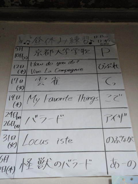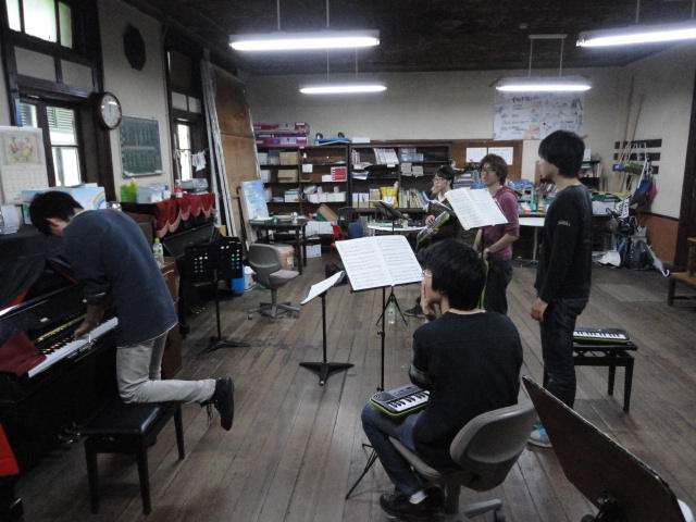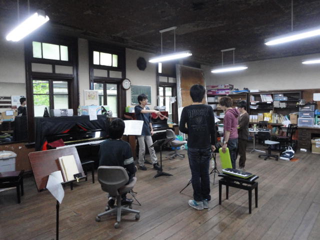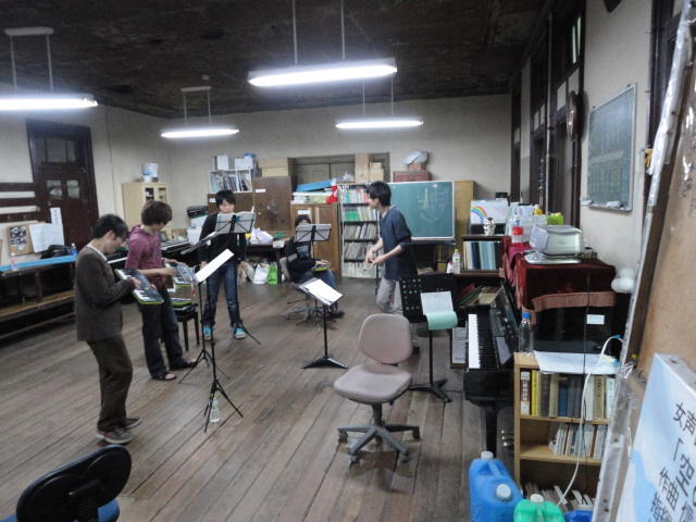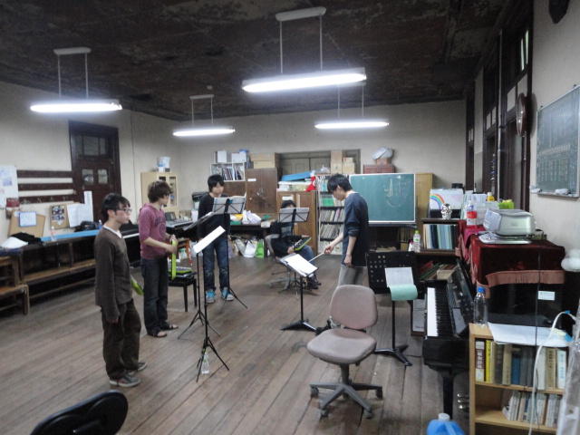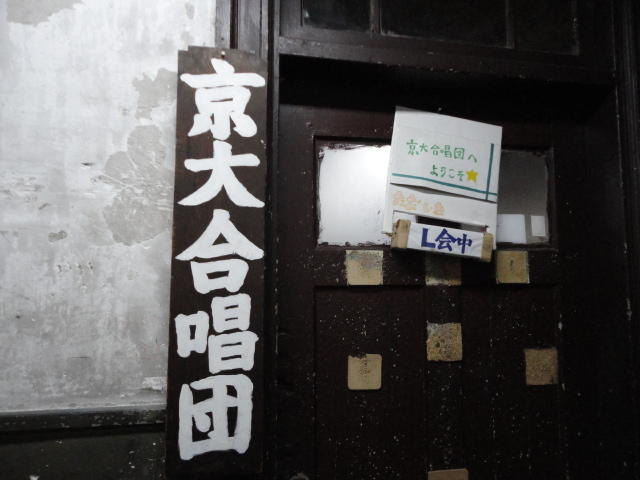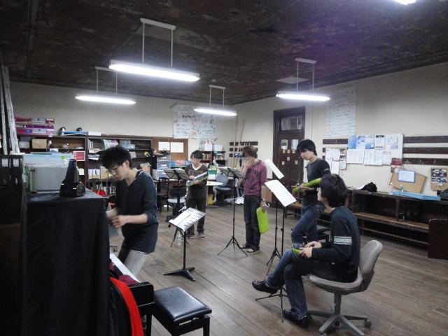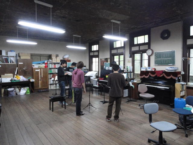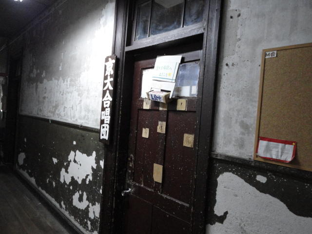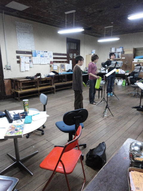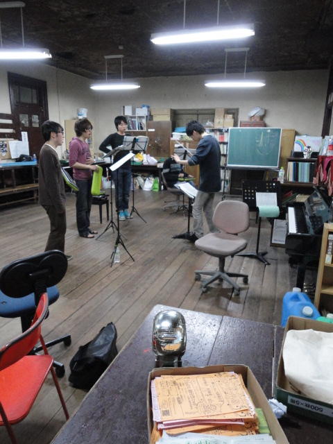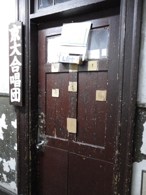 ちょうどBoxでは「男声リーダー会議」(男声指揮者とTop/Second/Bariton/Bassのパトリで、新曲の音とりとか練習の準備を行うこと)を していました。ナツカシス(^_^)。 混声・女声・男声の3形態で80年の歴史を持つこの合唱団の、僕は50回定演奏会の男声指揮者でした。 ドアを開けて入り、「OBですが、ちょっと覗かせて下さい」と断って、リーダー会議の模様と、 30年たってもまったく変わっていないBoxの写真を撮りました。 練習場はこの2階ですが、ダンス部も練習する振動で天井の塗装はパラパラと落ち続け、ほとんど天井の塗装が無くなっていました。