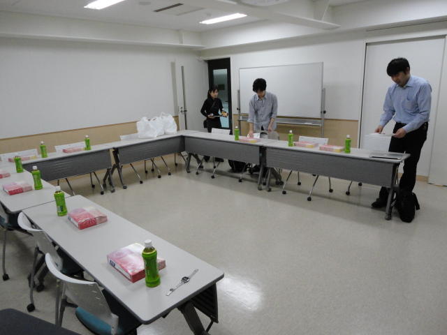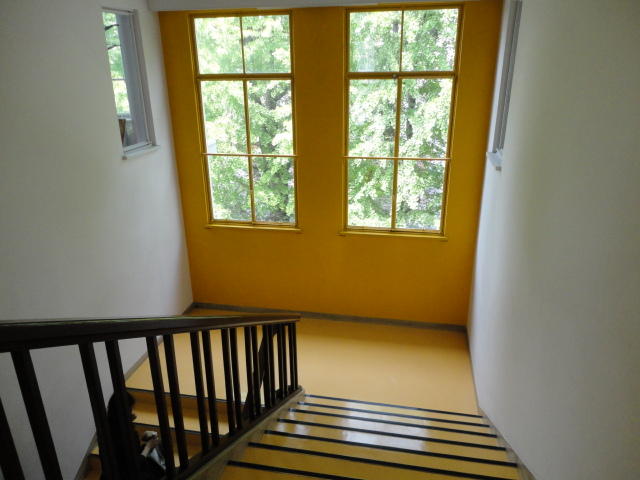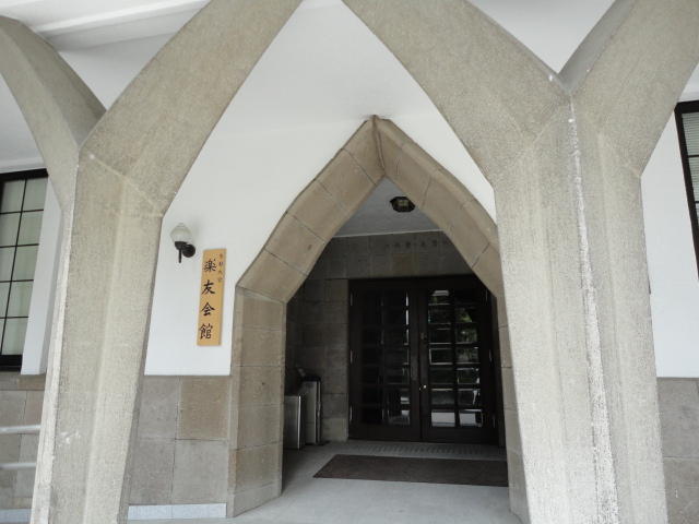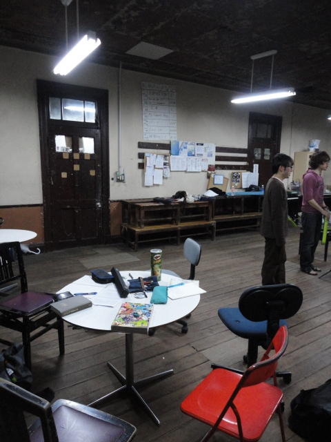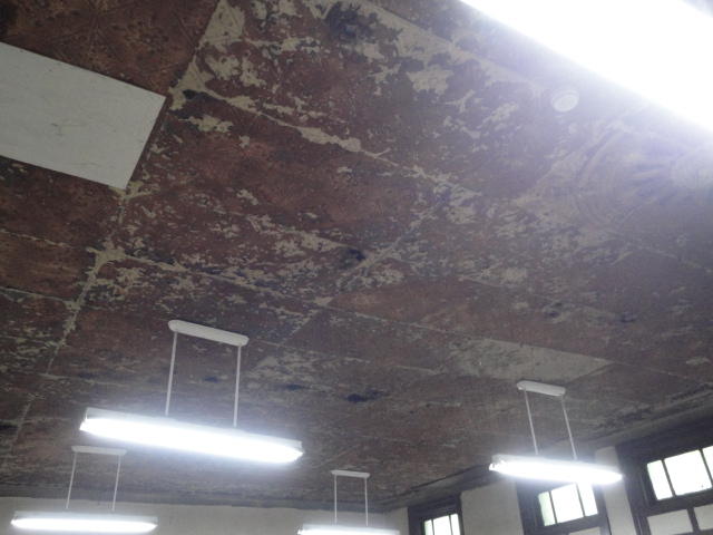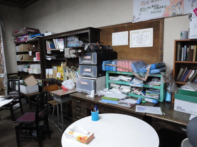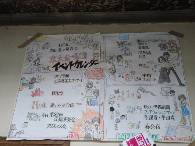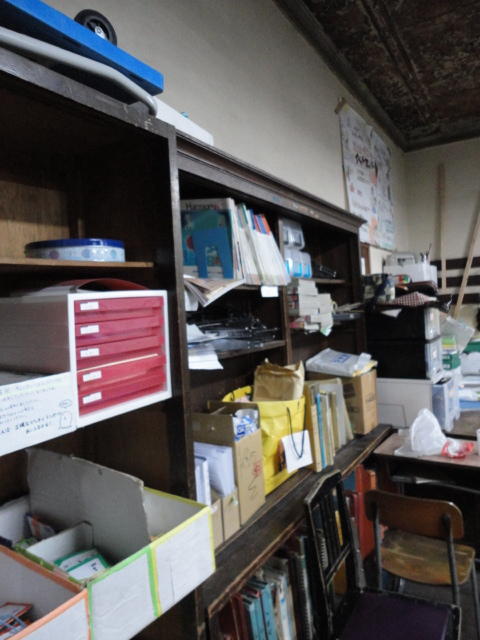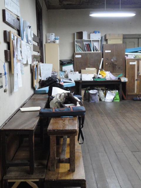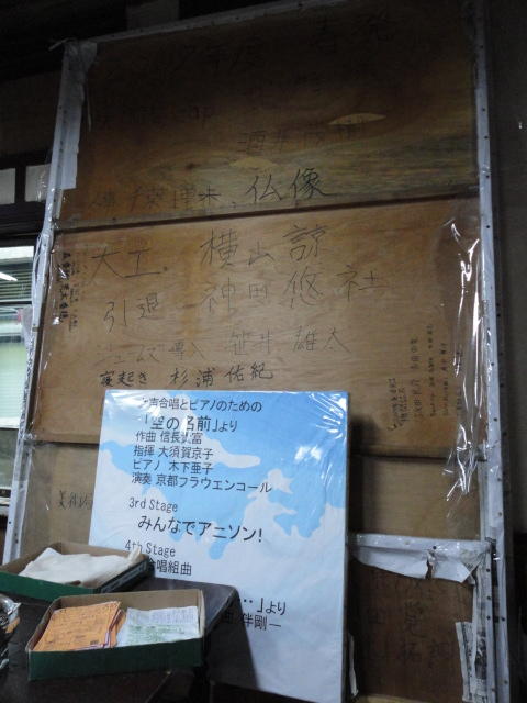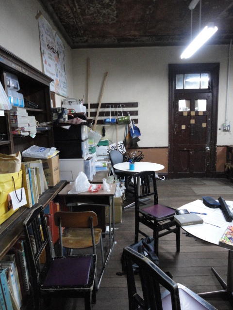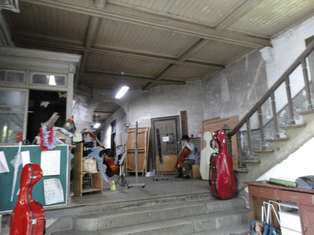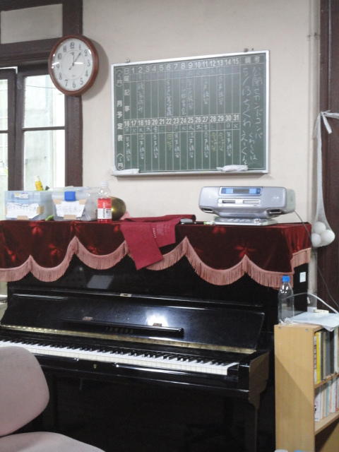 ちょうどBoxでは「男声リーダー会議」(男声指揮者とTop/Second/Bariton/Bassのパトリで、新曲の音とりとか練習の準備を行うこと)を していました。ナツカシス(^_^)。 混声・女声・男声の3形態で80年の歴史を持つこの合唱団の、僕は50回定演奏会の男声指揮者でした。 ドアを開けて入り、「OBですが、ちょっと覗かせて下さい」と断って、リーダー会議の模様と、 30年たってもまったく変わっていないBoxの写真を撮りました。 練習場はこの2階ですが、ダンス部も練習する振動で天井の塗装はパラパラと落ち続け、ほとんど天井の塗装が無くなっていました。