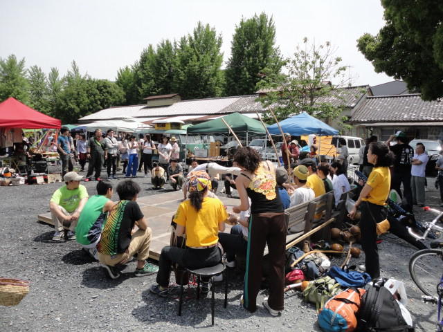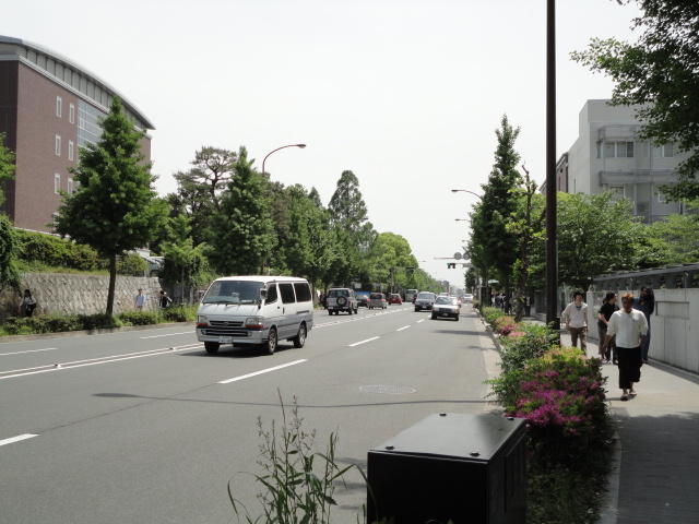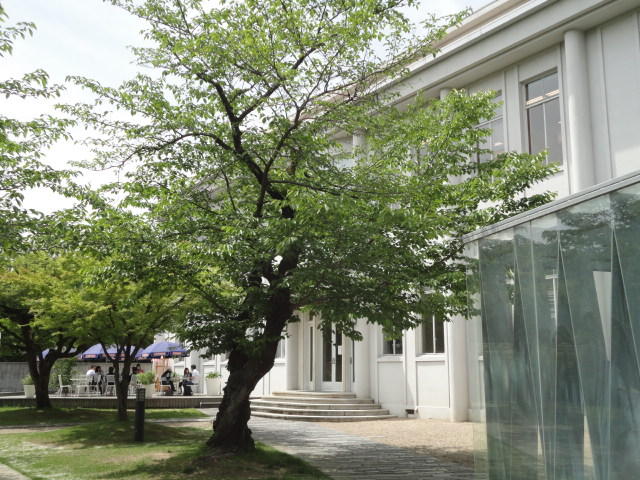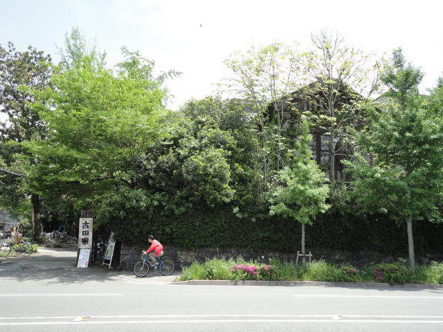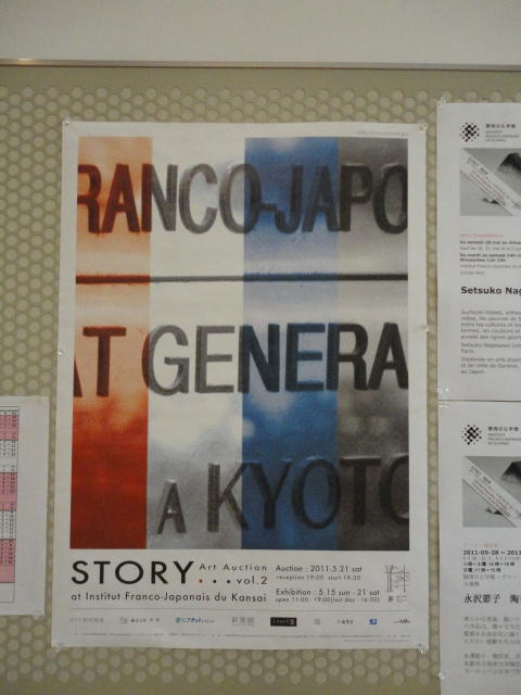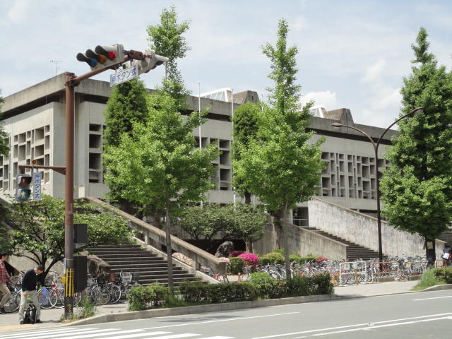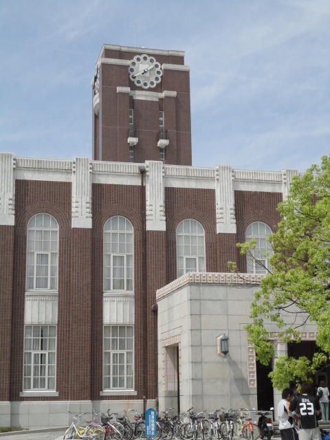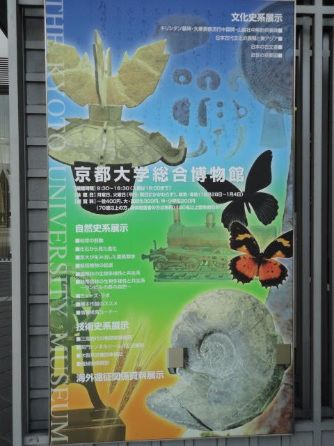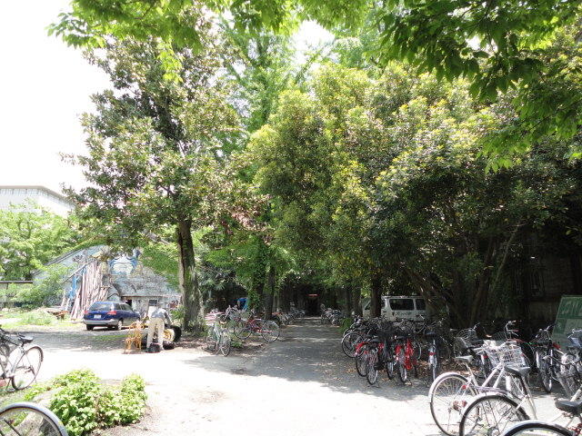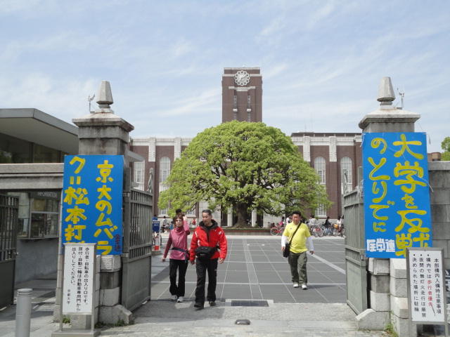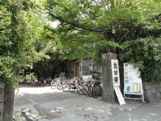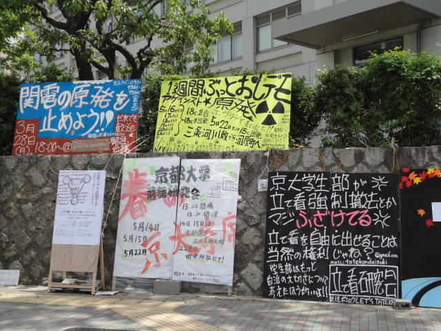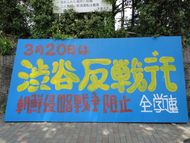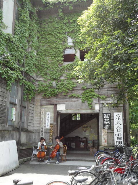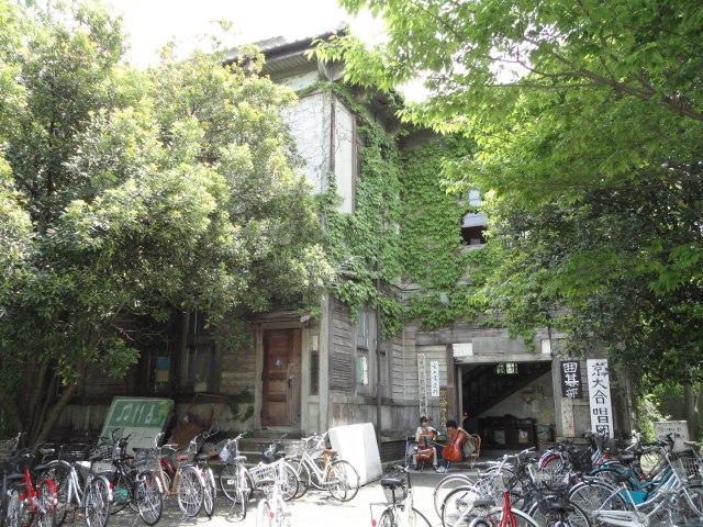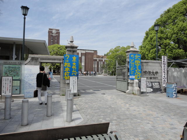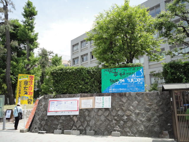 1時間ほどで全てが過ぎ去ったので、一休みして、御所から出町を経由して再び京大に向かいました。 実はこの日は、「若手芸術家の作品のオークション」という企画の内覧会初日で、実習指導の嶋田さんの作品が展示されているということで、 それを見に、京大の向かいにある日仏会館に行ったのです。 西部講堂の前は、昔と変わらず無法地帯でした。