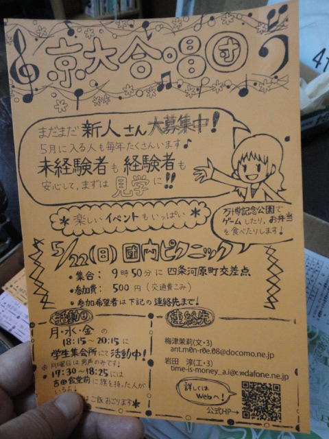4月上旬の入学式までに7つのサークルに入っていました。京大軽音は1回生の夏から3回生の冬までのブランクがあり、フォークサークル"Zet's"は我々新入生を歓迎するコンサートにいきなり出演して4ヶ月で「やり尽くして」退部、バロックサークル「いびつな真珠」は数回だけで退部、現代数学研究会は2回程度で退散、11月祭(京大の学園祭)実行委員会は2ヶ月程度で脱退、生協組織部は1ヶ月ほどで退散したので、4年間ずっと続けたのは京大合唱団だけでした。楽譜の読み方から覚えて1回生の夏から始めた合唱曲の作曲は在学中に約100曲、2回生の夏には作品が入選して初めての海外旅行(ホームステイ)をゲットしてました。