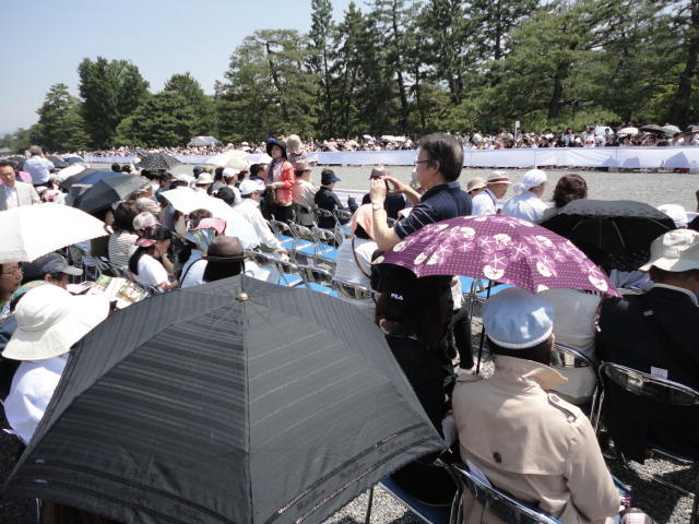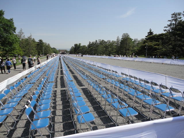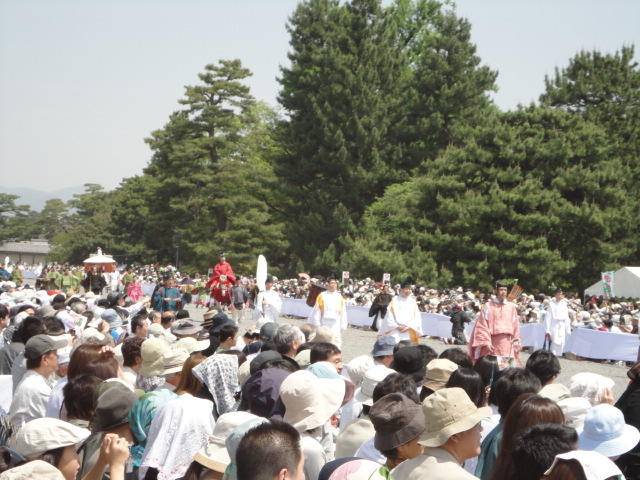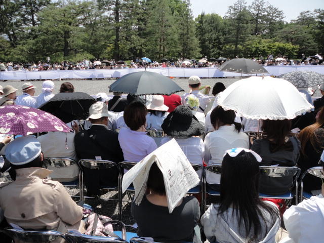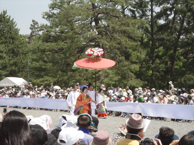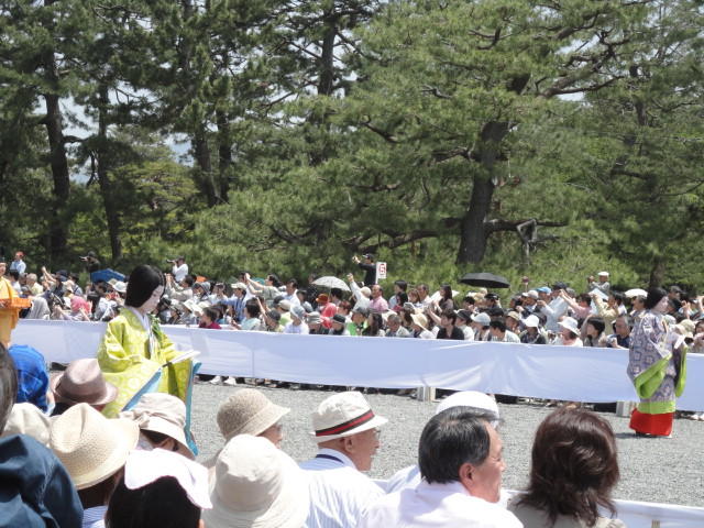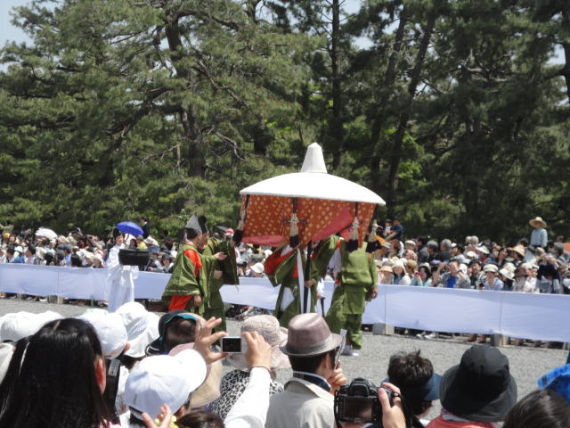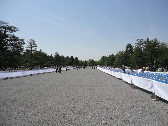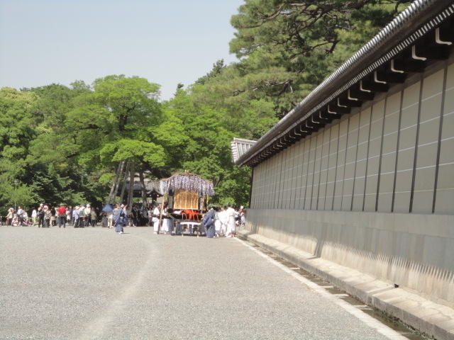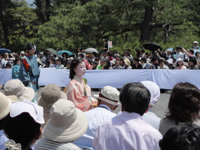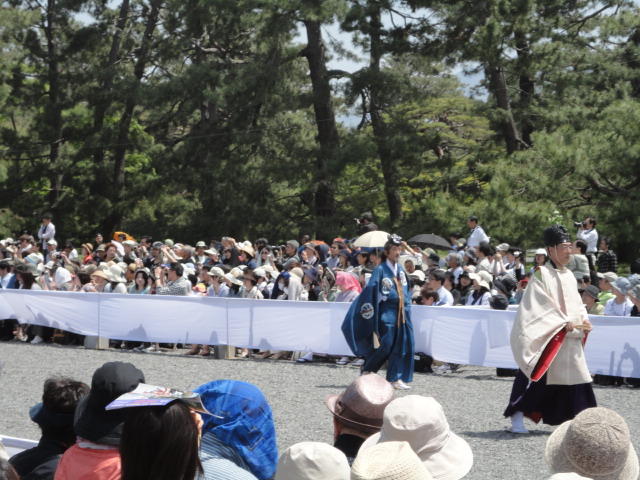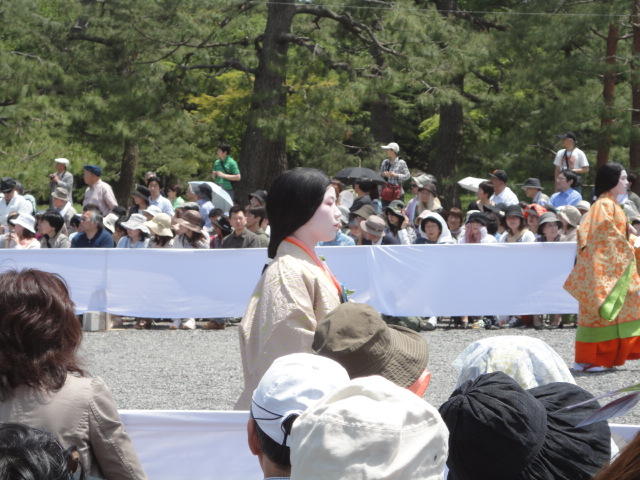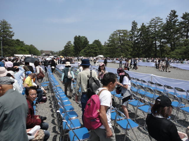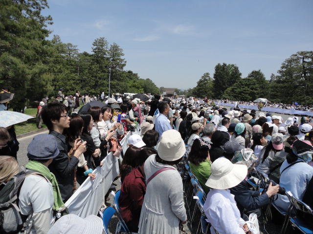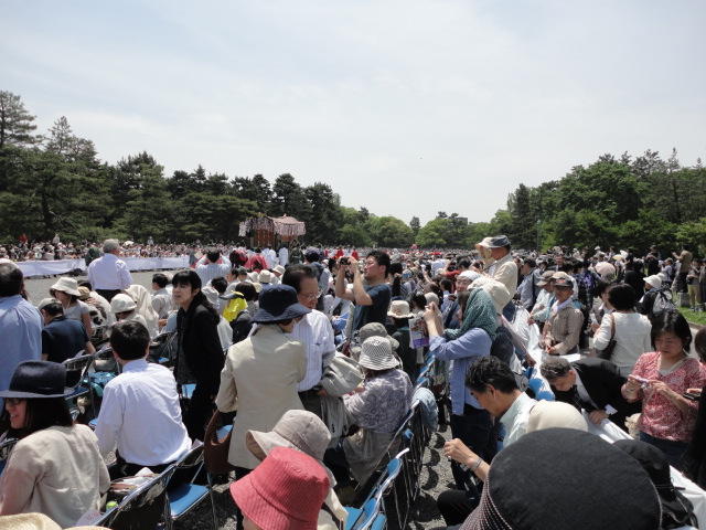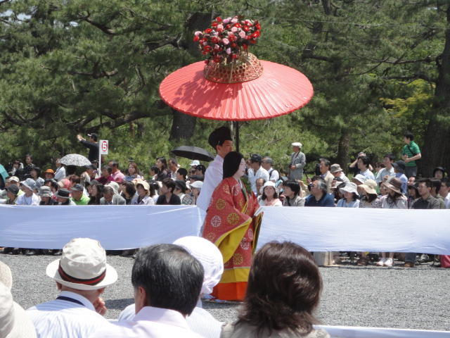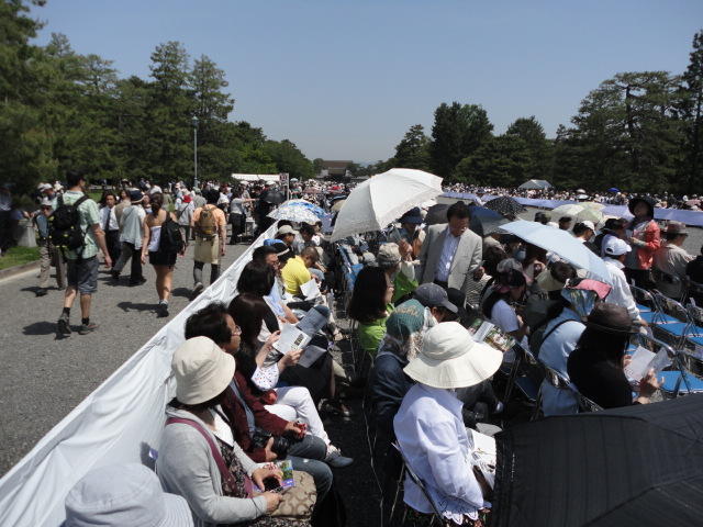 いよいよ3日目、葵祭の当日となりました。抜けるような好天に強い日差しで日焼けしました。 去年、初めて見た時代祭の観覧席はガラガラでしたが、この京都御所の観覧席は完売で満席でした。 ちなみに下鴨神社の観覧席は、ネットで申し込みしようとした時点で既に完売でした。(^_^;)