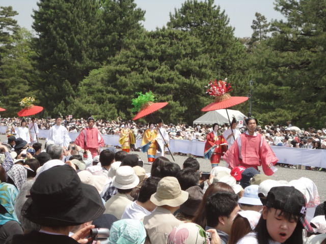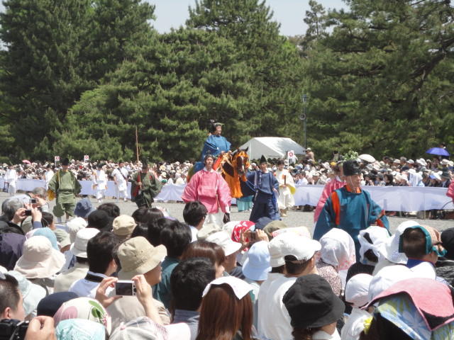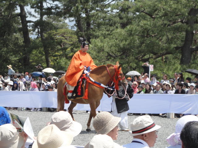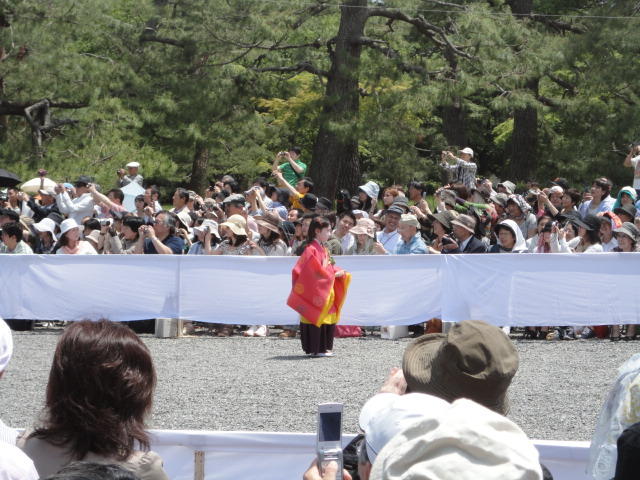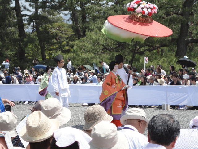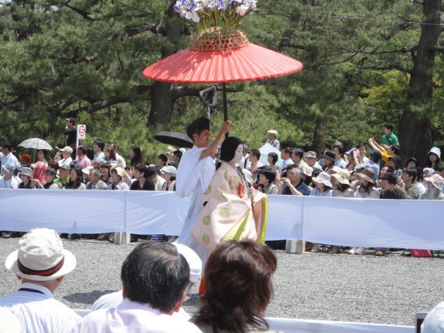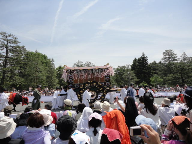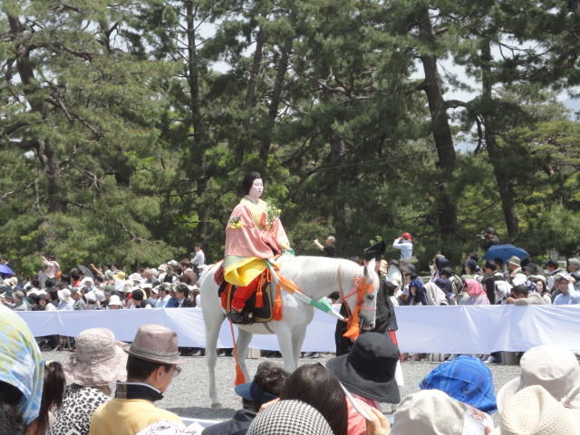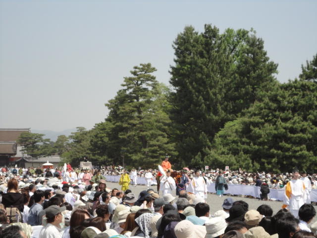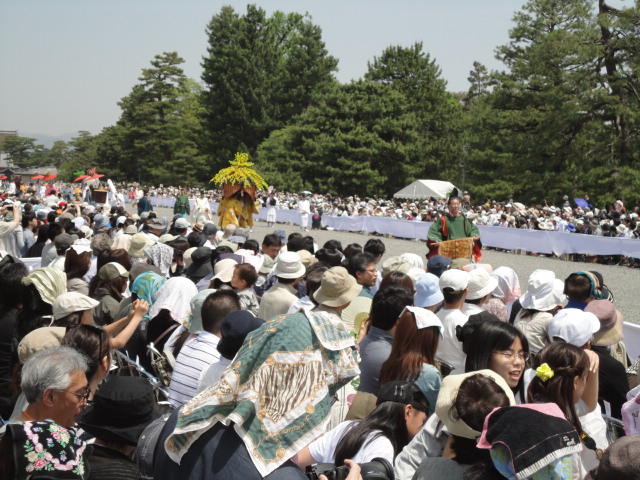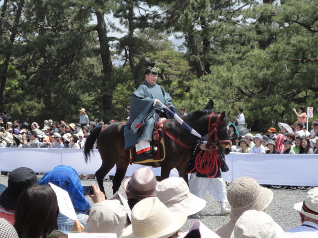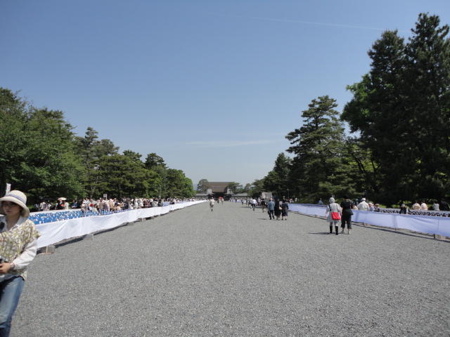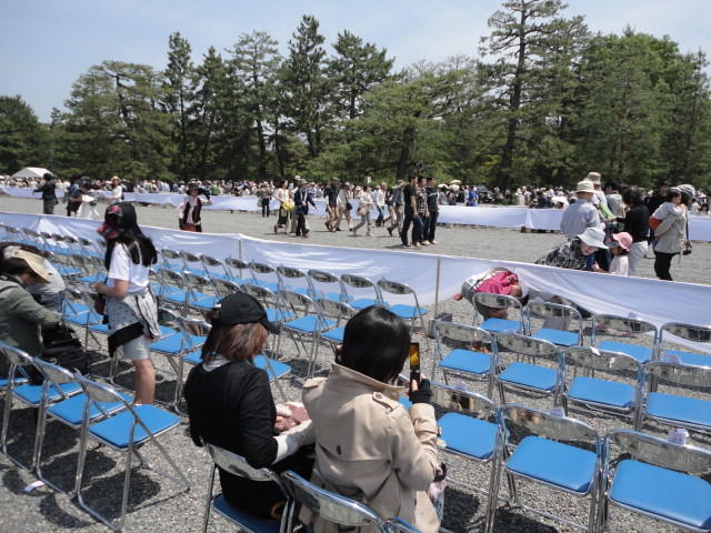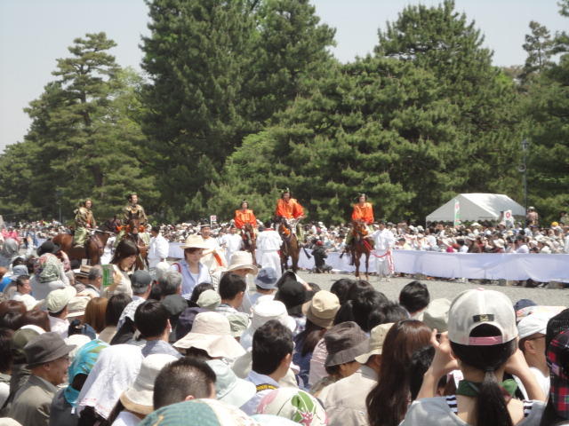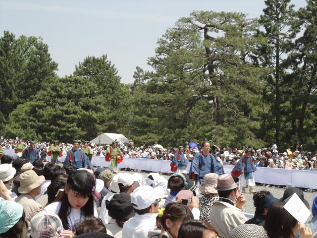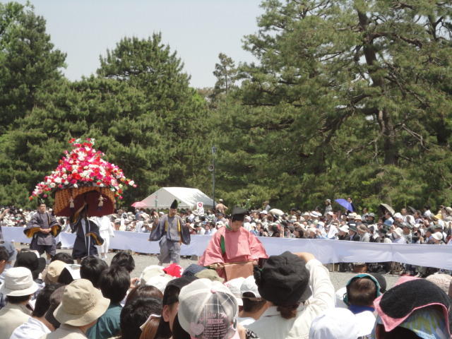 いよいよ3日目、葵祭の当日となりました。抜けるような好天に強い日差しで日焼けしました。 去年、初めて見た時代祭の観覧席はガラガラでしたが、この京都御所の観覧席は完売で満席でした。 ちなみに下鴨神社の観覧席は、ネットで申し込みしようとした時点で既に完売でした。(^_^;)