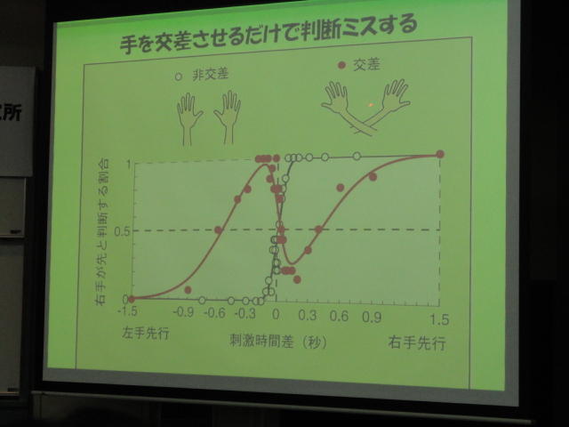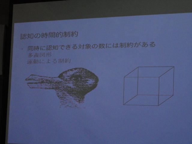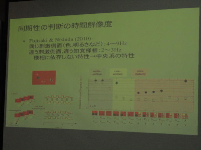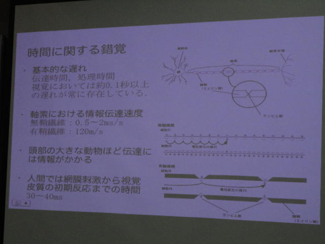 ●辻先生の記念講演 時間学の考え方 - MEM(S) model 動き(movement) 出来事(event) 意味付け(meaning) 同期化(synchronization) 時間の種類 自然の時間 生物の時間 人間の時間 社会の時間 文化の時間 この両者のマトリクスで考える →文化的時間*同期化=創造・発明 ●一般講演(1) 暦のお話・風水のお話は勘弁(^_^;) 概日リズムと照明 - 面白い 眠りにつく時間帯の照明は問題アリ ●一川氏の特別講演 時間の長さ、順序、同時性 能動的操作と知覚の時間特性 時間の中で体験はどのように変化するのか? 順応、慣れ 価値の変化 記憶 実験心理学 心理物理学(精神物理学)的測定 物理的刺激特性 → 人間の体験(知覚・認知・記憶) 心理物理学 : 知覚の一般的法則 フェヒナーの法則 刺激が大きくなると差が判りにくくなる スティーブンスの法則 刺激量と知覚量の関係が両対数だと直線 時間に関した錯覚 基本的な遅れ latency 時間の長さ、同時性、時間順序 物理的刺激と知覚認知された内容との不一致 人間の知覚認知の特性 環境への適応 - 世界の全環境を体験しているわけではない 生存に必要な判断できる種が生き残る 地球の重力環境への適応 遅過ぎても早過ぎても近くできない 適応に関係のない環境特性は知覚できない 同時に認知できる対象の数は限られる 時間に関する錯覚研究からわかること 規則性→進化の過程 : 適応戦略 潜在的危険性の予測と回避 人間そのものの理解 実験心理学から判ってきていること 同時性の判断の時間分解能 同じ刺激だと 4-9Hz 違う刺激だと 2-3Hz フラッシュラグ効果 ゆっくり動いている刺激と突然の刺激とは同時に感じられない フラッシュ(突然)刺激は遅れて知覚される 受動的実験だと大きく、能動的実験だと小さくなる 思い込み能動的実験でも小さくなる 強い刺激ほど早く処理される 注意をひく(事前に提示)場所の処理が早く行われる タイミングがずれた視聴覚刺激は2-3分もすると同時になる 練習・学習の「慣れ」の効果 → 順応 人間の認知の特性 遠い未来のことは軽くなる 近い未来は重視される