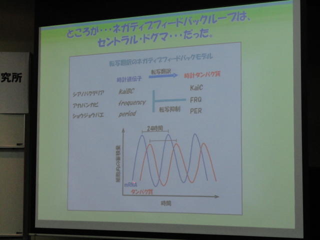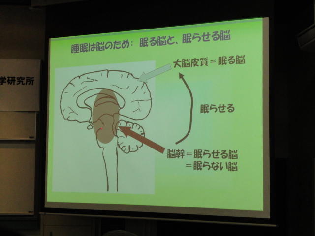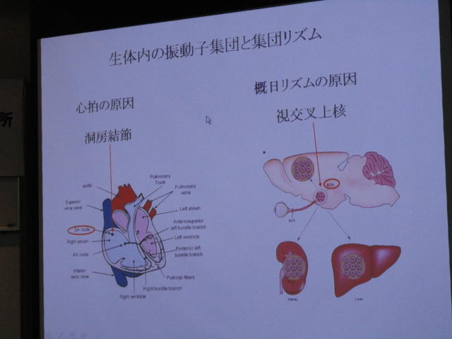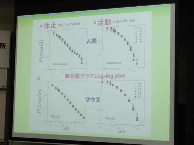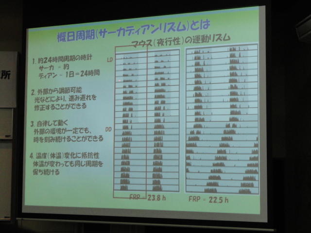 ●粂氏の特別講演 時間生物学 ニューロエシックス 脳神経倫理学 感覚が意識化されるまでに300-500msecもかかる 両手を触られる感覚は腕を交叉させると混乱する 生物にとっての時間の意味は 長さの計測 タイマー 順序の決定 プログラム 同時性判定 ラッチ回路 時刻の情報 時計 季節の情報 カレンダー 生物時計 概日周期(サーカディアンリズム) サーカ 約 ディアン 1日(24時間) 時刻を知る 季節を知る(日照時間) 方角を知る 羅針盤 脳幹視床下部○○交叉 にある SCN 生物時計を構成するSCNの個々の神経細胞も概日周期を持つ 止まる時間 睡眠 ※脳の機能の一つ 冬眠 休眠 眠るのは大脳皮質、脳幹は眠らない イルカは脳の半分ずつ眠る 冬眠と増井は睡眠ではない 不眠ショウジョウバエ(ミュータント) ドーパミンを回収する部分が不調 ドーパミンが滞留してずっと起きている 覚醒剤の作用はこれと同じ 活動時間と睡眠時間とでは統計的性質が違う ほ乳類でも実験されていた 活動分布 対数分布 休眠分布 べき乗分布