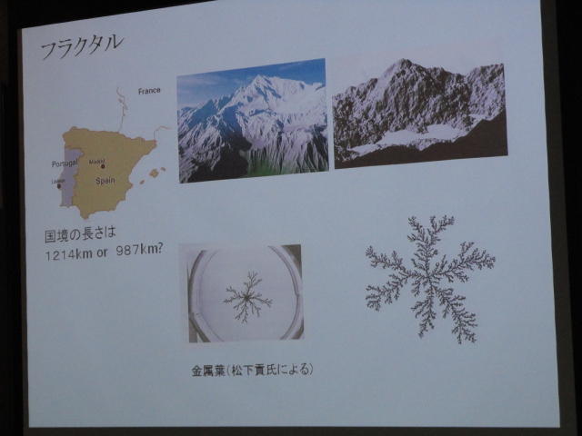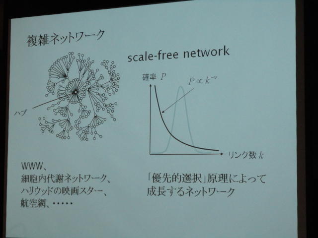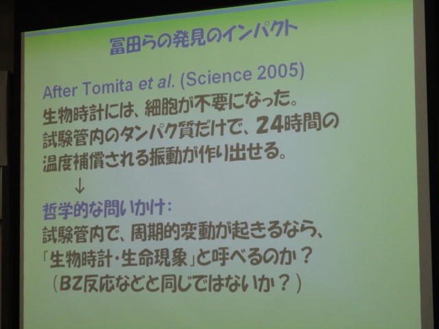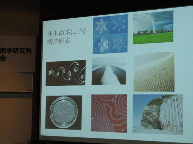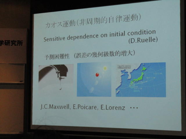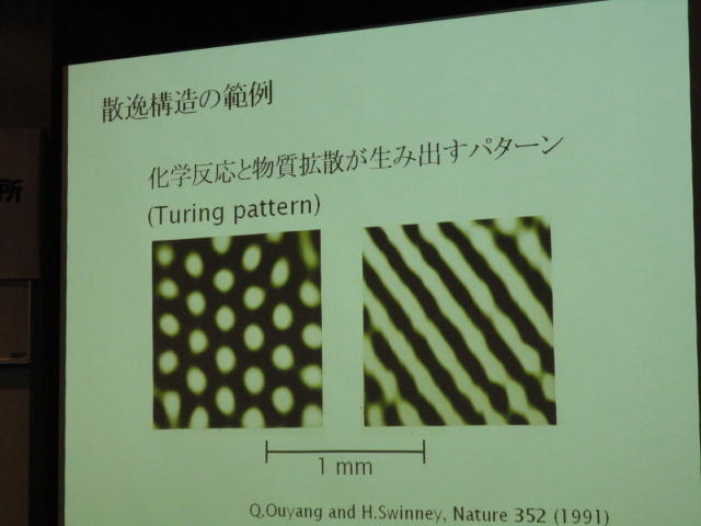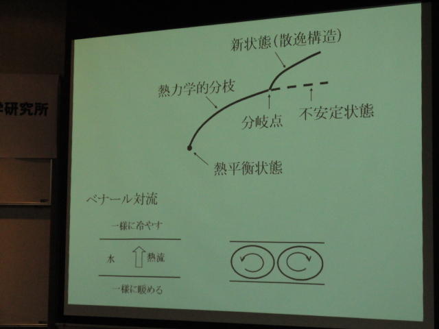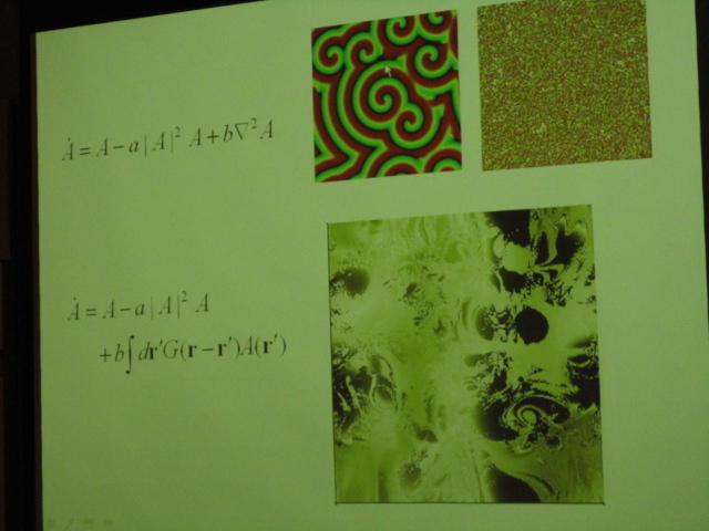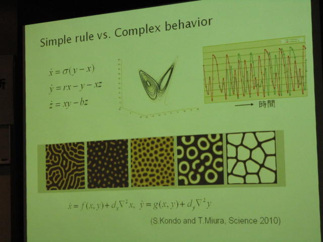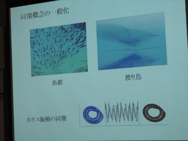 ●柏端氏の特別講演 哲学 「時間的なもの」のもつ3つの特徴 順序 非対称性 動性 価値づけの非対称性 「価値」ってのはよく判らない・・・ 感じ方に還元できないか 可能性の未来への分岐を是って胃にしていないか 価値゛けの時間的非対称性はそれ自体「よい」ものなのか 未来へのバイアス・近い未来へのバイアス 人間はいろいろ知ってしまっている 確率論という合理性も知ってしまっているので価値の意味付けが変わっている ●パネルディスカッション 24時間周期を持つタンパク質は淘汰の結果では? 自転周期が15時間の惑星上の生物を構成するタンパク質はたぶん15時間 生理的指標と内観的情報との関係はまだ発展途上 実験心理学→パイオニアに参考にできないか ●蔵本先生の特別講演 非線形科学 = 非線形動力学 Nonlinear Dynamics 時間とは流れるものなのか ※自由 堀口大学 待つ間の長さ 逢ふ間の短さ 時のお腹は蛇腹です 時間の矢 = エントロピー増大の法則 時間には方向性がある 動→静 構造→無構造 世界から限りなく秩序が失われ「熱的死」にいたる(ボルツマン) 不可逆過程 自然現象にたくさんある造形美 Classical thermodynamics is essentially a theory of "destruction of nature". ... such a theory has to be completed by a theory of "creation of nature". 非平衡開放系 入力は低エントロピー 代謝過程(エントロビー生成) ※生物はまさにコレ 出力は高エントロビー 散逸構造(Dissipative Structures) 非線形システムの特徴 創発性(要素間の関係性から生じる) emergence Simple rule が Complex behavior を有無 流れの中に置かれると動き(周期運動)が始まる ししおどし リズムが生まれる リズム現象の発展(平衡から離して行くと) 逐次分岐 → カオス カオス運動(非周期自律運動) Sensitive dependance on initial condition 予測困難性(誤差の幾何級数的増大) 同期現象 揺れる台の上に乗せたメトロノーム(別テンポ)が揃う リズムを刻むものを相互作用させると起きる 生体内の振動子集団と集団リズム 心拍 洞房結節 概日リズム 視交叉上核 同期概念の一般化 カオス振動の同期 ★ 非線形科学の他のトピック フラクタル 複雑ネットワーク ★ scale-free network 「優先的選択」原理によって成長するネットワーク 非線形科学の応用領域には限りがない 複雑系を理解するには定量的でなく定性的に攻める 特異点に注目というのは重要 トポロジーの考え方と同じ 定性的な類似点の理解にはトポロジーが重要