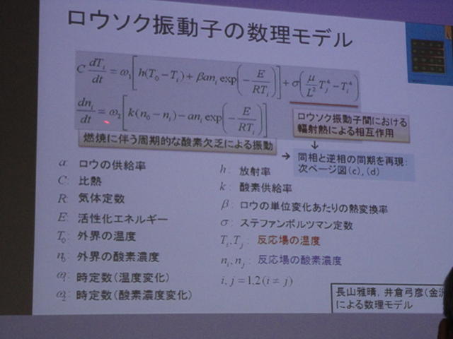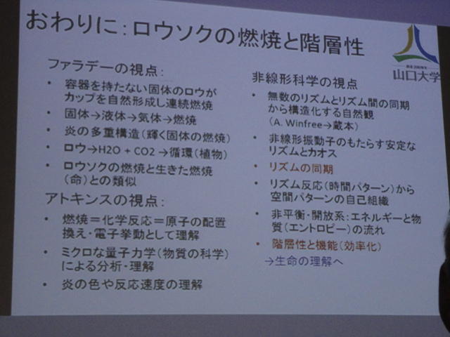 ●一般講演(2) 自己認知と時間意識の関係性 2つの仮説 自己認知は時間意識に従属する 自己認知と時間意識は独立 視覚と体性感覚との時間的不一致→自己身体認知は阻害される 遅延自己顔の提示 遅延時間が長くなるほど「過去」と意識される 時間の現在性は感覚の不一致でも3秒ほど 皮膚癌の写真は参った(^_^;) 入眠時の照明の色光に関する研究 メラトニンの分泌→安眠 光が分泌抑制の効果→睡眠障害 昼間の実験では駄目(メラトニンが出ない) 抑うつと画像の感情価が主観的に時間評価に及ぼす影響 快・不快の感情が時間感覚に影響する 心理的時間 人間は時間そのものを知覚する特定の感覚器は持っていない 時間意識は大脳の認知過程により形成される 時間知覚 5秒以内 作動記憶が関与 時間評価 5秒以上 長期記憶が関与 予期的時間評価 追想的時間評価 ※記憶の情報量が多いと時間評価が伸びる 感情には2種ある 特性としての感情 状態としての感情 先行研究 不快画像では時間評価が長くなる 「噪」時間評価が短い ←→ 「抑うつ」時間評価が長い 抑うつ者は扁桃体の活動が高い→否定的な感情のノードが慢性的に活性 抑うつ者がいちばん時間評価が正しかった(リアリスト) スクリーニングに使えるのでは Does a Timer Exist in Escherichia coli ? 分子レベルの化学反応にタイマーがある? 概日リズムの起源につながる? ●一般講演(3) AMeDASのデータから太陽光資源の検証・予測 日照時間 日照量 太陽定数(黒点活動) ロウソクの科学 Faradayのロウソクの科学 ★本になっているので読むべし クリスマスの講演会 溶けたロウのカップが何故出来るか 日なたに置くと炎の影が見える 固体が燃えて気体になるのは炭素だけ 燃焼の結果、水が出来る ロウソクの燃焼は生命体と同じ Atkinsのロウソクの科学 ミクロで詳しく ★本になっているので読むべし 量子力学による理解 化学反応の理解にはニュートン力学でなく量子力学が必要 反応の世界 分子・原子でみる炭素の特異性 振動や形が現れる BZ反応 カオスが現れる 光合成 相転移の理論(←統計物理学) 非線形現象としてのロウソクの科学 21世紀は非線形科学でマクロに調べる ダイナミックな現象にはマクロが必要 2本のロウソクは同期する(近いと同相・離すと逆相) 引き込み 非線形振動子としてのロウソク ロウソクの上空に発生した渦が下がってくると引き込みが起きる 高速カメラでないと撮れない