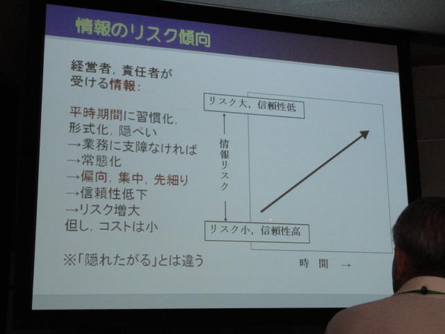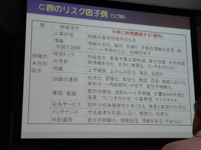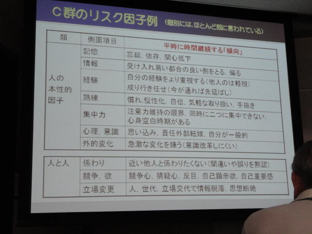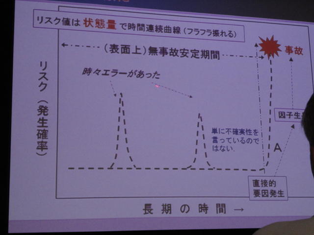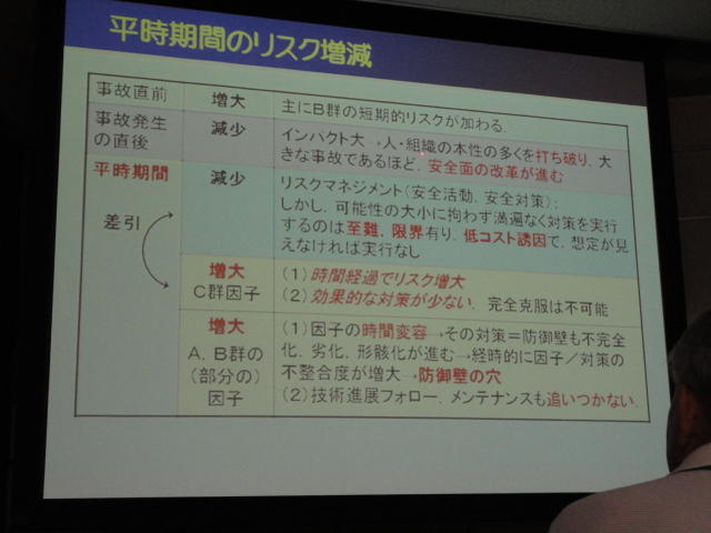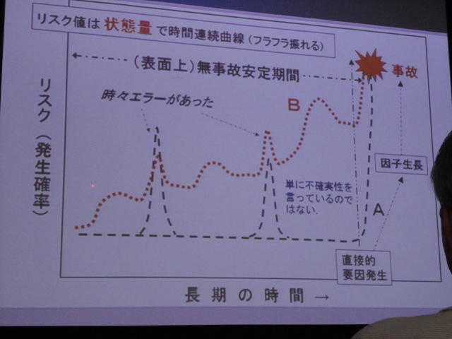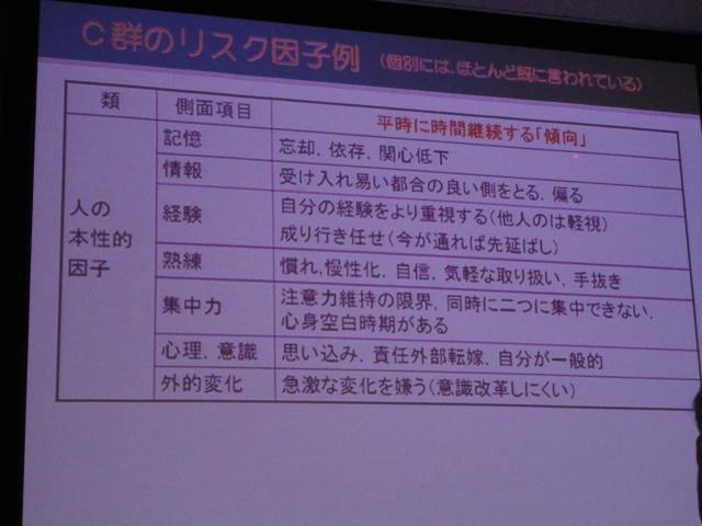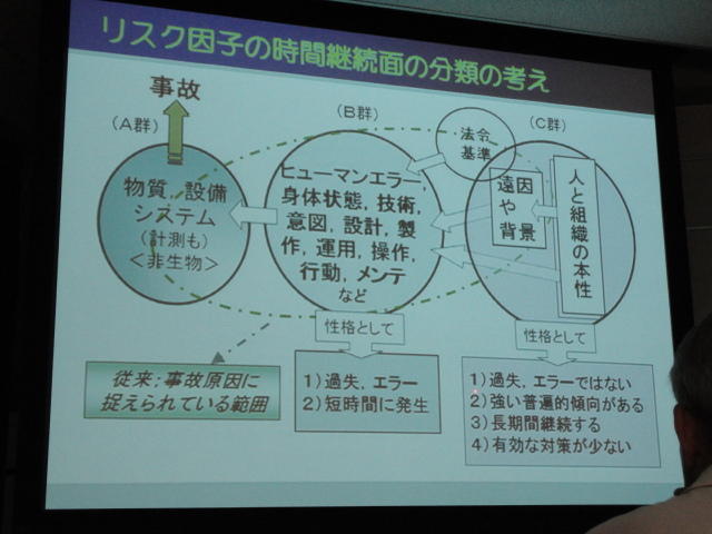 時間増大する人・組織リスク 広義のヒューマンファクターの時間描写 事故発生のリスク 時間継続の面からリスク因子を分類 長い時間経過の中でリスク値はどう変動するか 組織要因→局所的要因→不安全行為→事故の顕在化 人の本性的因子 人と人との関係 組織の本性的因子 安全科学 BCP
