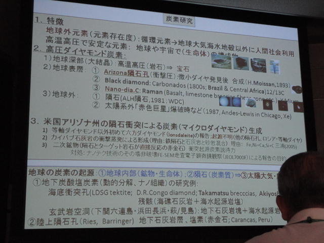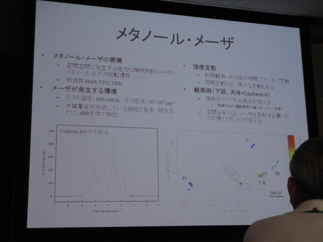 山口における歴史・科学的試料の加速器炭素年代の研究 日本は危機管理 Crisis control ←「想定外」あり 海外はSituation management ←「想定外」ナシ 炭素年代研究の発展 質量分析 誤差10%以上 加速器 高精度で出来るようになった(1%) 隕石衝突 = 宇宙空間で液体が出来る現象 地球外元素 炭素は大事 ! 過去は破壊分析 → 非破壊分析が重要 大質量星形成領域のメタノール・メーザ強度変動におけるタイムラグと空間構造 Cepheus A という星 32m電波望遠鏡でその星からの電波を調べる 時間的変動から空間構造を メタノール・メーザ 宇宙空間である温度・密度のガスで発生 メタノール分子の回転転移 星が生まれるあたりで出る ドップラー効果でそれぞれの雲の速度がわかる VLBIで位置を調べる 200個以上のメタノール・メーザ天体を毎年観測 AU 天文単位(太陽 - 地球) 中心星の変動が等距離の雲を励起すると変化が同期する その変化のピークが11日ぐらいズレている →奥行き方向に11光日ある、と解釈できる 電波望遠鏡は昼間でも小雨でも見える