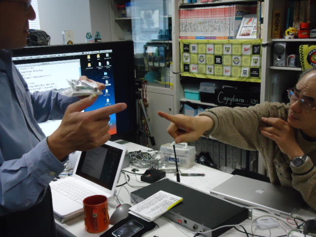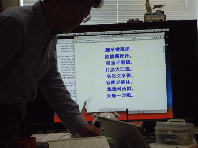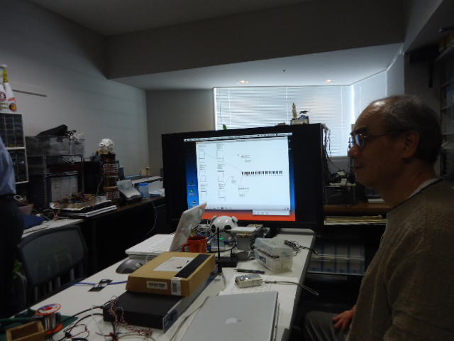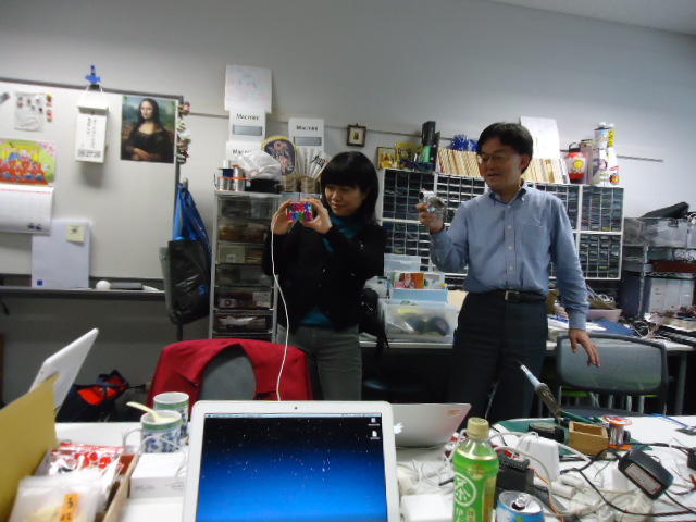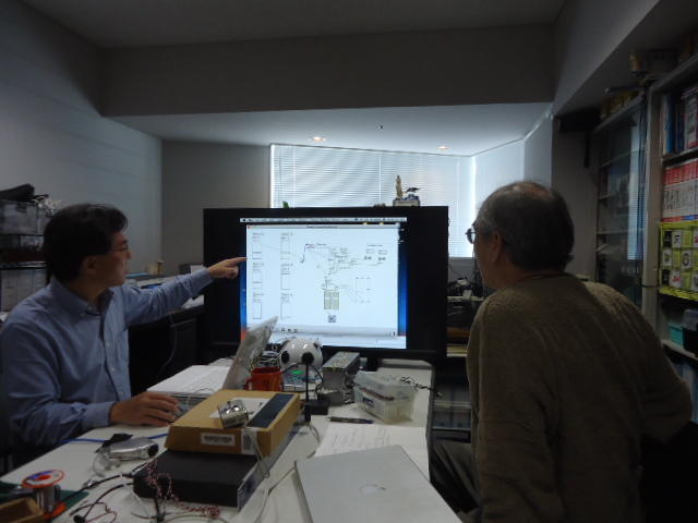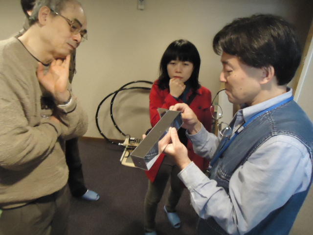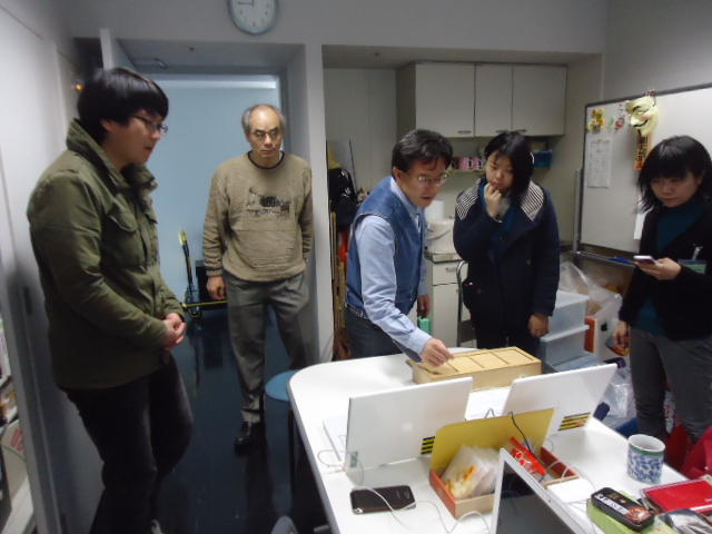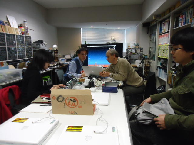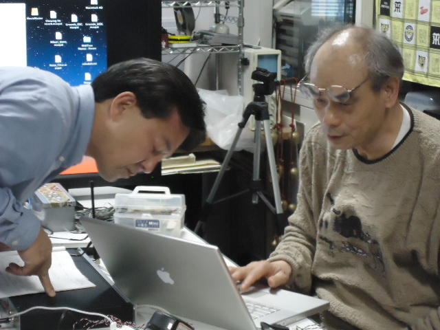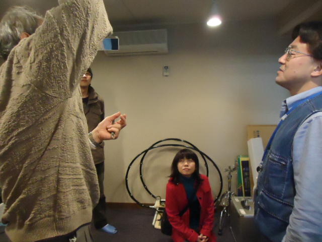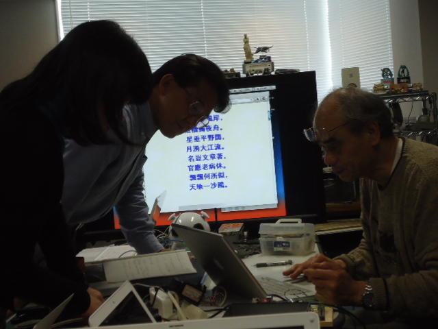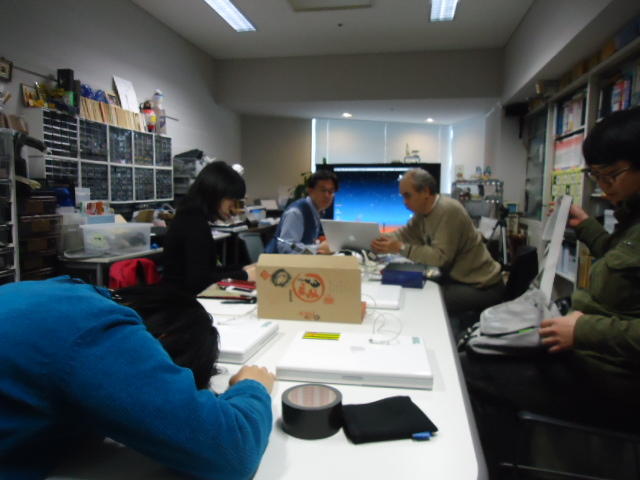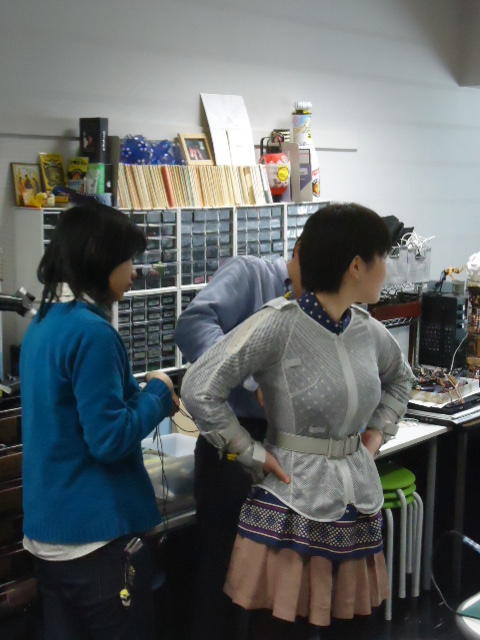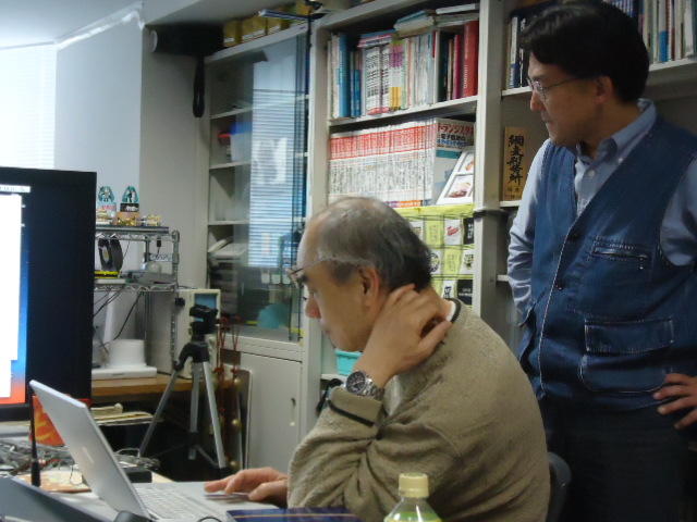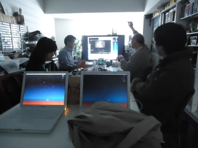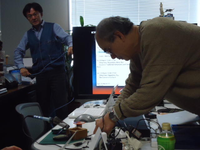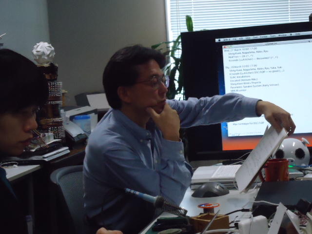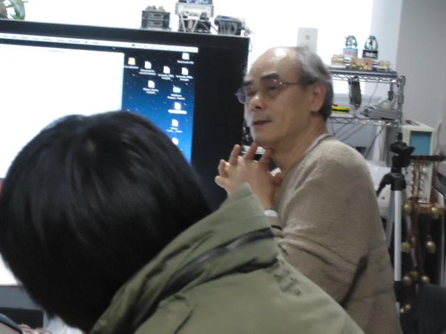 インスタレーションの勉強のため、台湾開南大学の作曲家、 Shing-Kwei教授がまた来日して、1106研究室に通う日々 の2日目の3月28日は、新2回生の坂下さんと金重さんも 参加しました。盛り沢山の内容 + 国際親善カラオケ(^_^)