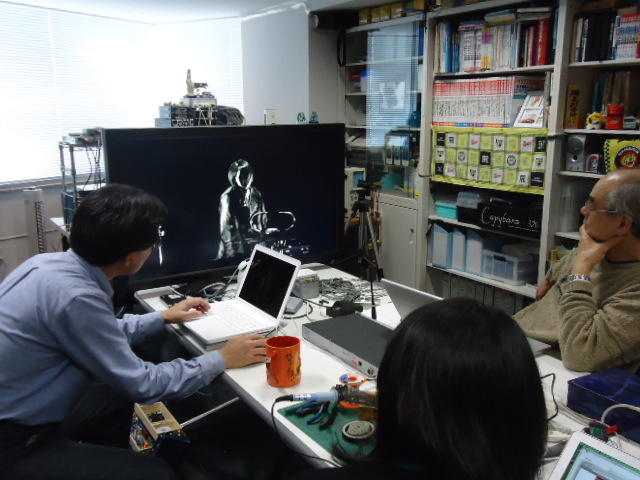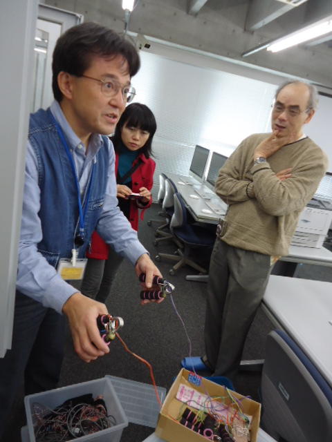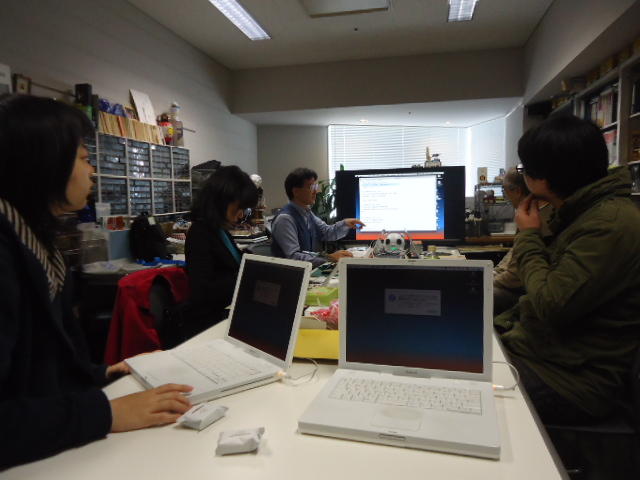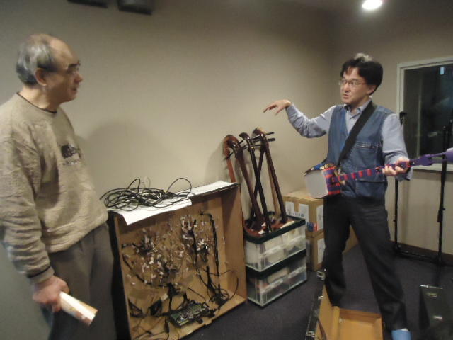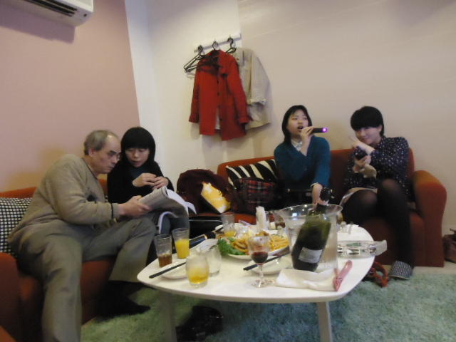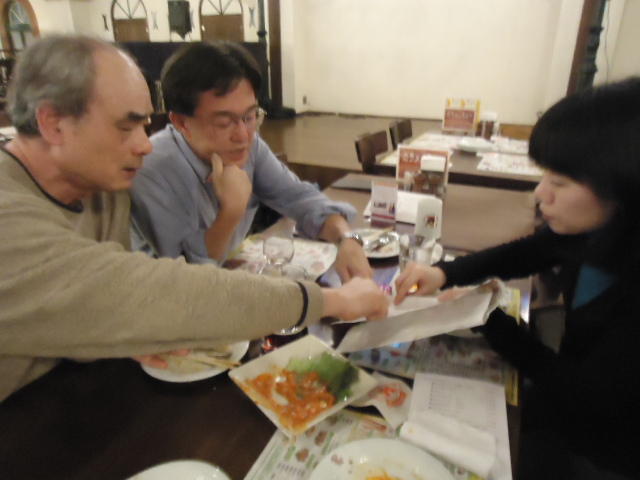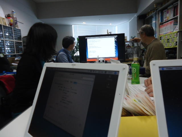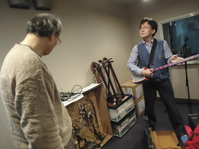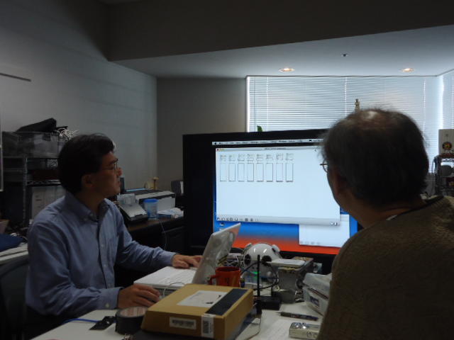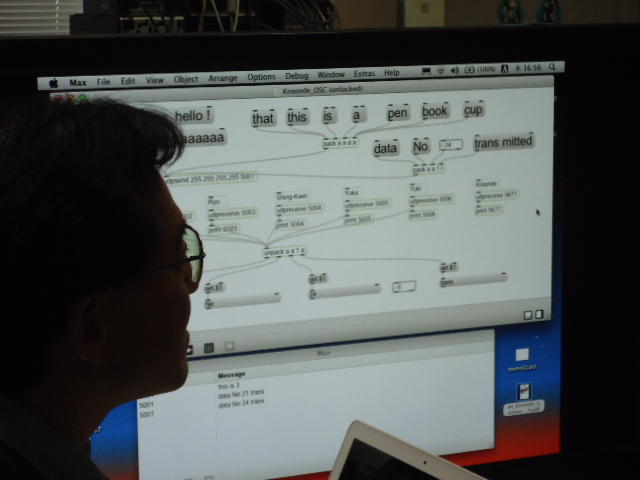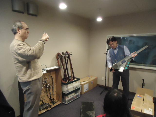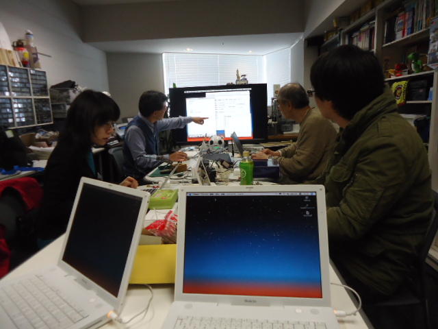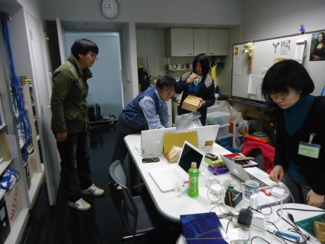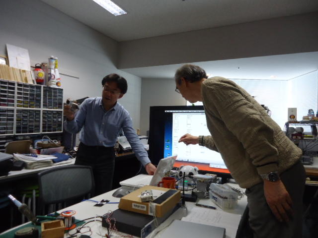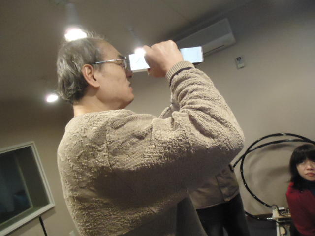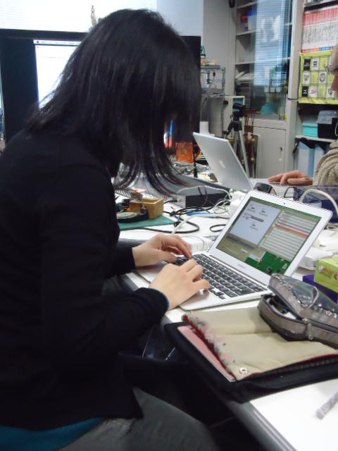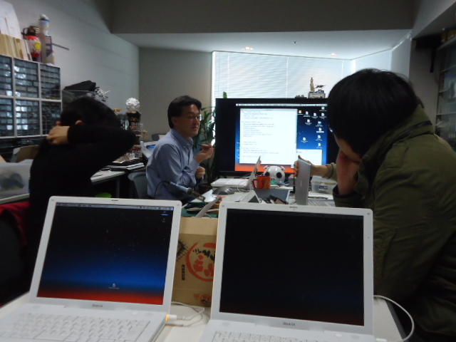 インスタレーションの勉強のため、台湾開南大学の作曲家、 Shing-Kwei教授がまた来日して、1106研究室に通う日々 の2日目の3月28日は、新2回生の坂下さんと金重さんも 参加しました。盛り沢山の内容 + 国際親善カラオケ(^_^)