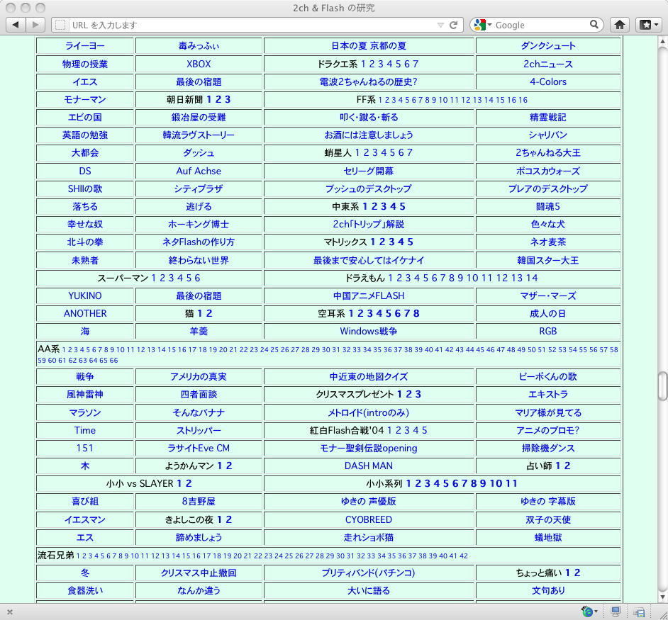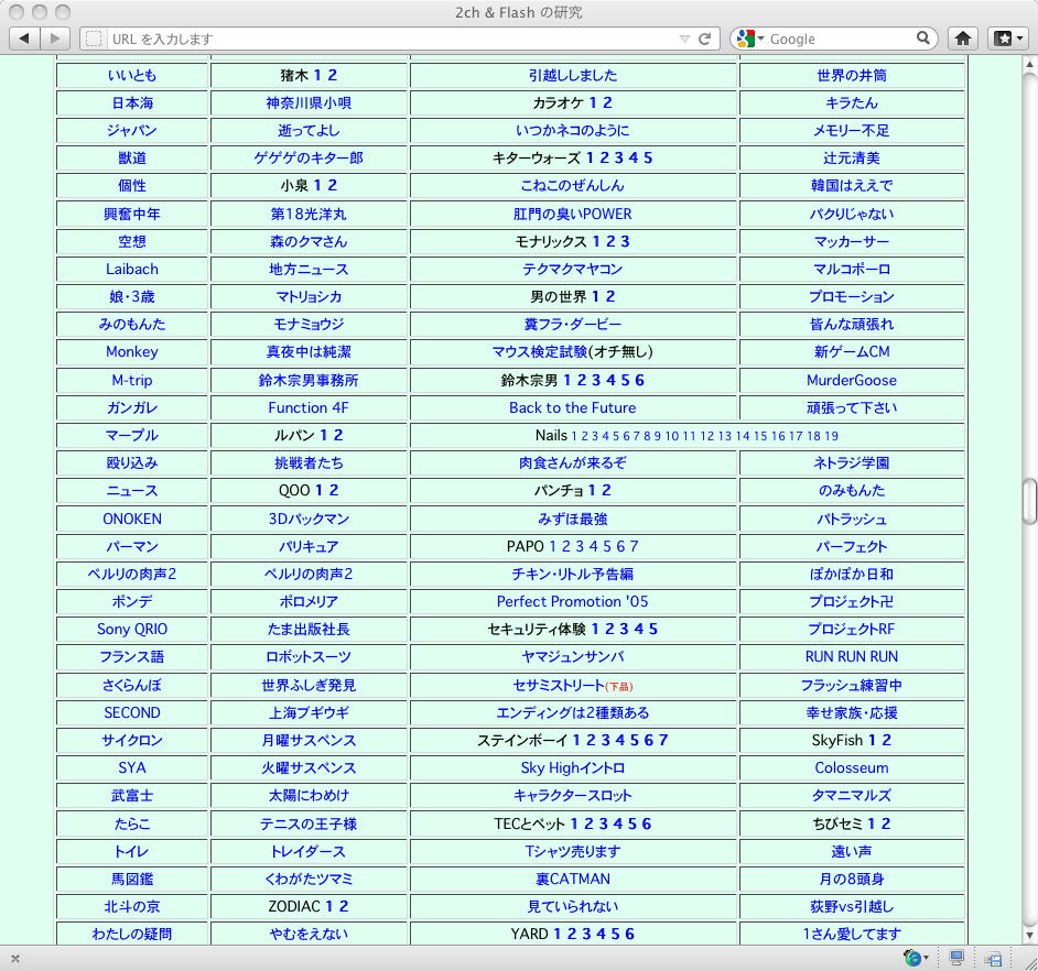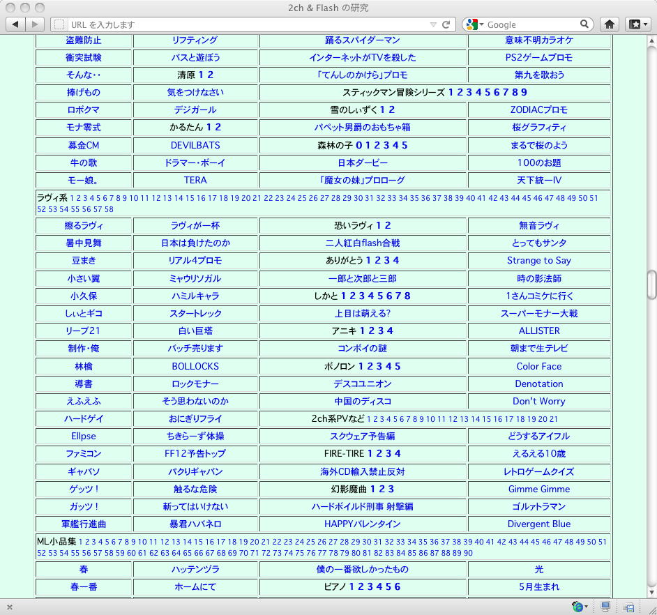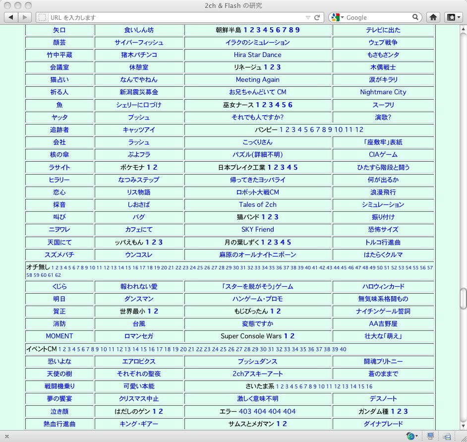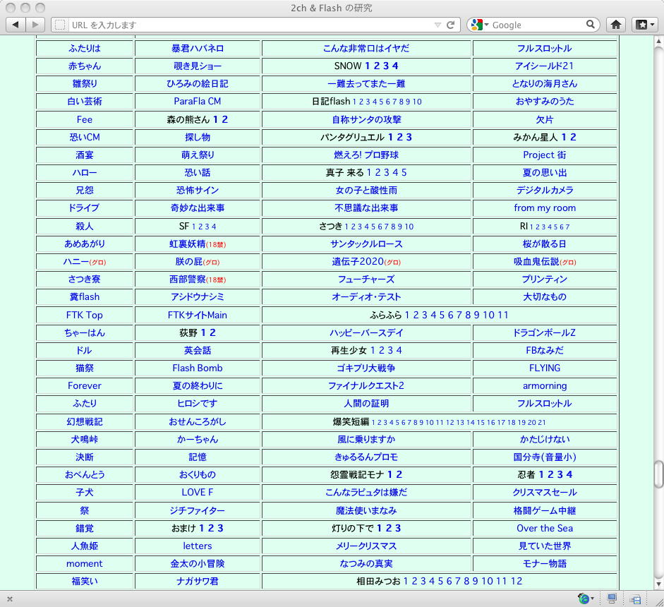 おもに2005年あたりを中心に、研究の一環として、当時爆発的に広まっていたFLASH作品を、2ちゃんねる等のリンクから収集したことがありました。そのまま流出させられないものが多く(^_^;)、この資料はこれまで、Comm系ゼミの学生(Web/Flashコンテンツが多い)を対象に、希望者のみ長嶋にメイルで問い合わせると、このページ(約12000ファイル、7GB以上)のURLとパスワードを教える、というシステムで限定公開してきました。今回、個人ゼミ体制となったので、「メディア造形学科の3回生以上の希望者」に対象を変更します。興味ある学生は、秘密保持を約束し、精神的ブラクラにブチ当たっても文句を言わない、という条件のもと、長嶋までURLとパスワードを問い合わせて下さい。以下はそのページ(全て個別のリンク。全コンテンツを僕は手元にゲット)のスクリーンショットです。