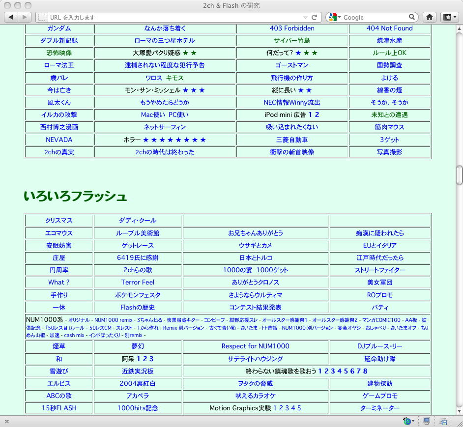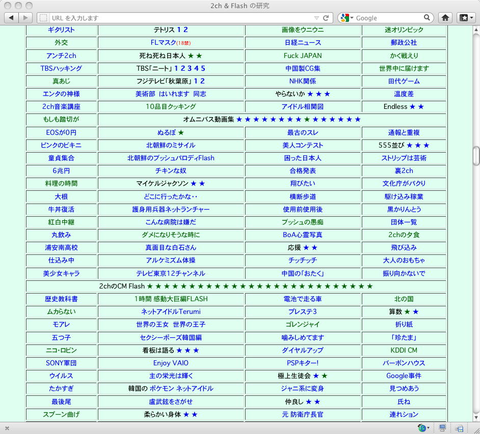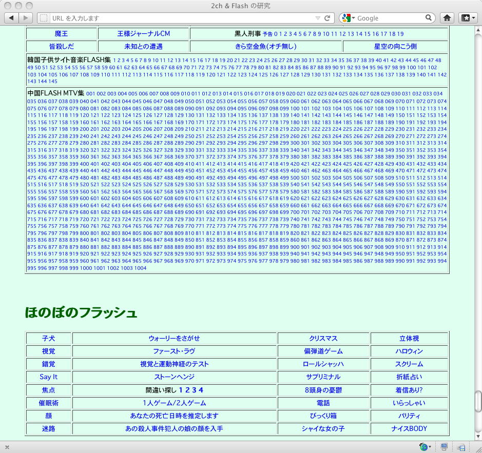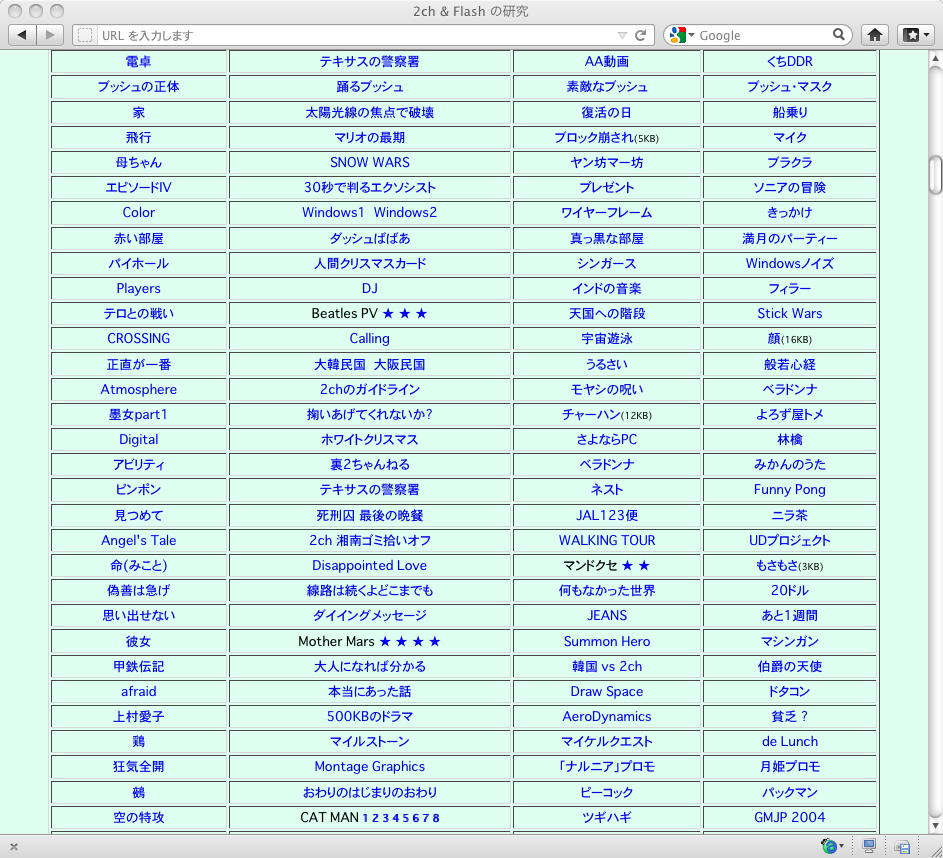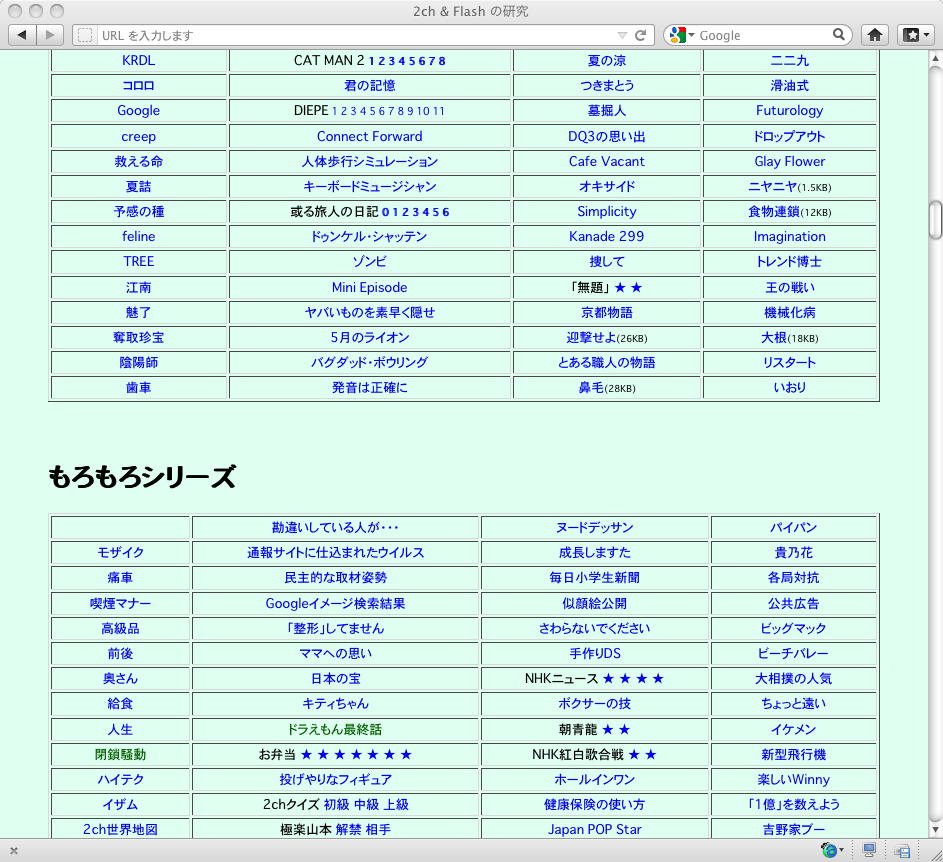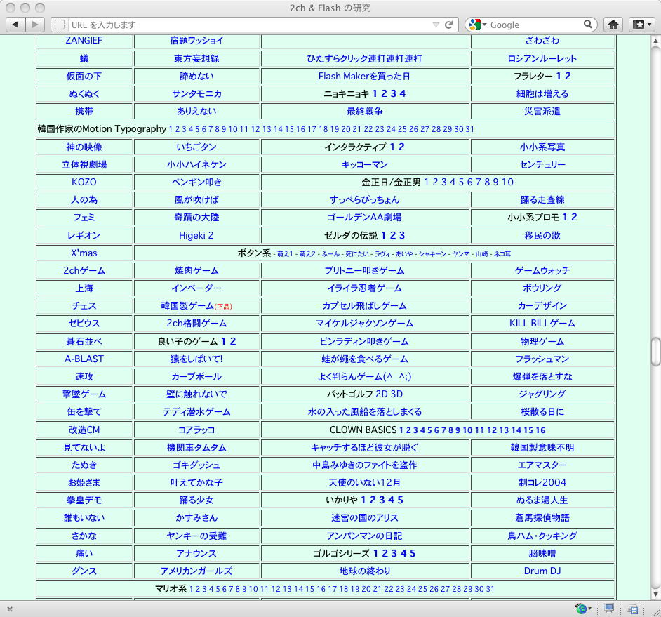 おもに2005年あたりを中心に、研究の一環として、当時爆発的に広まっていたFLASH作品を、2ちゃんねる等のリンクから収集したことがありました。そのまま流出させられないものが多く(^_^;)、この資料はこれまで、Comm系ゼミの学生(Web/Flashコンテンツが多い)を対象に、希望者のみ長嶋にメイルで問い合わせると、このページ(約12000ファイル、7GB以上)のURLとパスワードを教える、というシステムで限定公開してきました。今回、個人ゼミ体制となったので、「メディア造形学科の3回生以上の希望者」に対象を変更します。興味ある学生は、秘密保持を約束し、精神的ブラクラにブチ当たっても文句を言わない、という条件のもと、長嶋までURLとパスワードを問い合わせて下さい。以下はそのページ(全て個別のリンク。全コンテンツを僕は手元にゲット)のスクリーンショットです。