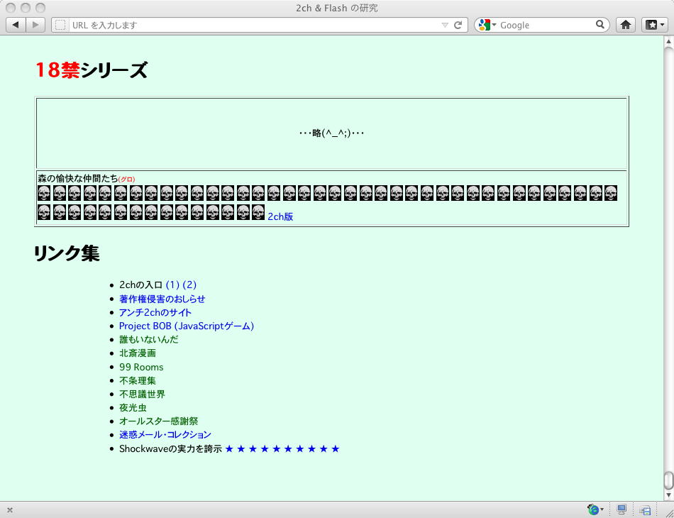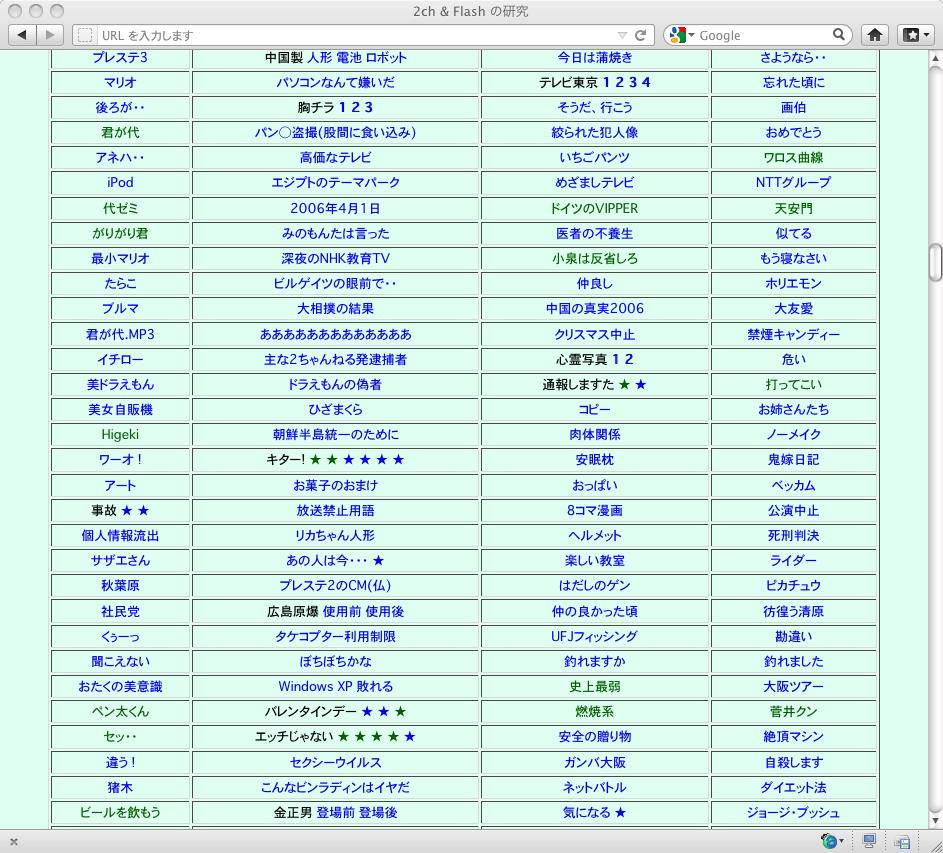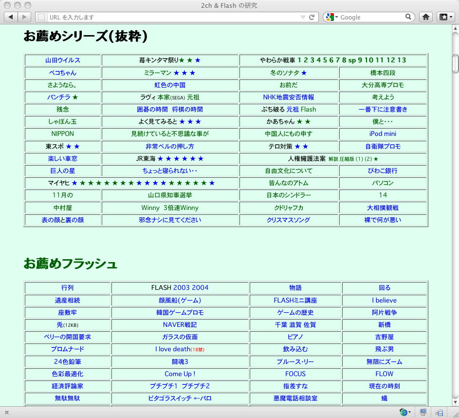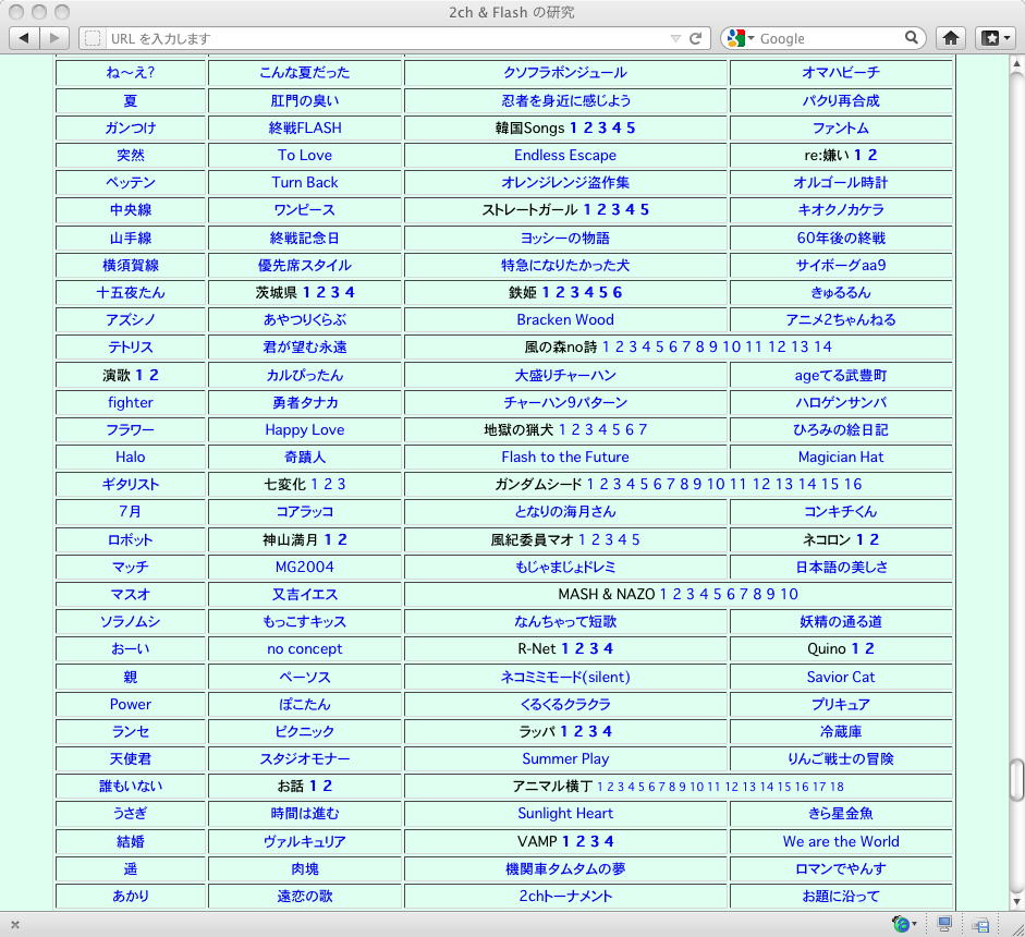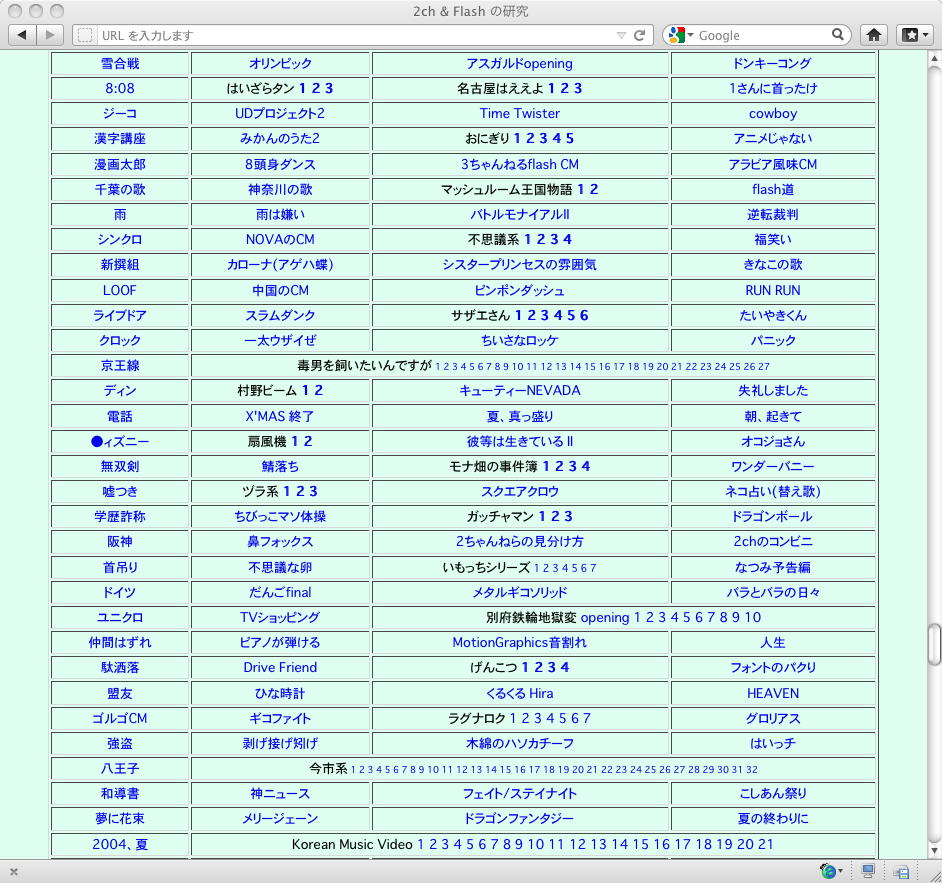 おもに2005年あたりを中心に、研究の一環として、当時爆発的に広まっていたFLASH作品を、2ちゃんねる等のリンクから収集したことがありました。そのまま流出させられないものが多く(^_^;)、この資料はこれまで、Comm系ゼミの学生(Web/Flashコンテンツが多い)を対象に、希望者のみ長嶋にメイルで問い合わせると、このページ(約12000ファイル、7GB以上)のURLとパスワードを教える、というシステムで限定公開してきました。今回、個人ゼミ体制となったので、「メディア造形学科の3回生以上の希望者」に対象を変更します。興味ある学生は、秘密保持を約束し、精神的ブラクラにブチ当たっても文句を言わない、という条件のもと、長嶋までURLとパスワードを問い合わせて下さい。以下はそのページ(全て個別のリンク。全コンテンツを僕は手元にゲット)のスクリーンショットです。