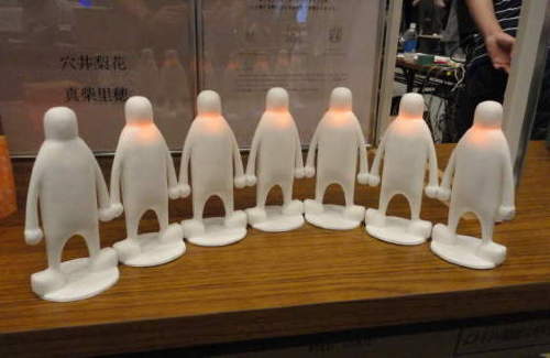 今回参加させていただいたMake: Ogaki meetingでは、suac展 (2009年度 学内開催)で出展した「つながる ヒト」の改良を行い 出展しました。 会場では、沢山の電子工作等の展示を見たり体験することができ、 作品を通して各々の考えを聞け、大変刺激を受ける良い機会と なりました。また、出展者は学生だけでなく幅広い年齢層だったことも あり、様々な視点の制作物が集まっていました。 私の出展した「つながる ヒト」は、人と触れ合ったときに感じるぬくもりを 形にした照明です。suac展とは違い、ずっと展示会場にいたので、作品に 対する反応を見れたことが、自分にとって何よりの収穫となりました。 来場者や出展者が自分の制作物に興味を持ってくれたことが嬉しくも あり、意見やアドバイスが頂けたことが、更に改良をするための勉強に なりました。反対に、制作方法を聞かれることも度々あったので、こちら からも刺激を与えることが出来たのではないかと思いました。 また、予想と違って若い世代に特にうけていたように感じました。こちらの 意図とする“人とのつながり”を感じ取ってもらえたのではないかと思います。 反省点としては、魅せ方まで気を使えなかったことです。展示会場が 明るかったため、影の中に展示をしたのですが、LEDがぼやっと光る ので、やはり暗所での展示に向いていたように思います。作品を作る だけではなく、展示方法まで配慮できれば良かったと思います。 今回、2日間の展示とこれまでの準備で疲れもありましたが、長嶋先生 をはじめ、1年生のみんな、周りの方々のおかげで楽しく和やかに 過ごせました。搬入・搬出もスムーズに、全体を通して無事に終われた のでほっとしています。 出展・参加という貴重な経験をさせていただき、ありがとうございました。金子 祐子