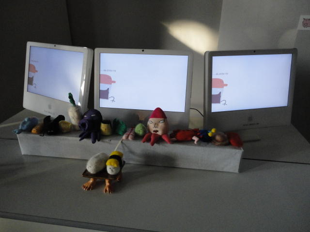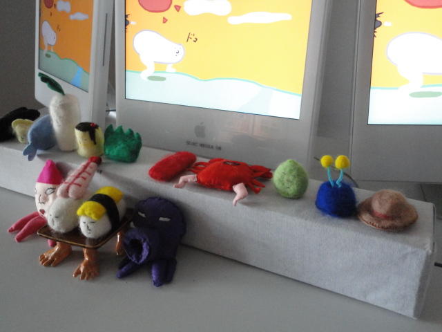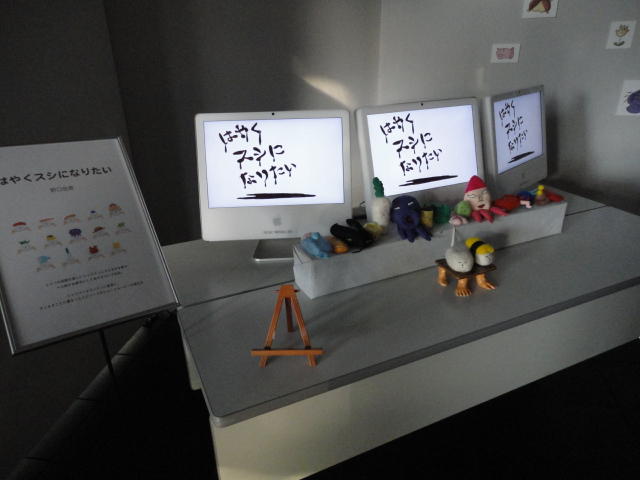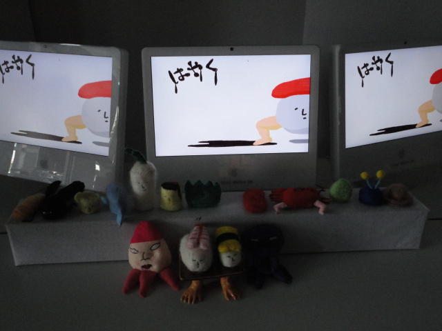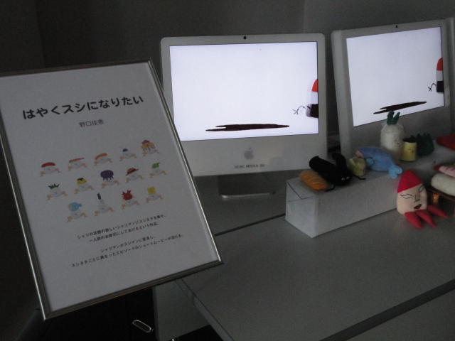 今回、野口さんの個展にスタッフとして参加できて、いい経験をすることができました。 Flushアニメや寿司のインスタレーションを実際に準備・設置したことで今後の参考にもなりました。 撤去の際にゴ●ブリが出てきたのはいい思い出です(笑) 楽しい3日間でした!