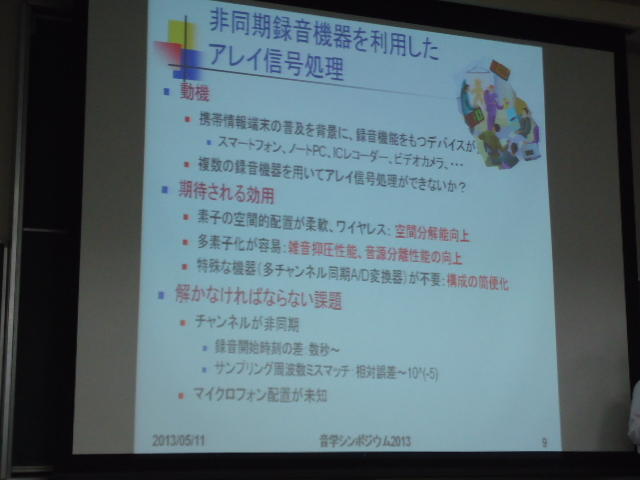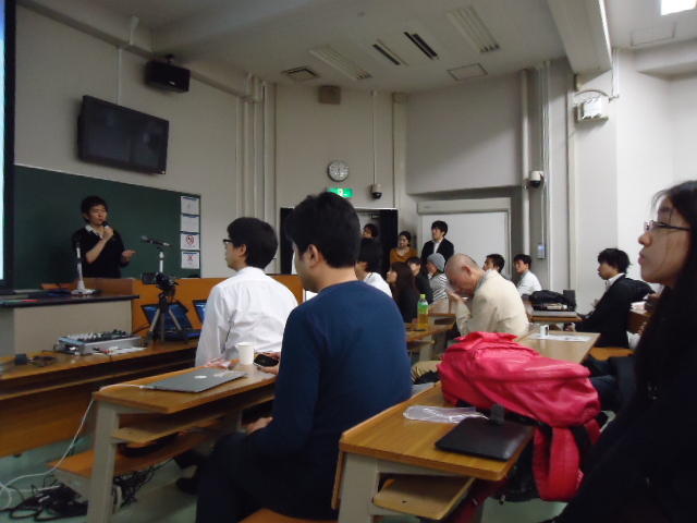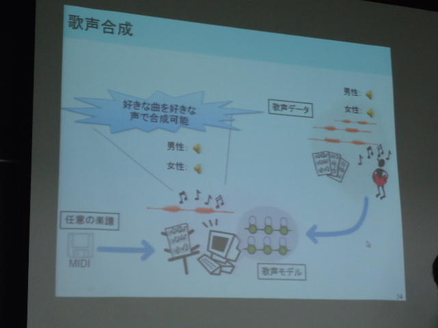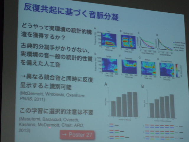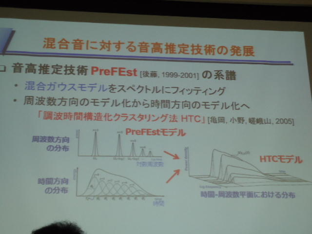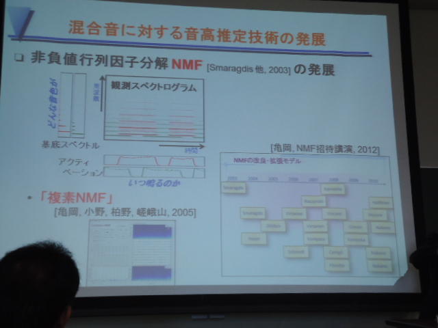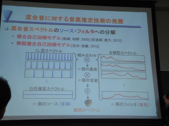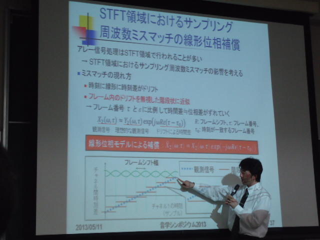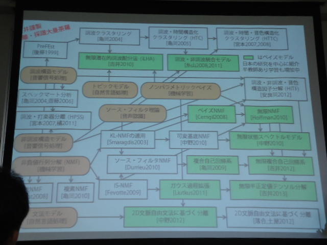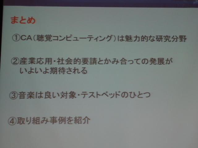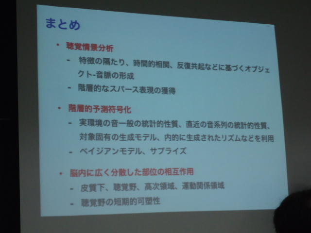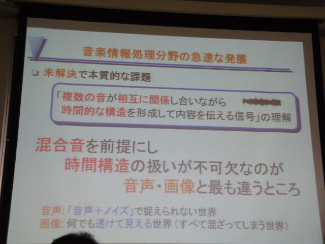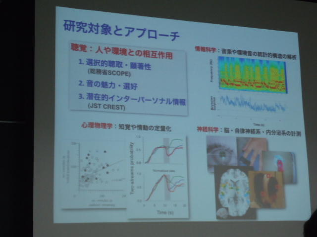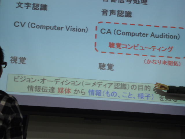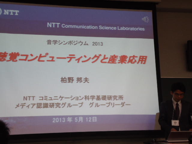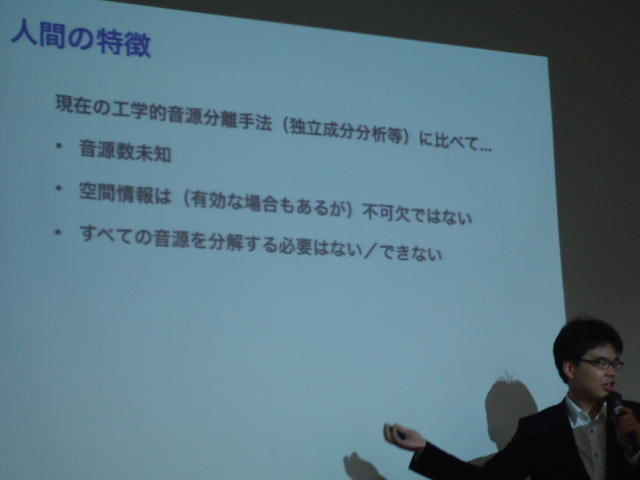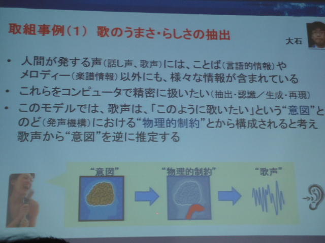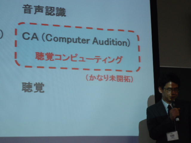 今回初めて東京のお茶の水女子大学から開けた音楽情報学研究会に参加しました。 今年の研究会は土日二日間 続けていて午前3時間と午後の3時間は大学の 先生や企業の研究者の最近の研究の動向や新しい技術 などの発表を聞くことが 出来たので新しい作品を作ることについてたくさんのアイディアをもらえる機会に なってましたし、午後に1時間半ずつ進行し、自分も参加したポスターセッションでは 色んな 研究者や先生に自分の作品を含めSUACの様々の作品のことについて発表 しつつ、質問や意見をもらい自分の作品の長所と短所について分かるいい機会ですた。 二日のスケジュールは大変だった けど自分の経験や知識が広がるいい経験でした。 このような機会に参加できるようにたくさんのことを手伝ってくれた長嶋先生に 大変お世話になりましたので感謝申し上げます。■2013-MUS-99 招待講演memo (長嶋)■ (1) 音声認識の方法論に関する考察-歴史的変遷と今後の展望- 河原 達也 ・音声認識は最近よくなった - Siri、放送の字幕、国会の議事録 ・音声認識はメディアアートの対象として面白いか? ・大規模コーパス ・DNN - Deep Neural Network (2) 統計的機械学習問題としての音声合成 徳田 恵一 ・波形の接続による音声合成(コーパスベース) ・ボーカロイドは単一音素(単一インベントリ・ダイフォン音声合成)によるコーパスベース (「あ」は1個しかない) ・過去「音声認識は技術、音声合成は芸術」 ・HMM音声合成→統計的パラメトリック音声合成 →「音声認識は技術、音声合成も技術」としていきたい ・図式としては分析合成方式の音響合成とあまり変わらない ・HMMとかNNとかにあまりソソラレない自分がいる(^_^;) ・補間、外挿(補外)のパラメータをライブ制御できるか? → できる(^_^) ・1次元(2要素)の補間だけでなく2次元の空間で補間・外挿できるか? → できる(^_^) パラメータ(軸)の選び方が重要となる (3) 聴覚における寸法知覚と最適末梢系 入野 俊夫 ・聴覚の基礎(生理学的) ・蝸牛-基底振動膜振動 ・信号処理的最適性→最小不確定性 ・○音聲 ×音声、音声には耳があるのだ ! ・音声 = 音響管 + 音源 → これはインスタになるのでは?? ・聴覚では声道長を認識して大人か子供かを区別している ・音源の寸法知覚(大人の声←→子供の声) 5%、母音だけだと悪化、30ms持続すればOK ・音のラウドネス 10%、ピッチ 1%、光の明るさ 15% ・Mellin変換 - Wavelet(スケール変形)を正規化する手法 ★調べる事 メリンオペレータ(時間×周波数) - 無次元 ・最適解 - ガンマチャープ gammacharp (4) 聴覚情景分析と選択的聴取の脳内メカニズム 柏野 牧夫 ・聴覚情景分析 ・カクテルパーティ ・出現は消失より顕著 (脳内では注意しないと見失う) ・Auditory Scene Analysis ・音脈(stream) ・実環境で起こりがちな現象を事前知識として利用している(無意識にと) ・特徴の隔たりを利用した音脈分疑 ・時間的相関を利用した音脈分疑 ・共変する音響特徴は一つの音脈に群化 ・反復共起に基づく音脈分疑 ・未学習のノイズであっても反復登場すると注意しなくても音響として群化・認識される (DJなどの応用に効く) ・階層的スパース表現の獲得 同時的群化→反復共起 ・聴覚系は階層性・並列性だけでなく双方向性がある ・音脈「知覚」はどこで成立するのか - 分かっていない ・fMRIなど脳内活動にあまりソソラレない自分がいる(^_^;) ・0.5Hzあたりのモジュレーションを引き込むメカニズムが重要では? (30)非同期録音機器を用いたマイクロフォンアレイ信号処理 小野 順貴 ・マイクロフォンアレイの音源分離 - まぁ当然 ・非同期録音機器を利用したアレイ信号処理 ・マルチマイク音源分離にあまりソソラレない自分がいる(^_^;) (31)三次元音場再現方式の概要 安藤 彰男 ・多スピーカで何が出来るか - ネタの宝庫? ・3次元音響(臨場感)の分類 チャネルベースシステム オブジェクトベースシステム シーンベースシスム ・原理による分類 心理音響モデル 物理音響モデル ・2chステレオにおける音像定位 中低域 - 両耳における位相差 広域 - 両耳における強度差 ・中低域はレベル差は小さいので1スピーカでOK ・高域は左右の位相差は分からないのでレベル差で検出 ・サイン則(頭の向きは固定)とタンゼント則(音源の方を向く) ・ミキサーはサイン則 ・あとはノウハウでいい音を作る ・Wave Field Synthesis (WFS) シーンベースからオブジェクトベースに行ける ・球面調和関数によるモデル Max6でシミュレーションできるカモ・・・・ ・音圧をあらわす式には進行波と後退波が現れる ・パラメトリックスピーカアレイの直進スピーカについては? → NHKからは何も出てこない(^_^;) ・NHKではチャンネルごとに別ソースというのは送らない (32)音楽の生成と理解 片寄 晴弘 ・イリアック組曲からCrestMuseまで ・生成理解系の研究はおいしい ・スクリーン写真撮りに没頭 (33)未来を切り拓く音楽情報処理 後藤 真孝 ・後藤パワー炸裂(^_^) ・コンピュータが自動作曲した音楽をコンピュータが自動鑑賞評価