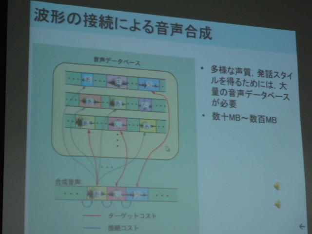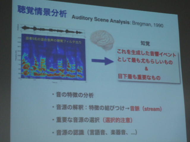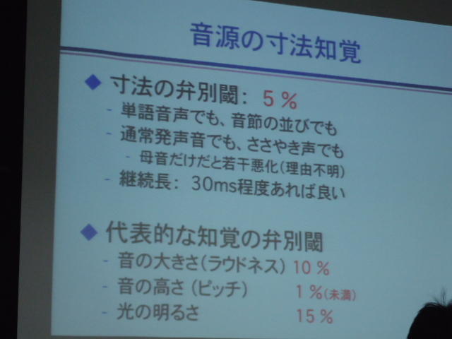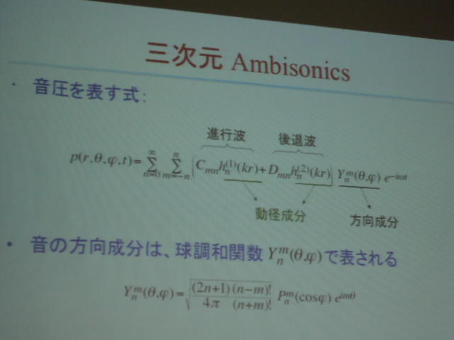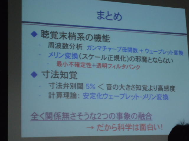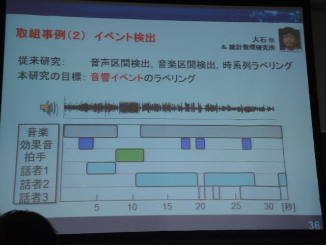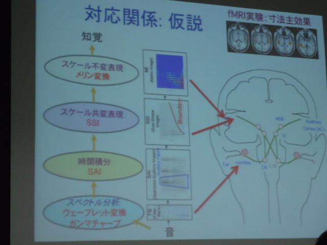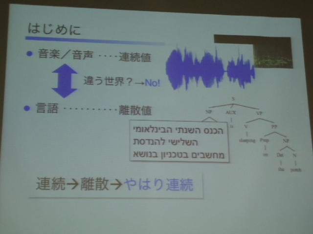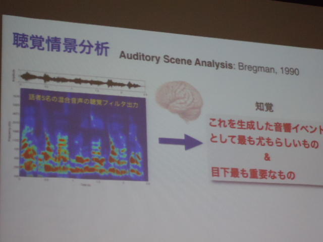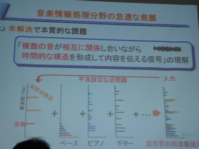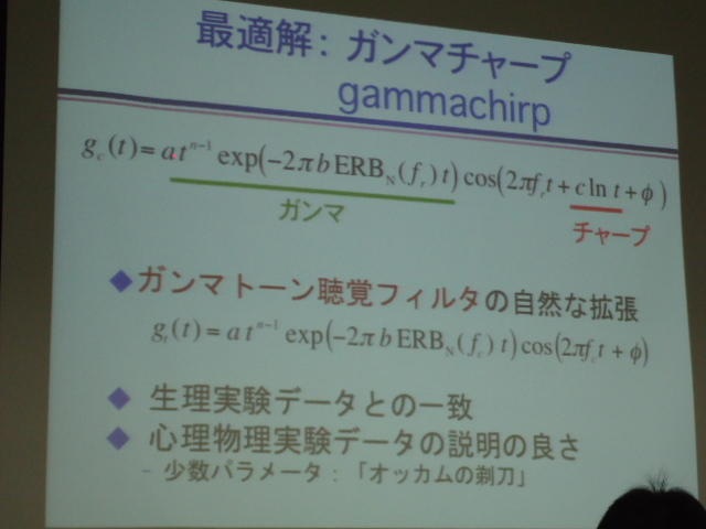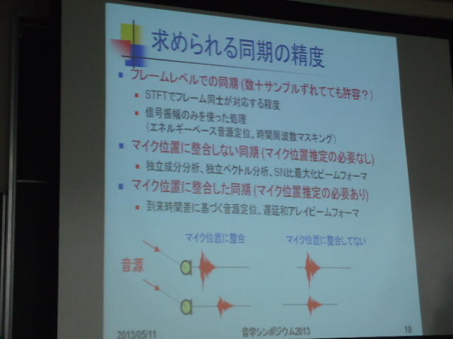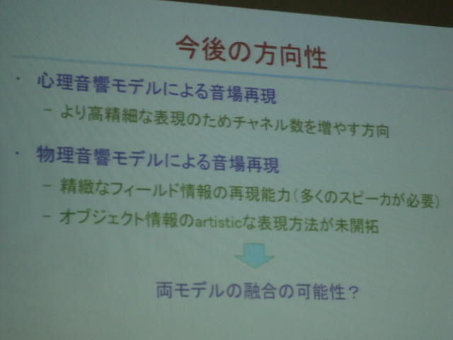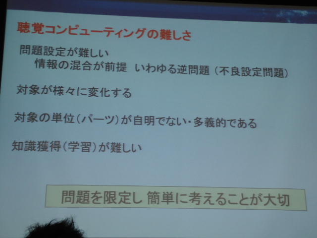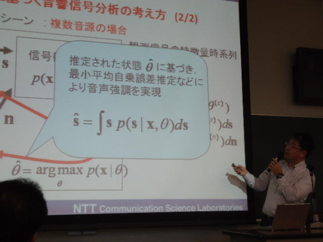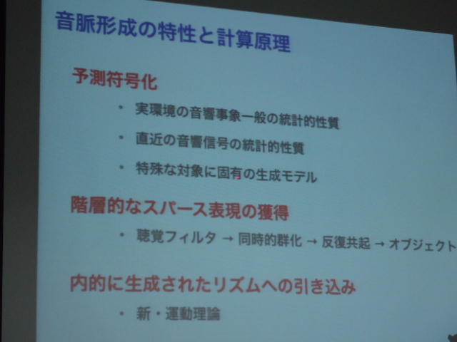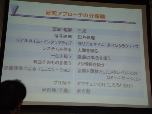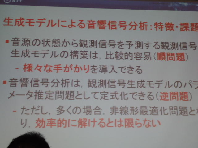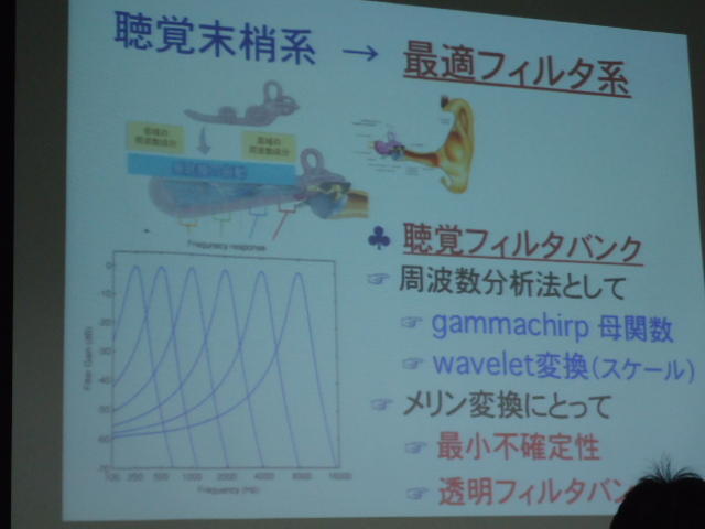 今回初めて東京のお茶の水女子大学から開けた音楽情報学研究会に参加しました。 今年の研究会は土日二日間 続けていて午前3時間と午後の3時間は大学の 先生や企業の研究者の最近の研究の動向や新しい技術 などの発表を聞くことが 出来たので新しい作品を作ることについてたくさんのアイディアをもらえる機会に なってましたし、午後に1時間半ずつ進行し、自分も参加したポスターセッションでは 色んな 研究者や先生に自分の作品を含めSUACの様々の作品のことについて発表 しつつ、質問や意見をもらい自分の作品の長所と短所について分かるいい機会ですた。 二日のスケジュールは大変だった けど自分の経験や知識が広がるいい経験でした。 このような機会に参加できるようにたくさんのことを手伝ってくれた長嶋先生に 大変お世話になりましたので感謝申し上げます。■2013-MUS-99 招待講演memo (長嶋)■ (1) 音声認識の方法論に関する考察-歴史的変遷と今後の展望- 河原 達也 ・音声認識は最近よくなった - Siri、放送の字幕、国会の議事録 ・音声認識はメディアアートの対象として面白いか? ・大規模コーパス ・DNN - Deep Neural Network (2) 統計的機械学習問題としての音声合成 徳田 恵一 ・波形の接続による音声合成(コーパスベース) ・ボーカロイドは単一音素(単一インベントリ・ダイフォン音声合成)によるコーパスベース (「あ」は1個しかない) ・過去「音声認識は技術、音声合成は芸術」 ・HMM音声合成→統計的パラメトリック音声合成 →「音声認識は技術、音声合成も技術」としていきたい ・図式としては分析合成方式の音響合成とあまり変わらない ・HMMとかNNとかにあまりソソラレない自分がいる(^_^;) ・補間、外挿(補外)のパラメータをライブ制御できるか? → できる(^_^) ・1次元(2要素)の補間だけでなく2次元の空間で補間・外挿できるか? → できる(^_^) パラメータ(軸)の選び方が重要となる (3) 聴覚における寸法知覚と最適末梢系 入野 俊夫 ・聴覚の基礎(生理学的) ・蝸牛-基底振動膜振動 ・信号処理的最適性→最小不確定性 ・○音聲 ×音声、音声には耳があるのだ ! ・音声 = 音響管 + 音源 → これはインスタになるのでは?? ・聴覚では声道長を認識して大人か子供かを区別している ・音源の寸法知覚(大人の声←→子供の声) 5%、母音だけだと悪化、30ms持続すればOK ・音のラウドネス 10%、ピッチ 1%、光の明るさ 15% ・Mellin変換 - Wavelet(スケール変形)を正規化する手法 ★調べる事 メリンオペレータ(時間×周波数) - 無次元 ・最適解 - ガンマチャープ gammacharp (4) 聴覚情景分析と選択的聴取の脳内メカニズム 柏野 牧夫 ・聴覚情景分析 ・カクテルパーティ ・出現は消失より顕著 (脳内では注意しないと見失う) ・Auditory Scene Analysis ・音脈(stream) ・実環境で起こりがちな現象を事前知識として利用している(無意識にと) ・特徴の隔たりを利用した音脈分疑 ・時間的相関を利用した音脈分疑 ・共変する音響特徴は一つの音脈に群化 ・反復共起に基づく音脈分疑 ・未学習のノイズであっても反復登場すると注意しなくても音響として群化・認識される (DJなどの応用に効く) ・階層的スパース表現の獲得 同時的群化→反復共起 ・聴覚系は階層性・並列性だけでなく双方向性がある ・音脈「知覚」はどこで成立するのか - 分かっていない ・fMRIなど脳内活動にあまりソソラレない自分がいる(^_^;) ・0.5Hzあたりのモジュレーションを引き込むメカニズムが重要では? (30)非同期録音機器を用いたマイクロフォンアレイ信号処理 小野 順貴 ・マイクロフォンアレイの音源分離 - まぁ当然 ・非同期録音機器を利用したアレイ信号処理 ・マルチマイク音源分離にあまりソソラレない自分がいる(^_^;) (31)三次元音場再現方式の概要 安藤 彰男 ・多スピーカで何が出来るか - ネタの宝庫? ・3次元音響(臨場感)の分類 チャネルベースシステム オブジェクトベースシステム シーンベースシスム ・原理による分類 心理音響モデル 物理音響モデル ・2chステレオにおける音像定位 中低域 - 両耳における位相差 広域 - 両耳における強度差 ・中低域はレベル差は小さいので1スピーカでOK ・高域は左右の位相差は分からないのでレベル差で検出 ・サイン則(頭の向きは固定)とタンゼント則(音源の方を向く) ・ミキサーはサイン則 ・あとはノウハウでいい音を作る ・Wave Field Synthesis (WFS) シーンベースからオブジェクトベースに行ける ・球面調和関数によるモデル Max6でシミュレーションできるカモ・・・・ ・音圧をあらわす式には進行波と後退波が現れる ・パラメトリックスピーカアレイの直進スピーカについては? → NHKからは何も出てこない(^_^;) ・NHKではチャンネルごとに別ソースというのは送らない (32)音楽の生成と理解 片寄 晴弘 ・イリアック組曲からCrestMuseまで ・生成理解系の研究はおいしい ・スクリーン写真撮りに没頭 (33)未来を切り拓く音楽情報処理 後藤 真孝 ・後藤パワー炸裂(^_^) ・コンピュータが自動作曲した音楽をコンピュータが自動鑑賞評価