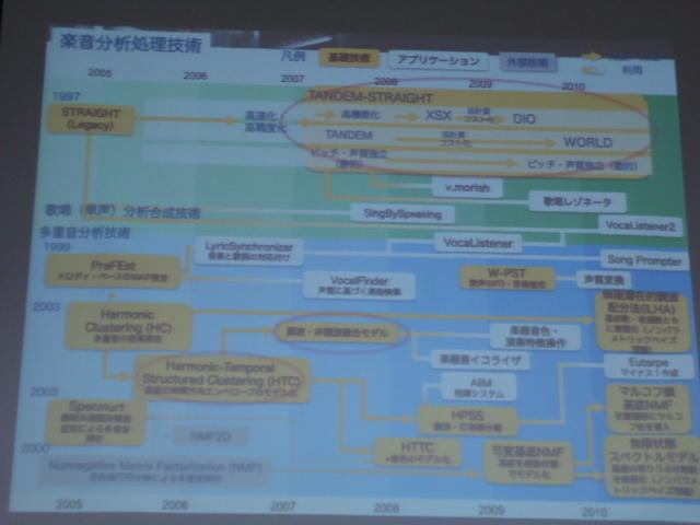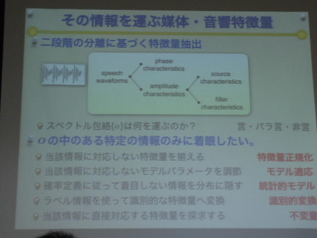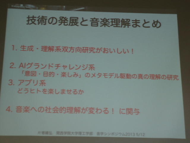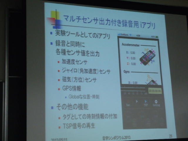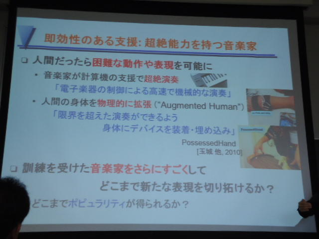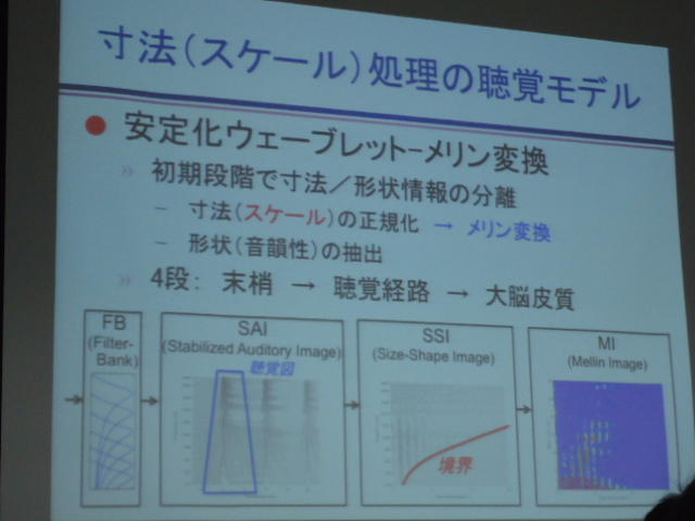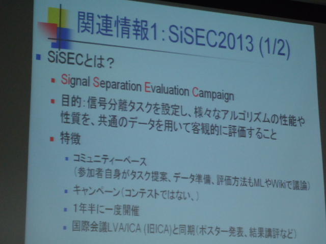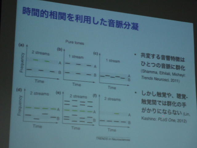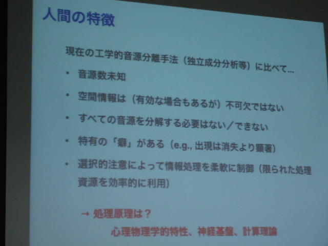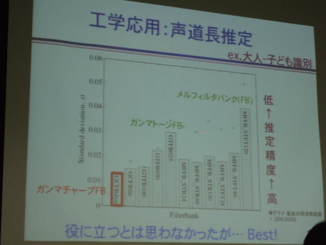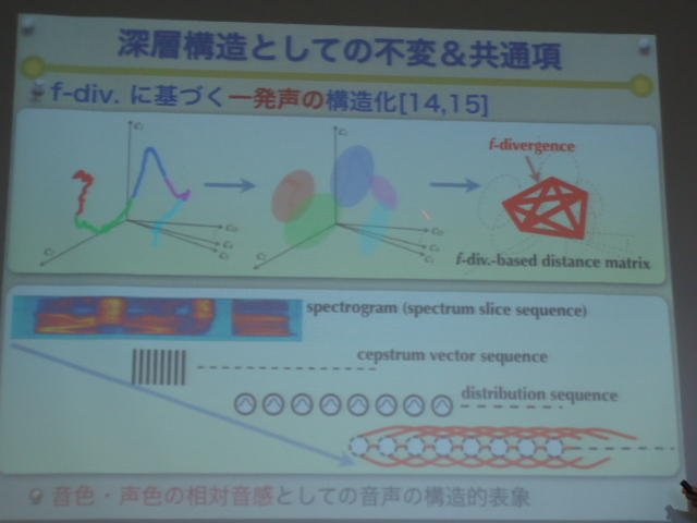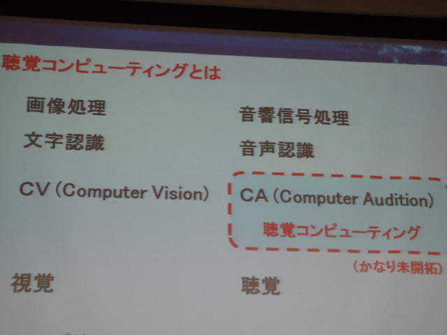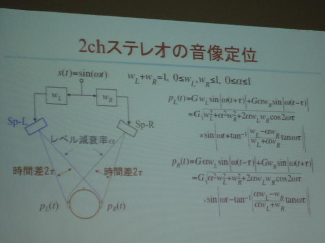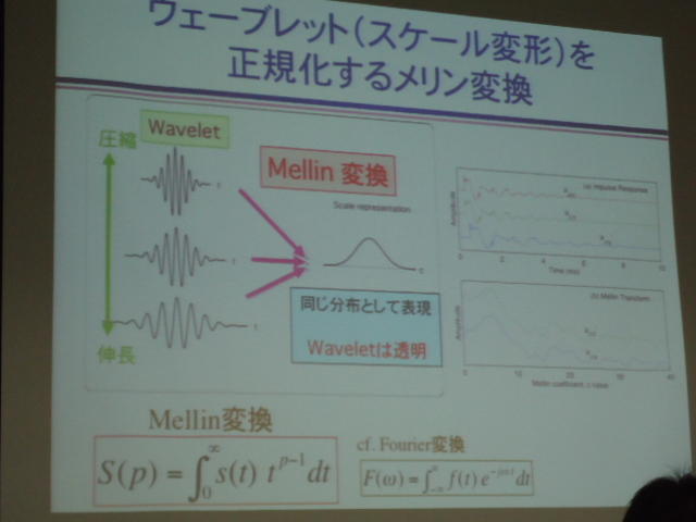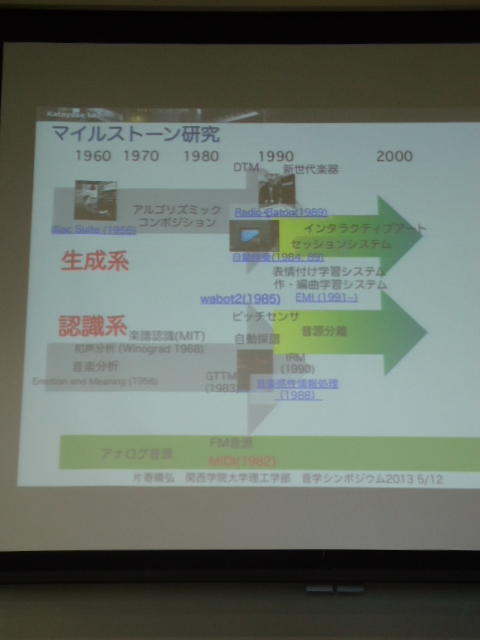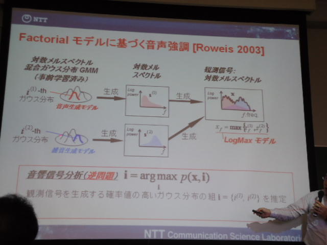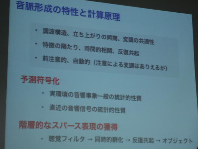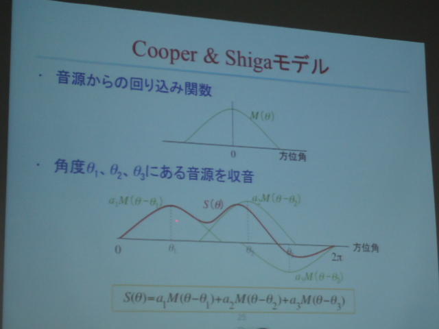 今回初めて東京のお茶の水女子大学から開けた音楽情報学研究会に参加しました。 今年の研究会は土日二日間 続けていて午前3時間と午後の3時間は大学の 先生や企業の研究者の最近の研究の動向や新しい技術 などの発表を聞くことが 出来たので新しい作品を作ることについてたくさんのアイディアをもらえる機会に なってましたし、午後に1時間半ずつ進行し、自分も参加したポスターセッションでは 色んな 研究者や先生に自分の作品を含めSUACの様々の作品のことについて発表 しつつ、質問や意見をもらい自分の作品の長所と短所について分かるいい機会ですた。 二日のスケジュールは大変だった けど自分の経験や知識が広がるいい経験でした。 このような機会に参加できるようにたくさんのことを手伝ってくれた長嶋先生に 大変お世話になりましたので感謝申し上げます。■2013-MUS-99 招待講演memo (長嶋)■ (1) 音声認識の方法論に関する考察-歴史的変遷と今後の展望- 河原 達也 ・音声認識は最近よくなった - Siri、放送の字幕、国会の議事録 ・音声認識はメディアアートの対象として面白いか? ・大規模コーパス ・DNN - Deep Neural Network (2) 統計的機械学習問題としての音声合成 徳田 恵一 ・波形の接続による音声合成(コーパスベース) ・ボーカロイドは単一音素(単一インベントリ・ダイフォン音声合成)によるコーパスベース (「あ」は1個しかない) ・過去「音声認識は技術、音声合成は芸術」 ・HMM音声合成→統計的パラメトリック音声合成 →「音声認識は技術、音声合成も技術」としていきたい ・図式としては分析合成方式の音響合成とあまり変わらない ・HMMとかNNとかにあまりソソラレない自分がいる(^_^;) ・補間、外挿(補外)のパラメータをライブ制御できるか? → できる(^_^) ・1次元(2要素)の補間だけでなく2次元の空間で補間・外挿できるか? → できる(^_^) パラメータ(軸)の選び方が重要となる (3) 聴覚における寸法知覚と最適末梢系 入野 俊夫 ・聴覚の基礎(生理学的) ・蝸牛-基底振動膜振動 ・信号処理的最適性→最小不確定性 ・○音聲 ×音声、音声には耳があるのだ ! ・音声 = 音響管 + 音源 → これはインスタになるのでは?? ・聴覚では声道長を認識して大人か子供かを区別している ・音源の寸法知覚(大人の声←→子供の声) 5%、母音だけだと悪化、30ms持続すればOK ・音のラウドネス 10%、ピッチ 1%、光の明るさ 15% ・Mellin変換 - Wavelet(スケール変形)を正規化する手法 ★調べる事 メリンオペレータ(時間×周波数) - 無次元 ・最適解 - ガンマチャープ gammacharp (4) 聴覚情景分析と選択的聴取の脳内メカニズム 柏野 牧夫 ・聴覚情景分析 ・カクテルパーティ ・出現は消失より顕著 (脳内では注意しないと見失う) ・Auditory Scene Analysis ・音脈(stream) ・実環境で起こりがちな現象を事前知識として利用している(無意識にと) ・特徴の隔たりを利用した音脈分疑 ・時間的相関を利用した音脈分疑 ・共変する音響特徴は一つの音脈に群化 ・反復共起に基づく音脈分疑 ・未学習のノイズであっても反復登場すると注意しなくても音響として群化・認識される (DJなどの応用に効く) ・階層的スパース表現の獲得 同時的群化→反復共起 ・聴覚系は階層性・並列性だけでなく双方向性がある ・音脈「知覚」はどこで成立するのか - 分かっていない ・fMRIなど脳内活動にあまりソソラレない自分がいる(^_^;) ・0.5Hzあたりのモジュレーションを引き込むメカニズムが重要では? (30)非同期録音機器を用いたマイクロフォンアレイ信号処理 小野 順貴 ・マイクロフォンアレイの音源分離 - まぁ当然 ・非同期録音機器を利用したアレイ信号処理 ・マルチマイク音源分離にあまりソソラレない自分がいる(^_^;) (31)三次元音場再現方式の概要 安藤 彰男 ・多スピーカで何が出来るか - ネタの宝庫? ・3次元音響(臨場感)の分類 チャネルベースシステム オブジェクトベースシステム シーンベースシスム ・原理による分類 心理音響モデル 物理音響モデル ・2chステレオにおける音像定位 中低域 - 両耳における位相差 広域 - 両耳における強度差 ・中低域はレベル差は小さいので1スピーカでOK ・高域は左右の位相差は分からないのでレベル差で検出 ・サイン則(頭の向きは固定)とタンゼント則(音源の方を向く) ・ミキサーはサイン則 ・あとはノウハウでいい音を作る ・Wave Field Synthesis (WFS) シーンベースからオブジェクトベースに行ける ・球面調和関数によるモデル Max6でシミュレーションできるカモ・・・・ ・音圧をあらわす式には進行波と後退波が現れる ・パラメトリックスピーカアレイの直進スピーカについては? → NHKからは何も出てこない(^_^;) ・NHKではチャンネルごとに別ソースというのは送らない (32)音楽の生成と理解 片寄 晴弘 ・イリアック組曲からCrestMuseまで ・生成理解系の研究はおいしい ・スクリーン写真撮りに没頭 (33)未来を切り拓く音楽情報処理 後藤 真孝 ・後藤パワー炸裂(^_^) ・コンピュータが自動作曲した音楽をコンピュータが自動鑑賞評価