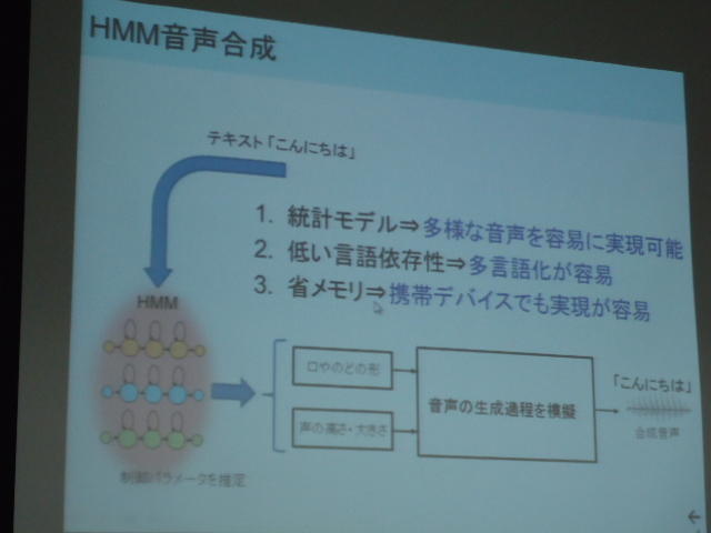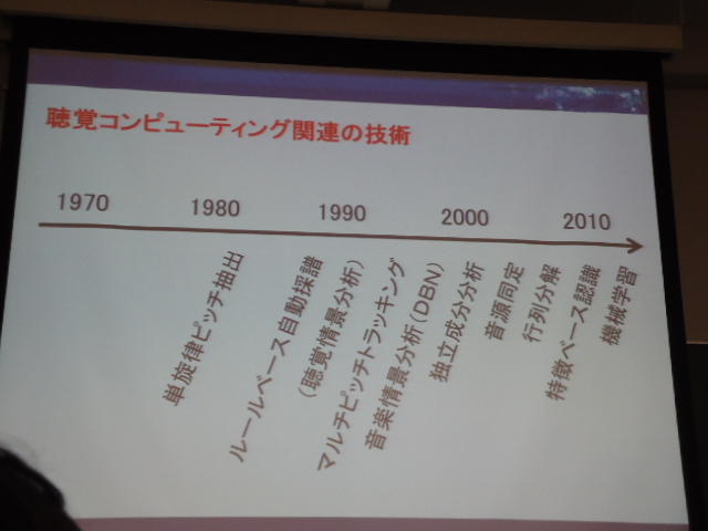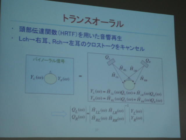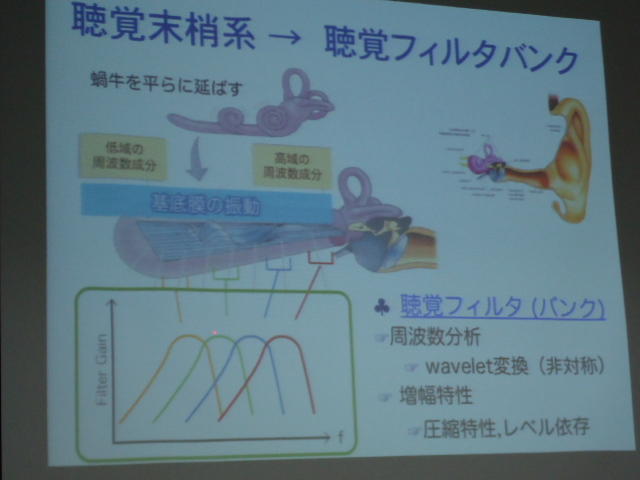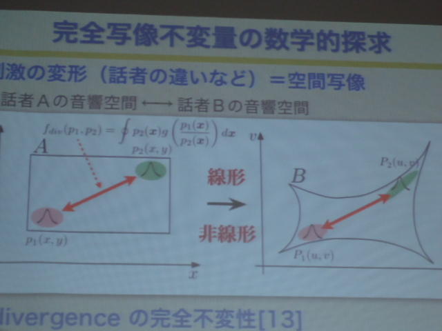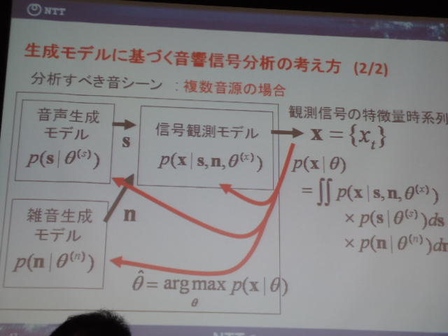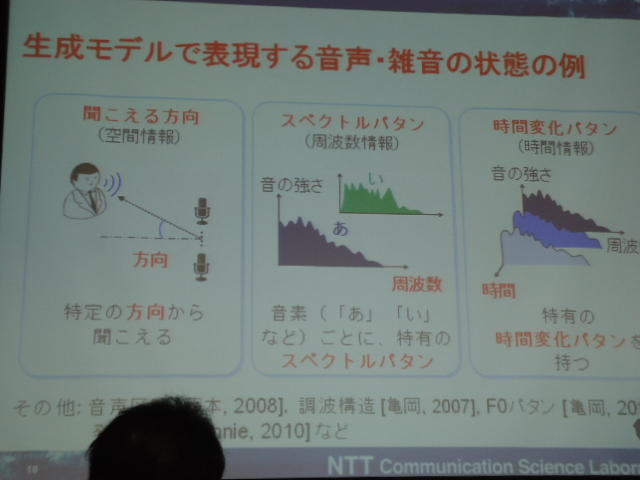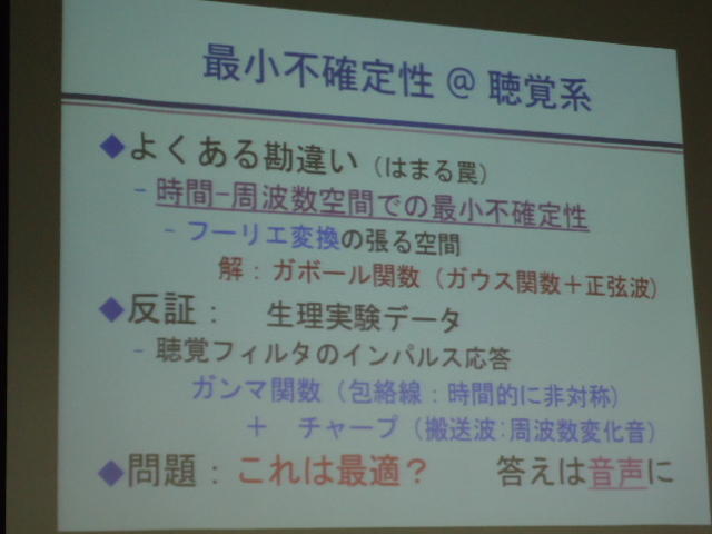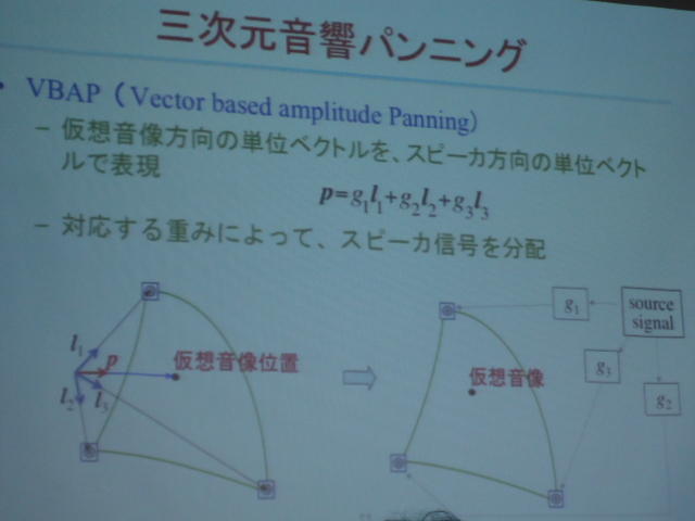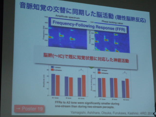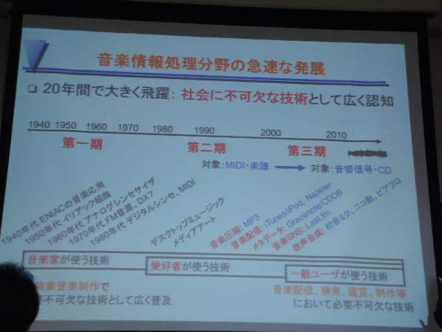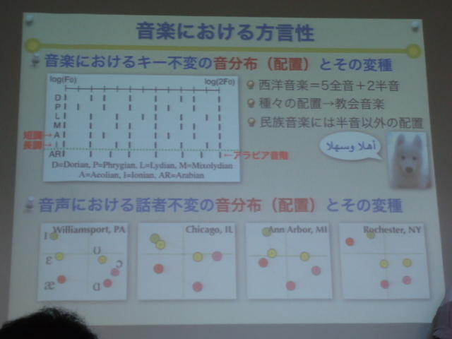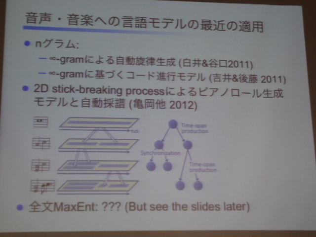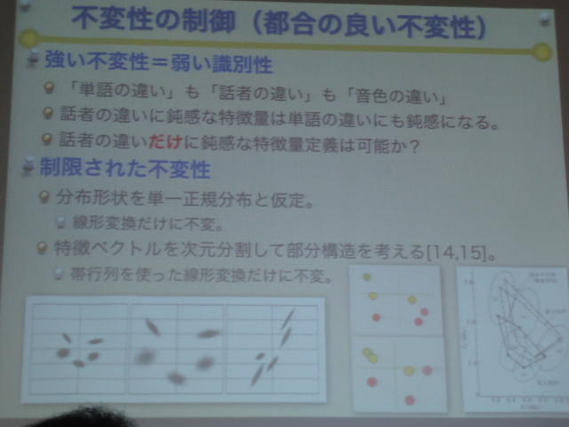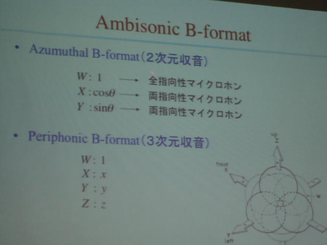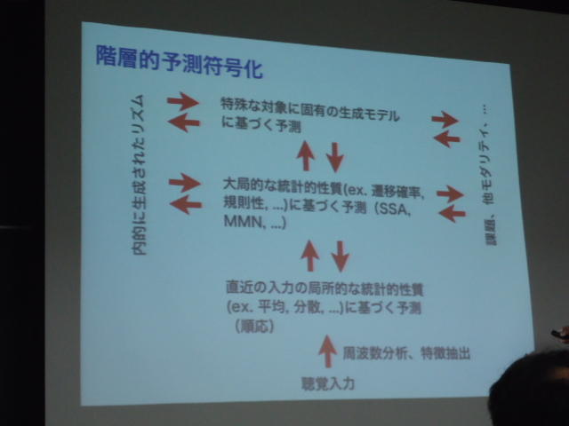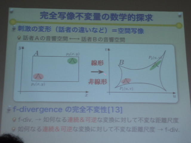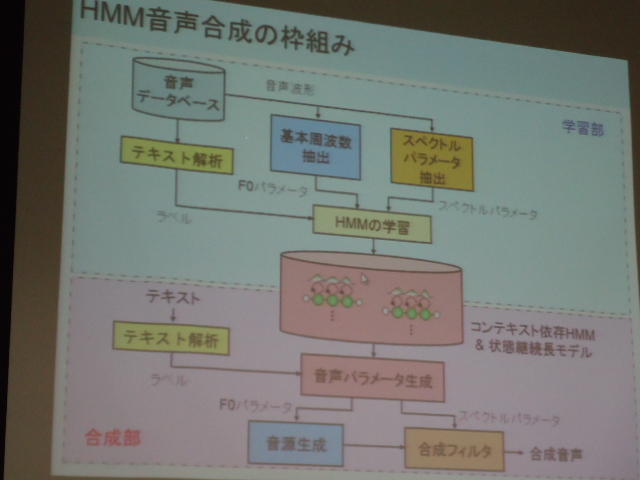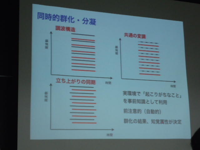 今回初めて東京のお茶の水女子大学から開けた音楽情報学研究会に参加しました。 今年の研究会は土日二日間 続けていて午前3時間と午後の3時間は大学の 先生や企業の研究者の最近の研究の動向や新しい技術 などの発表を聞くことが 出来たので新しい作品を作ることについてたくさんのアイディアをもらえる機会に なってましたし、午後に1時間半ずつ進行し、自分も参加したポスターセッションでは 色んな 研究者や先生に自分の作品を含めSUACの様々の作品のことについて発表 しつつ、質問や意見をもらい自分の作品の長所と短所について分かるいい機会ですた。 二日のスケジュールは大変だった けど自分の経験や知識が広がるいい経験でした。 このような機会に参加できるようにたくさんのことを手伝ってくれた長嶋先生に 大変お世話になりましたので感謝申し上げます。■2013-MUS-99 招待講演memo (長嶋)■ (1) 音声認識の方法論に関する考察-歴史的変遷と今後の展望- 河原 達也 ・音声認識は最近よくなった - Siri、放送の字幕、国会の議事録 ・音声認識はメディアアートの対象として面白いか? ・大規模コーパス ・DNN - Deep Neural Network (2) 統計的機械学習問題としての音声合成 徳田 恵一 ・波形の接続による音声合成(コーパスベース) ・ボーカロイドは単一音素(単一インベントリ・ダイフォン音声合成)によるコーパスベース (「あ」は1個しかない) ・過去「音声認識は技術、音声合成は芸術」 ・HMM音声合成→統計的パラメトリック音声合成 →「音声認識は技術、音声合成も技術」としていきたい ・図式としては分析合成方式の音響合成とあまり変わらない ・HMMとかNNとかにあまりソソラレない自分がいる(^_^;) ・補間、外挿(補外)のパラメータをライブ制御できるか? → できる(^_^) ・1次元(2要素)の補間だけでなく2次元の空間で補間・外挿できるか? → できる(^_^) パラメータ(軸)の選び方が重要となる (3) 聴覚における寸法知覚と最適末梢系 入野 俊夫 ・聴覚の基礎(生理学的) ・蝸牛-基底振動膜振動 ・信号処理的最適性→最小不確定性 ・○音聲 ×音声、音声には耳があるのだ ! ・音声 = 音響管 + 音源 → これはインスタになるのでは?? ・聴覚では声道長を認識して大人か子供かを区別している ・音源の寸法知覚(大人の声←→子供の声) 5%、母音だけだと悪化、30ms持続すればOK ・音のラウドネス 10%、ピッチ 1%、光の明るさ 15% ・Mellin変換 - Wavelet(スケール変形)を正規化する手法 ★調べる事 メリンオペレータ(時間×周波数) - 無次元 ・最適解 - ガンマチャープ gammacharp (4) 聴覚情景分析と選択的聴取の脳内メカニズム 柏野 牧夫 ・聴覚情景分析 ・カクテルパーティ ・出現は消失より顕著 (脳内では注意しないと見失う) ・Auditory Scene Analysis ・音脈(stream) ・実環境で起こりがちな現象を事前知識として利用している(無意識にと) ・特徴の隔たりを利用した音脈分疑 ・時間的相関を利用した音脈分疑 ・共変する音響特徴は一つの音脈に群化 ・反復共起に基づく音脈分疑 ・未学習のノイズであっても反復登場すると注意しなくても音響として群化・認識される (DJなどの応用に効く) ・階層的スパース表現の獲得 同時的群化→反復共起 ・聴覚系は階層性・並列性だけでなく双方向性がある ・音脈「知覚」はどこで成立するのか - 分かっていない ・fMRIなど脳内活動にあまりソソラレない自分がいる(^_^;) ・0.5Hzあたりのモジュレーションを引き込むメカニズムが重要では? (30)非同期録音機器を用いたマイクロフォンアレイ信号処理 小野 順貴 ・マイクロフォンアレイの音源分離 - まぁ当然 ・非同期録音機器を利用したアレイ信号処理 ・マルチマイク音源分離にあまりソソラレない自分がいる(^_^;) (31)三次元音場再現方式の概要 安藤 彰男 ・多スピーカで何が出来るか - ネタの宝庫? ・3次元音響(臨場感)の分類 チャネルベースシステム オブジェクトベースシステム シーンベースシスム ・原理による分類 心理音響モデル 物理音響モデル ・2chステレオにおける音像定位 中低域 - 両耳における位相差 広域 - 両耳における強度差 ・中低域はレベル差は小さいので1スピーカでOK ・高域は左右の位相差は分からないのでレベル差で検出 ・サイン則(頭の向きは固定)とタンゼント則(音源の方を向く) ・ミキサーはサイン則 ・あとはノウハウでいい音を作る ・Wave Field Synthesis (WFS) シーンベースからオブジェクトベースに行ける ・球面調和関数によるモデル Max6でシミュレーションできるカモ・・・・ ・音圧をあらわす式には進行波と後退波が現れる ・パラメトリックスピーカアレイの直進スピーカについては? → NHKからは何も出てこない(^_^;) ・NHKではチャンネルごとに別ソースというのは送らない (32)音楽の生成と理解 片寄 晴弘 ・イリアック組曲からCrestMuseまで ・生成理解系の研究はおいしい ・スクリーン写真撮りに没頭 (33)未来を切り拓く音楽情報処理 後藤 真孝 ・後藤パワー炸裂(^_^) ・コンピュータが自動作曲した音楽をコンピュータが自動鑑賞評価