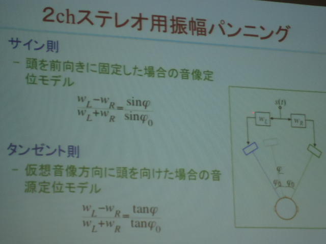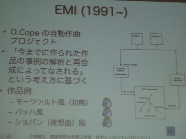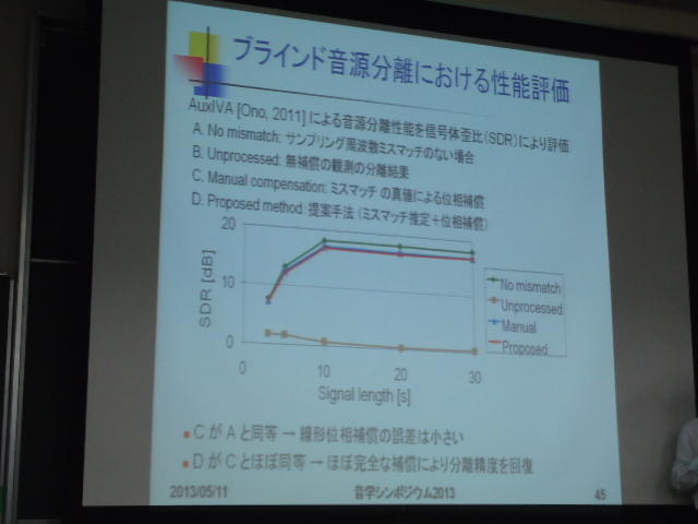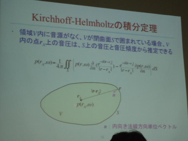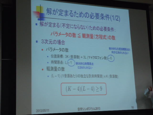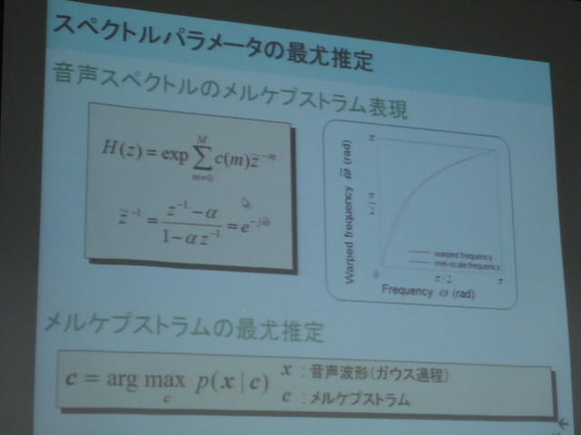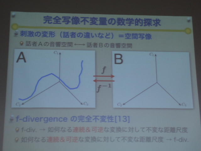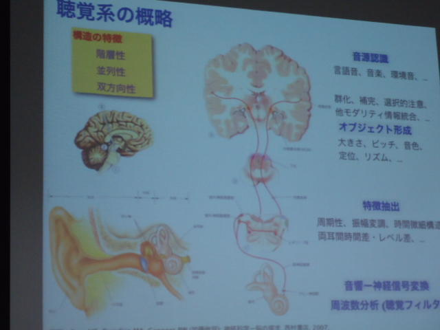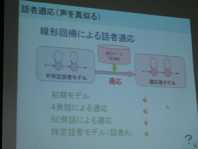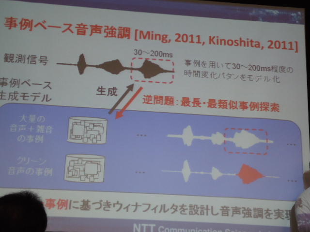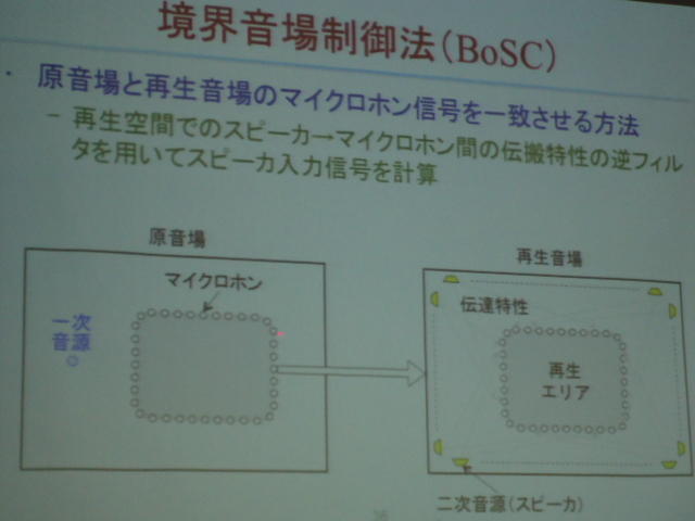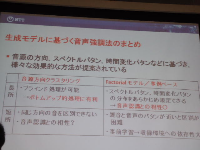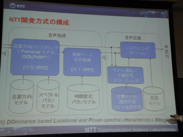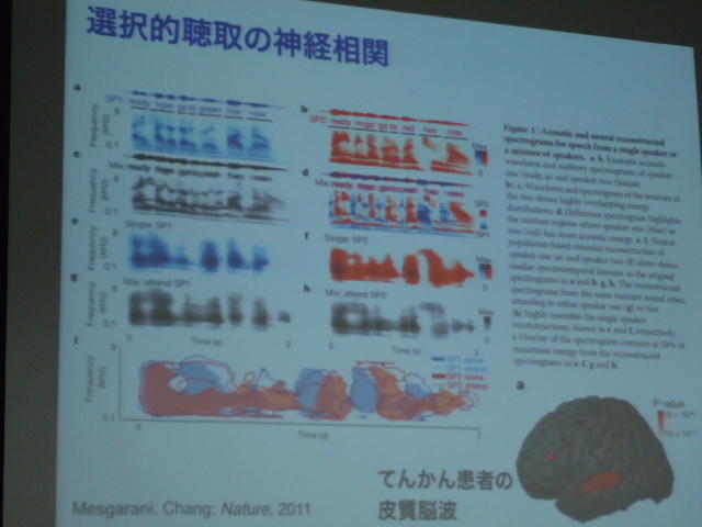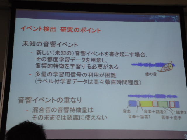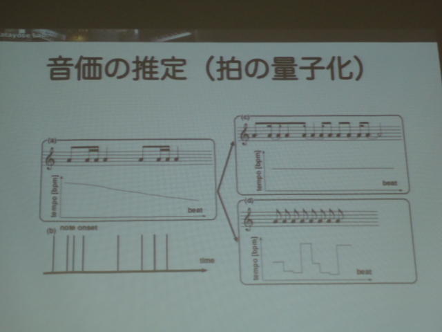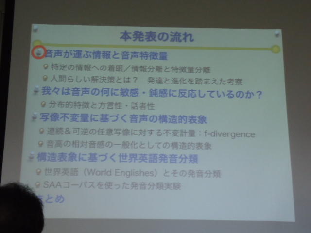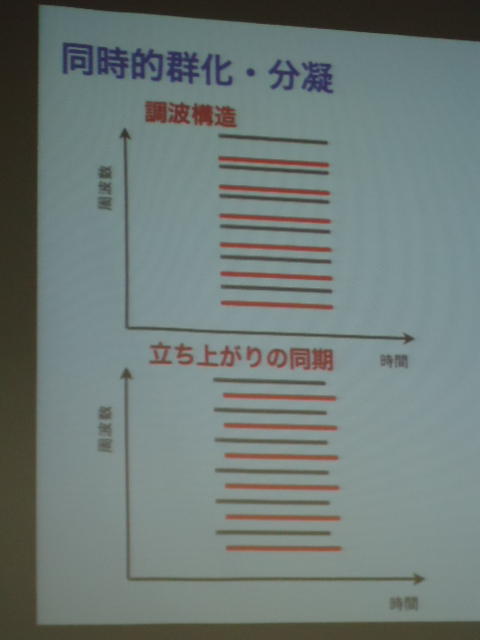 今回初めて東京のお茶の水女子大学から開けた音楽情報学研究会に参加しました。 今年の研究会は土日二日間 続けていて午前3時間と午後の3時間は大学の 先生や企業の研究者の最近の研究の動向や新しい技術 などの発表を聞くことが 出来たので新しい作品を作ることについてたくさんのアイディアをもらえる機会に なってましたし、午後に1時間半ずつ進行し、自分も参加したポスターセッションでは 色んな 研究者や先生に自分の作品を含めSUACの様々の作品のことについて発表 しつつ、質問や意見をもらい自分の作品の長所と短所について分かるいい機会ですた。 二日のスケジュールは大変だった けど自分の経験や知識が広がるいい経験でした。 このような機会に参加できるようにたくさんのことを手伝ってくれた長嶋先生に 大変お世話になりましたので感謝申し上げます。■2013-MUS-99 招待講演memo (長嶋)■ (1) 音声認識の方法論に関する考察-歴史的変遷と今後の展望- 河原 達也 ・音声認識は最近よくなった - Siri、放送の字幕、国会の議事録 ・音声認識はメディアアートの対象として面白いか? ・大規模コーパス ・DNN - Deep Neural Network (2) 統計的機械学習問題としての音声合成 徳田 恵一 ・波形の接続による音声合成(コーパスベース) ・ボーカロイドは単一音素(単一インベントリ・ダイフォン音声合成)によるコーパスベース (「あ」は1個しかない) ・過去「音声認識は技術、音声合成は芸術」 ・HMM音声合成→統計的パラメトリック音声合成 →「音声認識は技術、音声合成も技術」としていきたい ・図式としては分析合成方式の音響合成とあまり変わらない ・HMMとかNNとかにあまりソソラレない自分がいる(^_^;) ・補間、外挿(補外)のパラメータをライブ制御できるか? → できる(^_^) ・1次元(2要素)の補間だけでなく2次元の空間で補間・外挿できるか? → できる(^_^) パラメータ(軸)の選び方が重要となる (3) 聴覚における寸法知覚と最適末梢系 入野 俊夫 ・聴覚の基礎(生理学的) ・蝸牛-基底振動膜振動 ・信号処理的最適性→最小不確定性 ・○音聲 ×音声、音声には耳があるのだ ! ・音声 = 音響管 + 音源 → これはインスタになるのでは?? ・聴覚では声道長を認識して大人か子供かを区別している ・音源の寸法知覚(大人の声←→子供の声) 5%、母音だけだと悪化、30ms持続すればOK ・音のラウドネス 10%、ピッチ 1%、光の明るさ 15% ・Mellin変換 - Wavelet(スケール変形)を正規化する手法 ★調べる事 メリンオペレータ(時間×周波数) - 無次元 ・最適解 - ガンマチャープ gammacharp (4) 聴覚情景分析と選択的聴取の脳内メカニズム 柏野 牧夫 ・聴覚情景分析 ・カクテルパーティ ・出現は消失より顕著 (脳内では注意しないと見失う) ・Auditory Scene Analysis ・音脈(stream) ・実環境で起こりがちな現象を事前知識として利用している(無意識にと) ・特徴の隔たりを利用した音脈分疑 ・時間的相関を利用した音脈分疑 ・共変する音響特徴は一つの音脈に群化 ・反復共起に基づく音脈分疑 ・未学習のノイズであっても反復登場すると注意しなくても音響として群化・認識される (DJなどの応用に効く) ・階層的スパース表現の獲得 同時的群化→反復共起 ・聴覚系は階層性・並列性だけでなく双方向性がある ・音脈「知覚」はどこで成立するのか - 分かっていない ・fMRIなど脳内活動にあまりソソラレない自分がいる(^_^;) ・0.5Hzあたりのモジュレーションを引き込むメカニズムが重要では? (30)非同期録音機器を用いたマイクロフォンアレイ信号処理 小野 順貴 ・マイクロフォンアレイの音源分離 - まぁ当然 ・非同期録音機器を利用したアレイ信号処理 ・マルチマイク音源分離にあまりソソラレない自分がいる(^_^;) (31)三次元音場再現方式の概要 安藤 彰男 ・多スピーカで何が出来るか - ネタの宝庫? ・3次元音響(臨場感)の分類 チャネルベースシステム オブジェクトベースシステム シーンベースシスム ・原理による分類 心理音響モデル 物理音響モデル ・2chステレオにおける音像定位 中低域 - 両耳における位相差 広域 - 両耳における強度差 ・中低域はレベル差は小さいので1スピーカでOK ・高域は左右の位相差は分からないのでレベル差で検出 ・サイン則(頭の向きは固定)とタンゼント則(音源の方を向く) ・ミキサーはサイン則 ・あとはノウハウでいい音を作る ・Wave Field Synthesis (WFS) シーンベースからオブジェクトベースに行ける ・球面調和関数によるモデル Max6でシミュレーションできるカモ・・・・ ・音圧をあらわす式には進行波と後退波が現れる ・パラメトリックスピーカアレイの直進スピーカについては? → NHKからは何も出てこない(^_^;) ・NHKではチャンネルごとに別ソースというのは送らない (32)音楽の生成と理解 片寄 晴弘 ・イリアック組曲からCrestMuseまで ・生成理解系の研究はおいしい ・スクリーン写真撮りに没頭 (33)未来を切り拓く音楽情報処理 後藤 真孝 ・後藤パワー炸裂(^_^) ・コンピュータが自動作曲した音楽をコンピュータが自動鑑賞評価