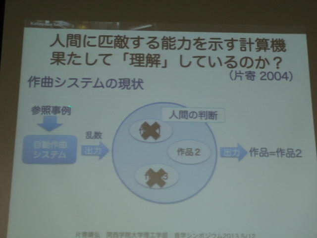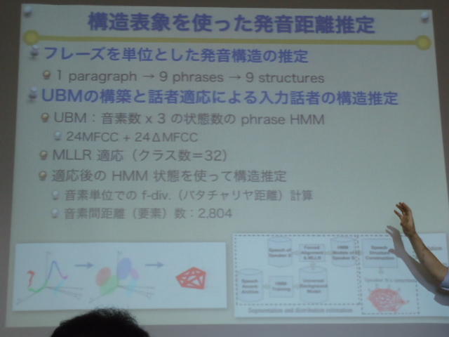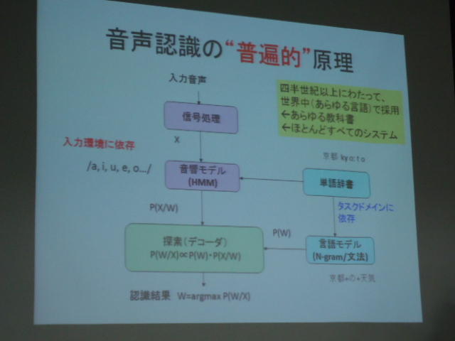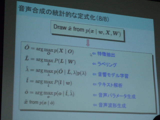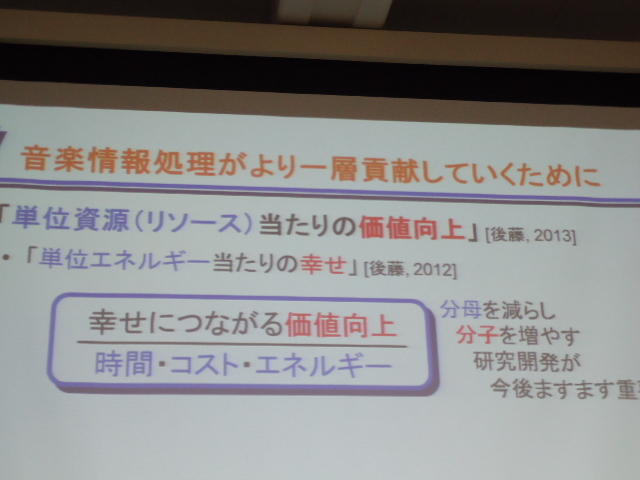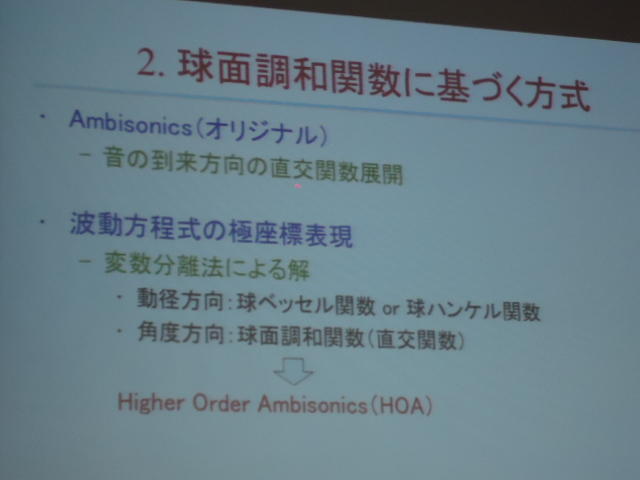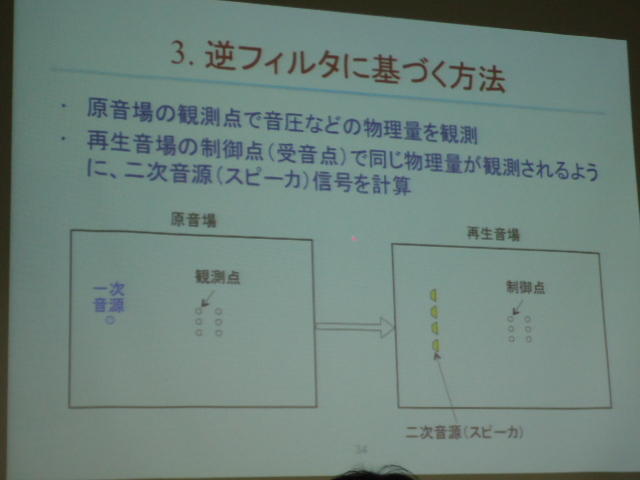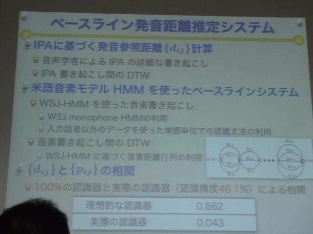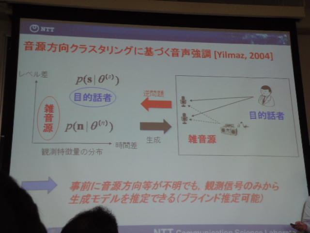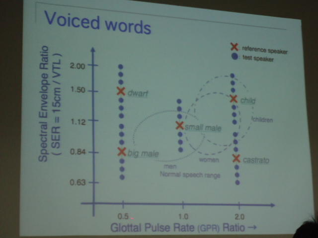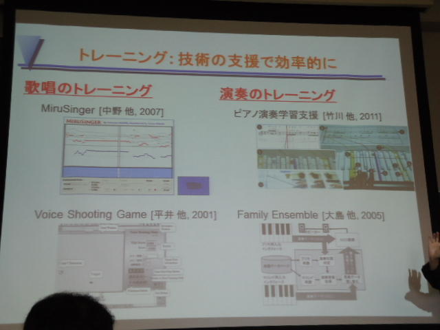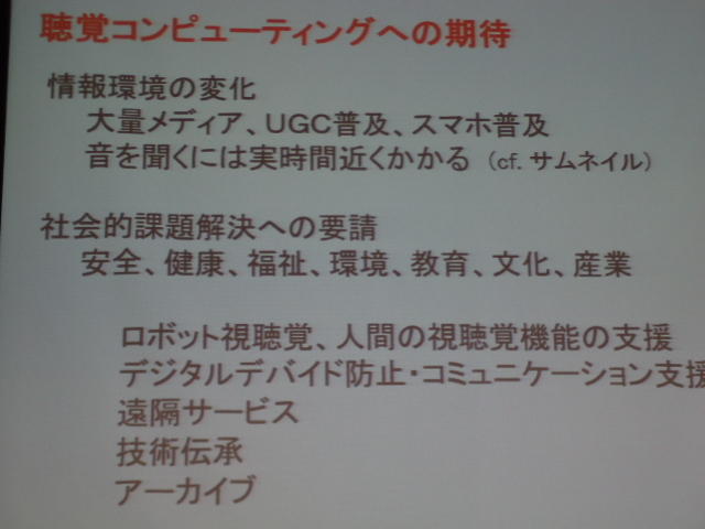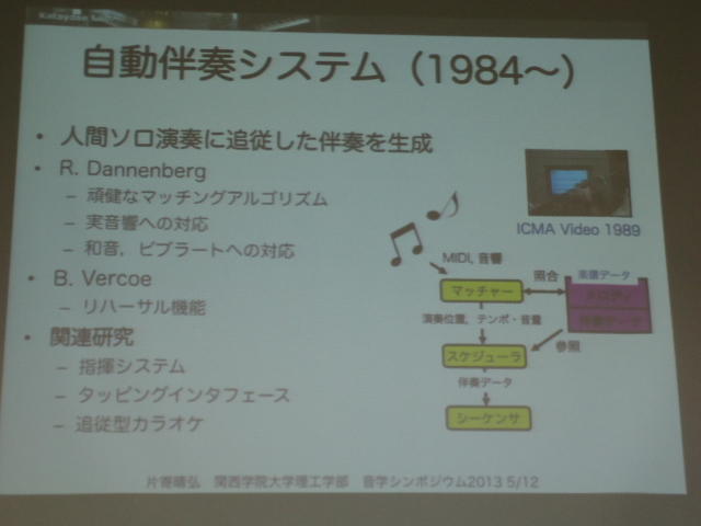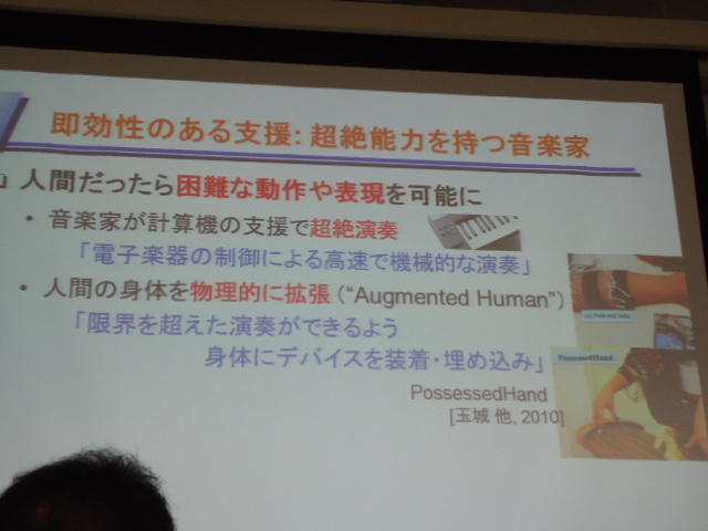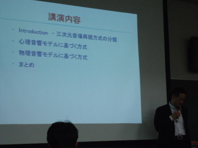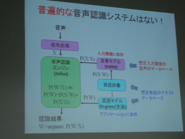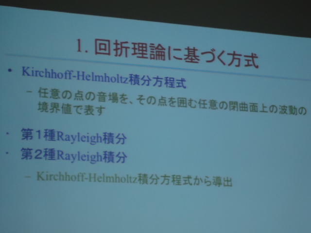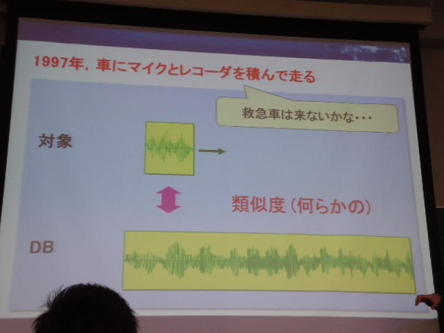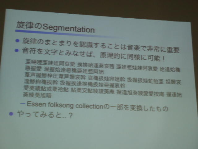 今回初めて東京のお茶の水女子大学から開けた音楽情報学研究会に参加しました。 今年の研究会は土日二日間 続けていて午前3時間と午後の3時間は大学の 先生や企業の研究者の最近の研究の動向や新しい技術 などの発表を聞くことが 出来たので新しい作品を作ることについてたくさんのアイディアをもらえる機会に なってましたし、午後に1時間半ずつ進行し、自分も参加したポスターセッションでは 色んな 研究者や先生に自分の作品を含めSUACの様々の作品のことについて発表 しつつ、質問や意見をもらい自分の作品の長所と短所について分かるいい機会ですた。 二日のスケジュールは大変だった けど自分の経験や知識が広がるいい経験でした。 このような機会に参加できるようにたくさんのことを手伝ってくれた長嶋先生に 大変お世話になりましたので感謝申し上げます。■2013-MUS-99 招待講演memo (長嶋)■ (1) 音声認識の方法論に関する考察-歴史的変遷と今後の展望- 河原 達也 ・音声認識は最近よくなった - Siri、放送の字幕、国会の議事録 ・音声認識はメディアアートの対象として面白いか? ・大規模コーパス ・DNN - Deep Neural Network (2) 統計的機械学習問題としての音声合成 徳田 恵一 ・波形の接続による音声合成(コーパスベース) ・ボーカロイドは単一音素(単一インベントリ・ダイフォン音声合成)によるコーパスベース (「あ」は1個しかない) ・過去「音声認識は技術、音声合成は芸術」 ・HMM音声合成→統計的パラメトリック音声合成 →「音声認識は技術、音声合成も技術」としていきたい ・図式としては分析合成方式の音響合成とあまり変わらない ・HMMとかNNとかにあまりソソラレない自分がいる(^_^;) ・補間、外挿(補外)のパラメータをライブ制御できるか? → できる(^_^) ・1次元(2要素)の補間だけでなく2次元の空間で補間・外挿できるか? → できる(^_^) パラメータ(軸)の選び方が重要となる (3) 聴覚における寸法知覚と最適末梢系 入野 俊夫 ・聴覚の基礎(生理学的) ・蝸牛-基底振動膜振動 ・信号処理的最適性→最小不確定性 ・○音聲 ×音声、音声には耳があるのだ ! ・音声 = 音響管 + 音源 → これはインスタになるのでは?? ・聴覚では声道長を認識して大人か子供かを区別している ・音源の寸法知覚(大人の声←→子供の声) 5%、母音だけだと悪化、30ms持続すればOK ・音のラウドネス 10%、ピッチ 1%、光の明るさ 15% ・Mellin変換 - Wavelet(スケール変形)を正規化する手法 ★調べる事 メリンオペレータ(時間×周波数) - 無次元 ・最適解 - ガンマチャープ gammacharp (4) 聴覚情景分析と選択的聴取の脳内メカニズム 柏野 牧夫 ・聴覚情景分析 ・カクテルパーティ ・出現は消失より顕著 (脳内では注意しないと見失う) ・Auditory Scene Analysis ・音脈(stream) ・実環境で起こりがちな現象を事前知識として利用している(無意識にと) ・特徴の隔たりを利用した音脈分疑 ・時間的相関を利用した音脈分疑 ・共変する音響特徴は一つの音脈に群化 ・反復共起に基づく音脈分疑 ・未学習のノイズであっても反復登場すると注意しなくても音響として群化・認識される (DJなどの応用に効く) ・階層的スパース表現の獲得 同時的群化→反復共起 ・聴覚系は階層性・並列性だけでなく双方向性がある ・音脈「知覚」はどこで成立するのか - 分かっていない ・fMRIなど脳内活動にあまりソソラレない自分がいる(^_^;) ・0.5Hzあたりのモジュレーションを引き込むメカニズムが重要では? (30)非同期録音機器を用いたマイクロフォンアレイ信号処理 小野 順貴 ・マイクロフォンアレイの音源分離 - まぁ当然 ・非同期録音機器を利用したアレイ信号処理 ・マルチマイク音源分離にあまりソソラレない自分がいる(^_^;) (31)三次元音場再現方式の概要 安藤 彰男 ・多スピーカで何が出来るか - ネタの宝庫? ・3次元音響(臨場感)の分類 チャネルベースシステム オブジェクトベースシステム シーンベースシスム ・原理による分類 心理音響モデル 物理音響モデル ・2chステレオにおける音像定位 中低域 - 両耳における位相差 広域 - 両耳における強度差 ・中低域はレベル差は小さいので1スピーカでOK ・高域は左右の位相差は分からないのでレベル差で検出 ・サイン則(頭の向きは固定)とタンゼント則(音源の方を向く) ・ミキサーはサイン則 ・あとはノウハウでいい音を作る ・Wave Field Synthesis (WFS) シーンベースからオブジェクトベースに行ける ・球面調和関数によるモデル Max6でシミュレーションできるカモ・・・・ ・音圧をあらわす式には進行波と後退波が現れる ・パラメトリックスピーカアレイの直進スピーカについては? → NHKからは何も出てこない(^_^;) ・NHKではチャンネルごとに別ソースというのは送らない (32)音楽の生成と理解 片寄 晴弘 ・イリアック組曲からCrestMuseまで ・生成理解系の研究はおいしい ・スクリーン写真撮りに没頭 (33)未来を切り拓く音楽情報処理 後藤 真孝 ・後藤パワー炸裂(^_^) ・コンピュータが自動作曲した音楽をコンピュータが自動鑑賞評価