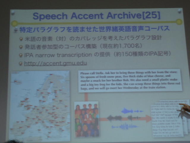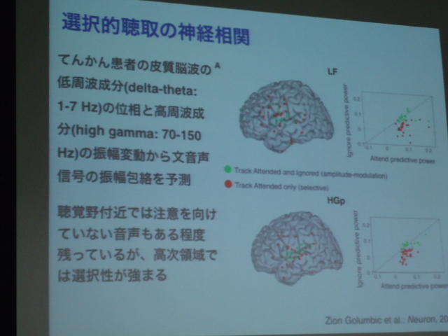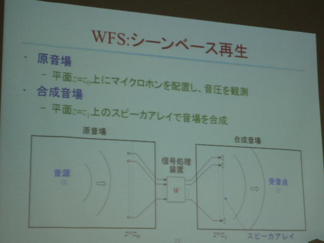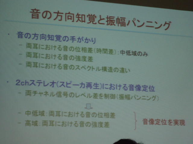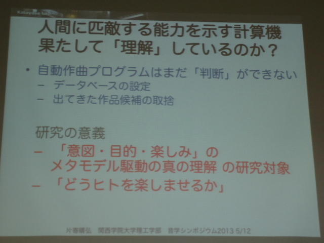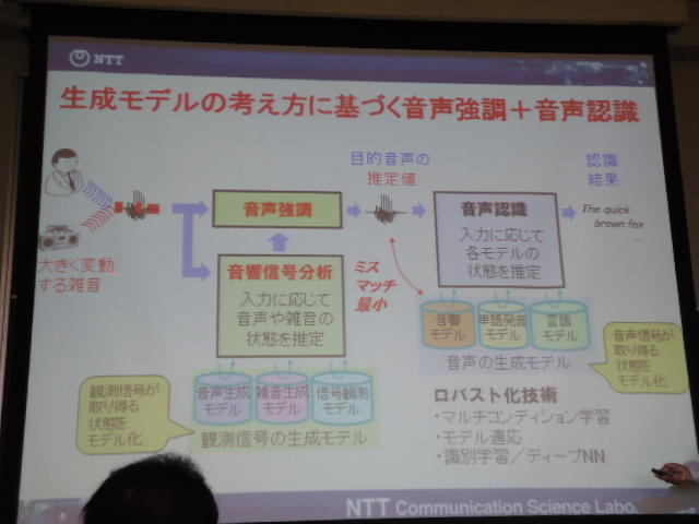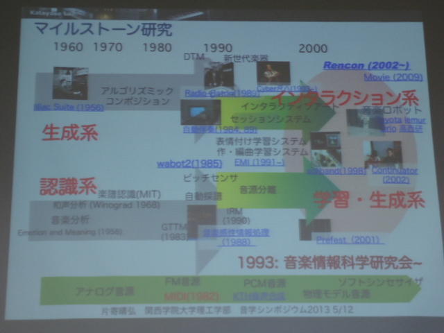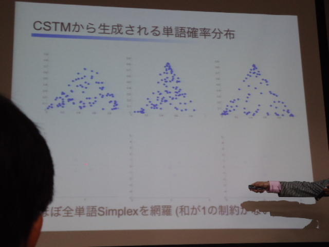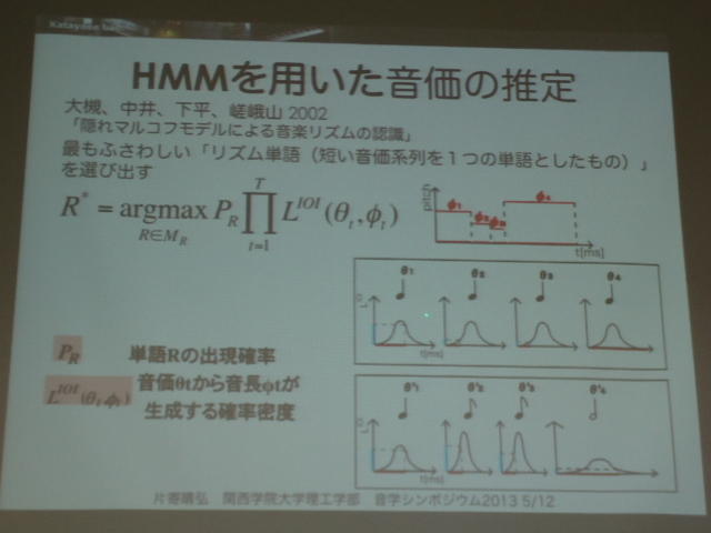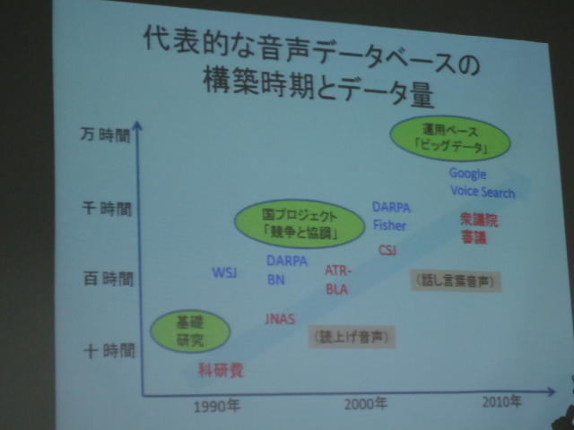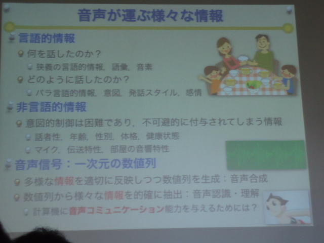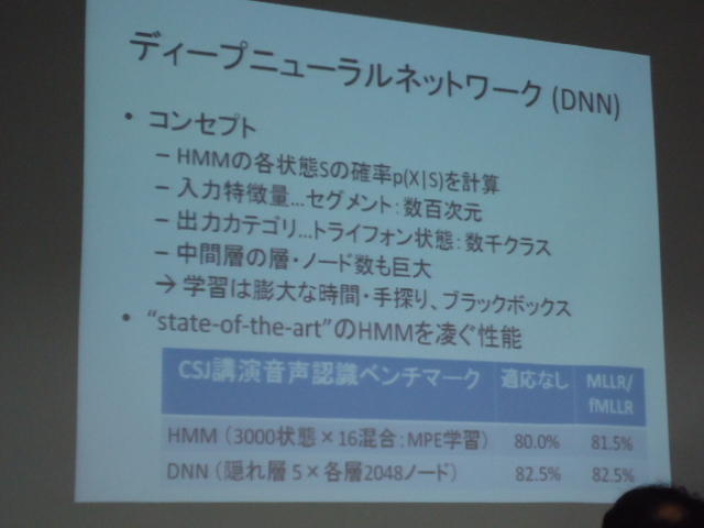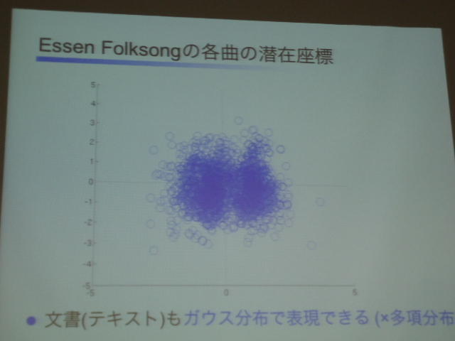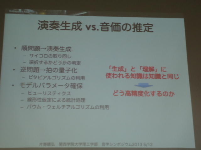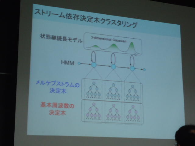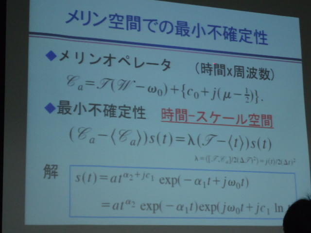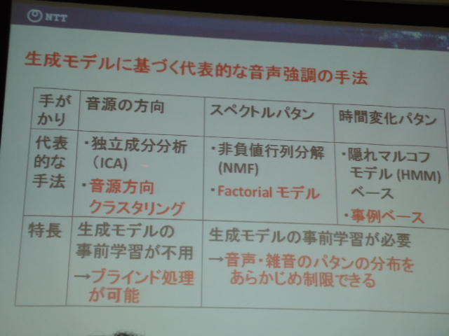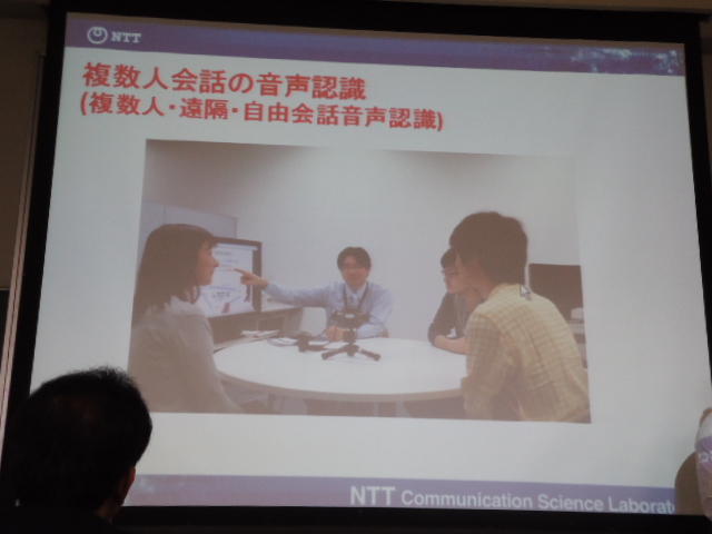 今回初めて東京のお茶の水女子大学から開けた音楽情報学研究会に参加しました。 今年の研究会は土日二日間 続けていて午前3時間と午後の3時間は大学の 先生や企業の研究者の最近の研究の動向や新しい技術 などの発表を聞くことが 出来たので新しい作品を作ることについてたくさんのアイディアをもらえる機会に なってましたし、午後に1時間半ずつ進行し、自分も参加したポスターセッションでは 色んな 研究者や先生に自分の作品を含めSUACの様々の作品のことについて発表 しつつ、質問や意見をもらい自分の作品の長所と短所について分かるいい機会ですた。 二日のスケジュールは大変だった けど自分の経験や知識が広がるいい経験でした。 このような機会に参加できるようにたくさんのことを手伝ってくれた長嶋先生に 大変お世話になりましたので感謝申し上げます。■2013-MUS-99 招待講演memo (長嶋)■ (1) 音声認識の方法論に関する考察-歴史的変遷と今後の展望- 河原 達也 ・音声認識は最近よくなった - Siri、放送の字幕、国会の議事録 ・音声認識はメディアアートの対象として面白いか? ・大規模コーパス ・DNN - Deep Neural Network (2) 統計的機械学習問題としての音声合成 徳田 恵一 ・波形の接続による音声合成(コーパスベース) ・ボーカロイドは単一音素(単一インベントリ・ダイフォン音声合成)によるコーパスベース (「あ」は1個しかない) ・過去「音声認識は技術、音声合成は芸術」 ・HMM音声合成→統計的パラメトリック音声合成 →「音声認識は技術、音声合成も技術」としていきたい ・図式としては分析合成方式の音響合成とあまり変わらない ・HMMとかNNとかにあまりソソラレない自分がいる(^_^;) ・補間、外挿(補外)のパラメータをライブ制御できるか? → できる(^_^) ・1次元(2要素)の補間だけでなく2次元の空間で補間・外挿できるか? → できる(^_^) パラメータ(軸)の選び方が重要となる (3) 聴覚における寸法知覚と最適末梢系 入野 俊夫 ・聴覚の基礎(生理学的) ・蝸牛-基底振動膜振動 ・信号処理的最適性→最小不確定性 ・○音聲 ×音声、音声には耳があるのだ ! ・音声 = 音響管 + 音源 → これはインスタになるのでは?? ・聴覚では声道長を認識して大人か子供かを区別している ・音源の寸法知覚(大人の声←→子供の声) 5%、母音だけだと悪化、30ms持続すればOK ・音のラウドネス 10%、ピッチ 1%、光の明るさ 15% ・Mellin変換 - Wavelet(スケール変形)を正規化する手法 ★調べる事 メリンオペレータ(時間×周波数) - 無次元 ・最適解 - ガンマチャープ gammacharp (4) 聴覚情景分析と選択的聴取の脳内メカニズム 柏野 牧夫 ・聴覚情景分析 ・カクテルパーティ ・出現は消失より顕著 (脳内では注意しないと見失う) ・Auditory Scene Analysis ・音脈(stream) ・実環境で起こりがちな現象を事前知識として利用している(無意識にと) ・特徴の隔たりを利用した音脈分疑 ・時間的相関を利用した音脈分疑 ・共変する音響特徴は一つの音脈に群化 ・反復共起に基づく音脈分疑 ・未学習のノイズであっても反復登場すると注意しなくても音響として群化・認識される (DJなどの応用に効く) ・階層的スパース表現の獲得 同時的群化→反復共起 ・聴覚系は階層性・並列性だけでなく双方向性がある ・音脈「知覚」はどこで成立するのか - 分かっていない ・fMRIなど脳内活動にあまりソソラレない自分がいる(^_^;) ・0.5Hzあたりのモジュレーションを引き込むメカニズムが重要では? (30)非同期録音機器を用いたマイクロフォンアレイ信号処理 小野 順貴 ・マイクロフォンアレイの音源分離 - まぁ当然 ・非同期録音機器を利用したアレイ信号処理 ・マルチマイク音源分離にあまりソソラレない自分がいる(^_^;) (31)三次元音場再現方式の概要 安藤 彰男 ・多スピーカで何が出来るか - ネタの宝庫? ・3次元音響(臨場感)の分類 チャネルベースシステム オブジェクトベースシステム シーンベースシスム ・原理による分類 心理音響モデル 物理音響モデル ・2chステレオにおける音像定位 中低域 - 両耳における位相差 広域 - 両耳における強度差 ・中低域はレベル差は小さいので1スピーカでOK ・高域は左右の位相差は分からないのでレベル差で検出 ・サイン則(頭の向きは固定)とタンゼント則(音源の方を向く) ・ミキサーはサイン則 ・あとはノウハウでいい音を作る ・Wave Field Synthesis (WFS) シーンベースからオブジェクトベースに行ける ・球面調和関数によるモデル Max6でシミュレーションできるカモ・・・・ ・音圧をあらわす式には進行波と後退波が現れる ・パラメトリックスピーカアレイの直進スピーカについては? → NHKからは何も出てこない(^_^;) ・NHKではチャンネルごとに別ソースというのは送らない (32)音楽の生成と理解 片寄 晴弘 ・イリアック組曲からCrestMuseまで ・生成理解系の研究はおいしい ・スクリーン写真撮りに没頭 (33)未来を切り拓く音楽情報処理 後藤 真孝 ・後藤パワー炸裂(^_^) ・コンピュータが自動作曲した音楽をコンピュータが自動鑑賞評価