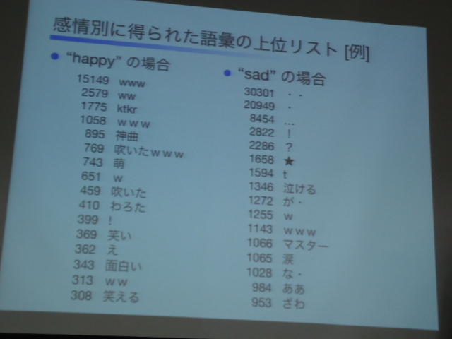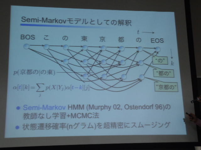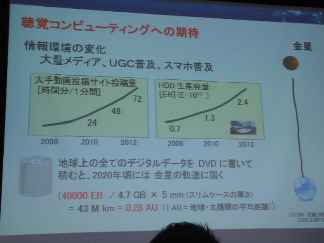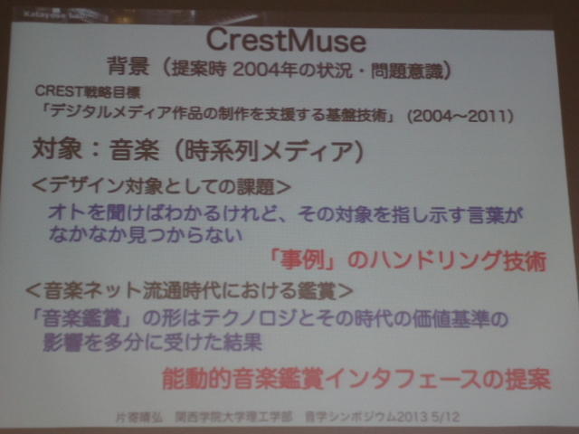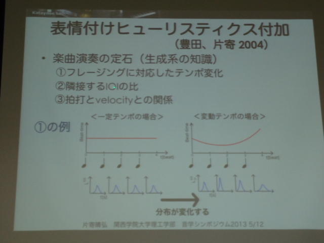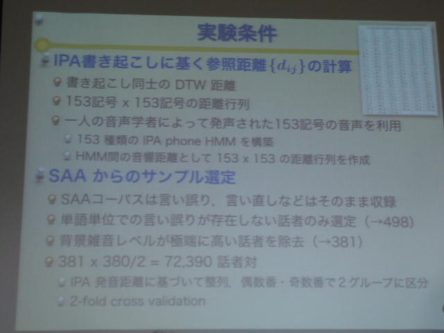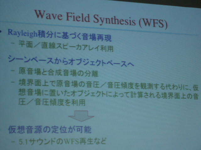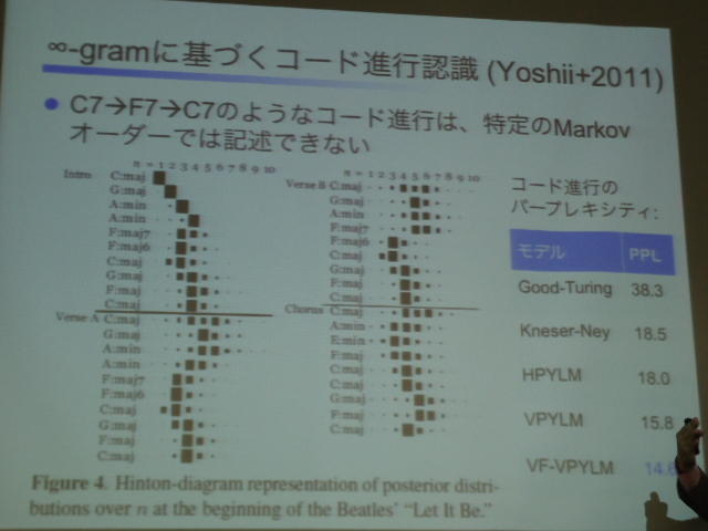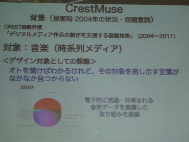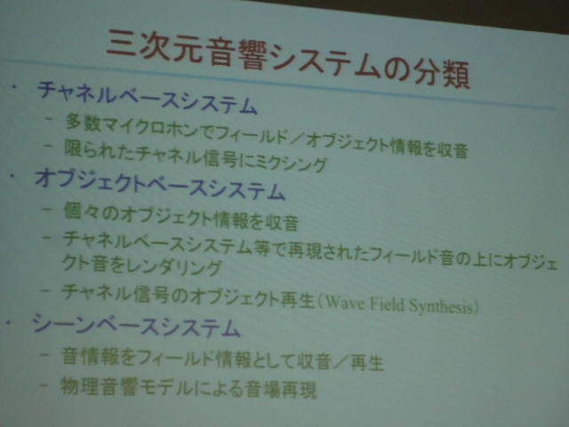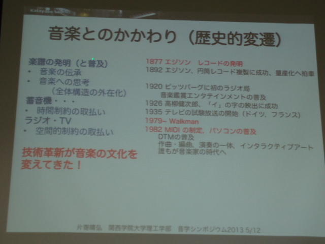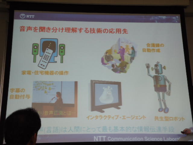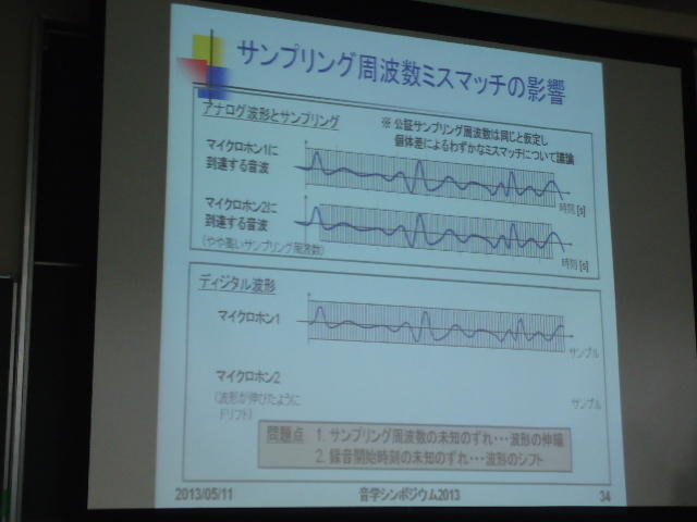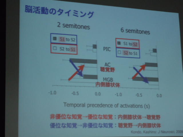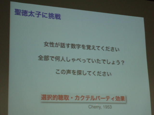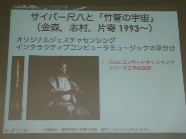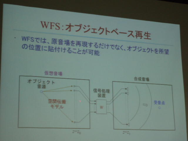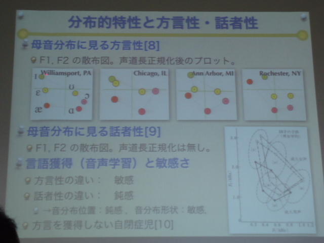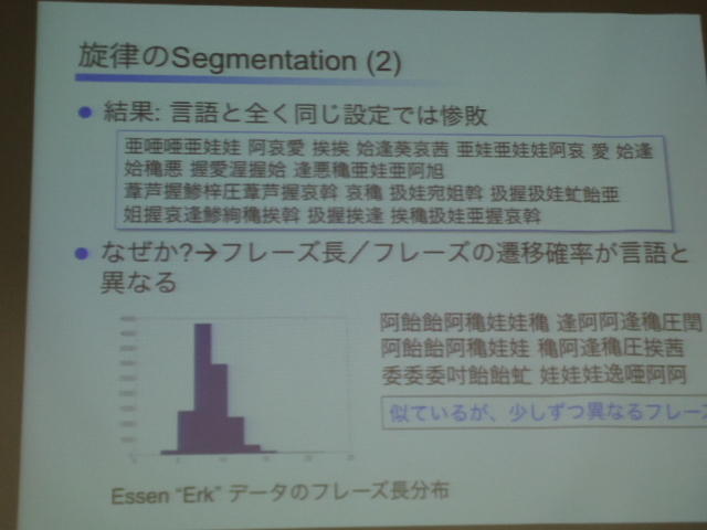 今回初めて東京のお茶の水女子大学から開けた音楽情報学研究会に参加しました。 今年の研究会は土日二日間 続けていて午前3時間と午後の3時間は大学の 先生や企業の研究者の最近の研究の動向や新しい技術 などの発表を聞くことが 出来たので新しい作品を作ることについてたくさんのアイディアをもらえる機会に なってましたし、午後に1時間半ずつ進行し、自分も参加したポスターセッションでは 色んな 研究者や先生に自分の作品を含めSUACの様々の作品のことについて発表 しつつ、質問や意見をもらい自分の作品の長所と短所について分かるいい機会ですた。 二日のスケジュールは大変だった けど自分の経験や知識が広がるいい経験でした。 このような機会に参加できるようにたくさんのことを手伝ってくれた長嶋先生に 大変お世話になりましたので感謝申し上げます。■2013-MUS-99 招待講演memo (長嶋)■ (1) 音声認識の方法論に関する考察-歴史的変遷と今後の展望- 河原 達也 ・音声認識は最近よくなった - Siri、放送の字幕、国会の議事録 ・音声認識はメディアアートの対象として面白いか? ・大規模コーパス ・DNN - Deep Neural Network (2) 統計的機械学習問題としての音声合成 徳田 恵一 ・波形の接続による音声合成(コーパスベース) ・ボーカロイドは単一音素(単一インベントリ・ダイフォン音声合成)によるコーパスベース (「あ」は1個しかない) ・過去「音声認識は技術、音声合成は芸術」 ・HMM音声合成→統計的パラメトリック音声合成 →「音声認識は技術、音声合成も技術」としていきたい ・図式としては分析合成方式の音響合成とあまり変わらない ・HMMとかNNとかにあまりソソラレない自分がいる(^_^;) ・補間、外挿(補外)のパラメータをライブ制御できるか? → できる(^_^) ・1次元(2要素)の補間だけでなく2次元の空間で補間・外挿できるか? → できる(^_^) パラメータ(軸)の選び方が重要となる (3) 聴覚における寸法知覚と最適末梢系 入野 俊夫 ・聴覚の基礎(生理学的) ・蝸牛-基底振動膜振動 ・信号処理的最適性→最小不確定性 ・○音聲 ×音声、音声には耳があるのだ ! ・音声 = 音響管 + 音源 → これはインスタになるのでは?? ・聴覚では声道長を認識して大人か子供かを区別している ・音源の寸法知覚(大人の声←→子供の声) 5%、母音だけだと悪化、30ms持続すればOK ・音のラウドネス 10%、ピッチ 1%、光の明るさ 15% ・Mellin変換 - Wavelet(スケール変形)を正規化する手法 ★調べる事 メリンオペレータ(時間×周波数) - 無次元 ・最適解 - ガンマチャープ gammacharp (4) 聴覚情景分析と選択的聴取の脳内メカニズム 柏野 牧夫 ・聴覚情景分析 ・カクテルパーティ ・出現は消失より顕著 (脳内では注意しないと見失う) ・Auditory Scene Analysis ・音脈(stream) ・実環境で起こりがちな現象を事前知識として利用している(無意識にと) ・特徴の隔たりを利用した音脈分疑 ・時間的相関を利用した音脈分疑 ・共変する音響特徴は一つの音脈に群化 ・反復共起に基づく音脈分疑 ・未学習のノイズであっても反復登場すると注意しなくても音響として群化・認識される (DJなどの応用に効く) ・階層的スパース表現の獲得 同時的群化→反復共起 ・聴覚系は階層性・並列性だけでなく双方向性がある ・音脈「知覚」はどこで成立するのか - 分かっていない ・fMRIなど脳内活動にあまりソソラレない自分がいる(^_^;) ・0.5Hzあたりのモジュレーションを引き込むメカニズムが重要では? (30)非同期録音機器を用いたマイクロフォンアレイ信号処理 小野 順貴 ・マイクロフォンアレイの音源分離 - まぁ当然 ・非同期録音機器を利用したアレイ信号処理 ・マルチマイク音源分離にあまりソソラレない自分がいる(^_^;) (31)三次元音場再現方式の概要 安藤 彰男 ・多スピーカで何が出来るか - ネタの宝庫? ・3次元音響(臨場感)の分類 チャネルベースシステム オブジェクトベースシステム シーンベースシスム ・原理による分類 心理音響モデル 物理音響モデル ・2chステレオにおける音像定位 中低域 - 両耳における位相差 広域 - 両耳における強度差 ・中低域はレベル差は小さいので1スピーカでOK ・高域は左右の位相差は分からないのでレベル差で検出 ・サイン則(頭の向きは固定)とタンゼント則(音源の方を向く) ・ミキサーはサイン則 ・あとはノウハウでいい音を作る ・Wave Field Synthesis (WFS) シーンベースからオブジェクトベースに行ける ・球面調和関数によるモデル Max6でシミュレーションできるカモ・・・・ ・音圧をあらわす式には進行波と後退波が現れる ・パラメトリックスピーカアレイの直進スピーカについては? → NHKからは何も出てこない(^_^;) ・NHKではチャンネルごとに別ソースというのは送らない (32)音楽の生成と理解 片寄 晴弘 ・イリアック組曲からCrestMuseまで ・生成理解系の研究はおいしい ・スクリーン写真撮りに没頭 (33)未来を切り拓く音楽情報処理 後藤 真孝 ・後藤パワー炸裂(^_^) ・コンピュータが自動作曲した音楽をコンピュータが自動鑑賞評価