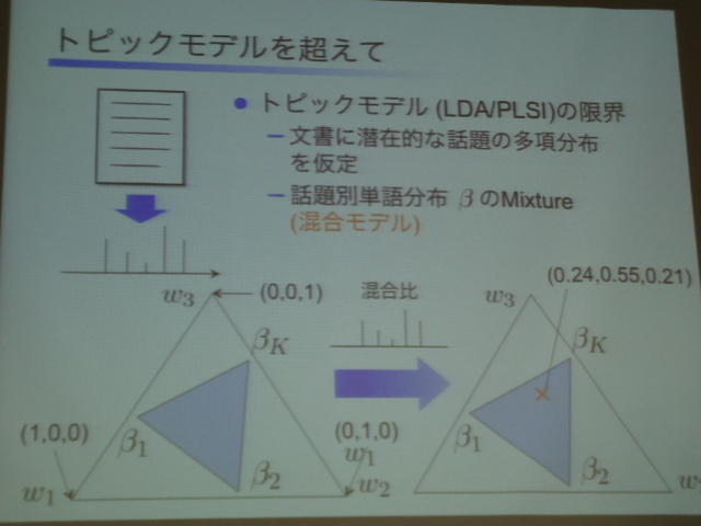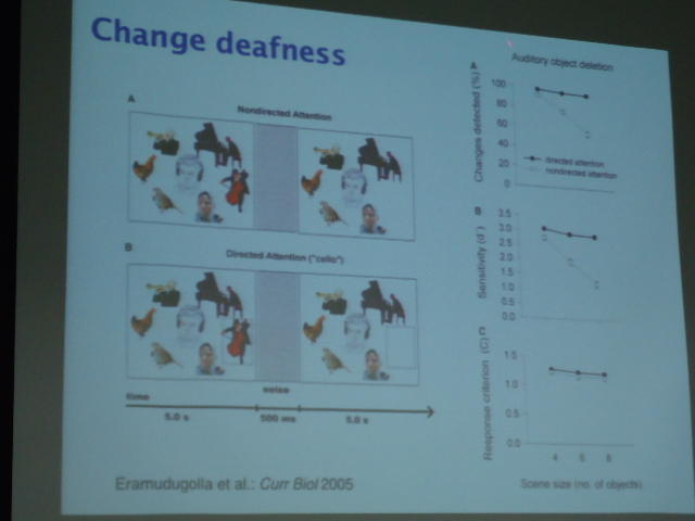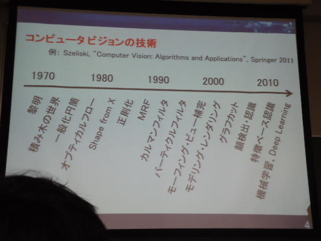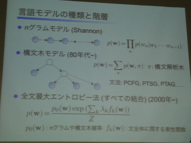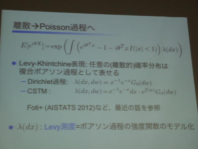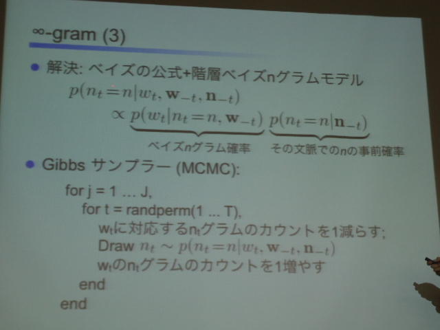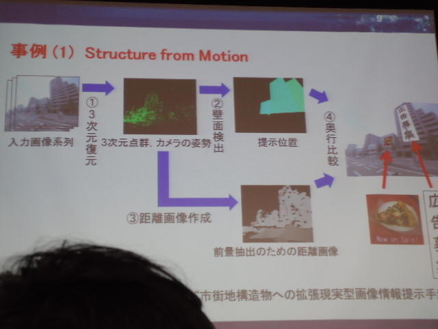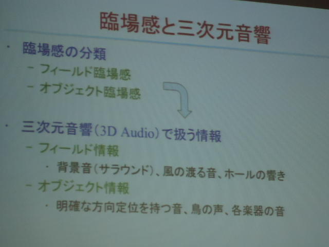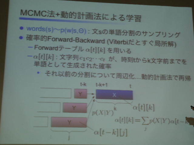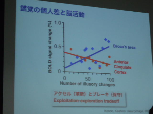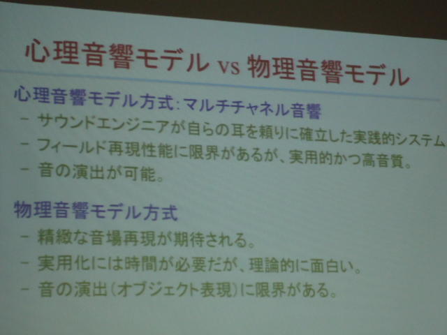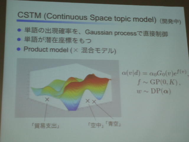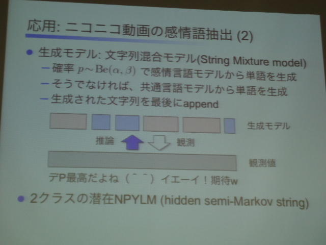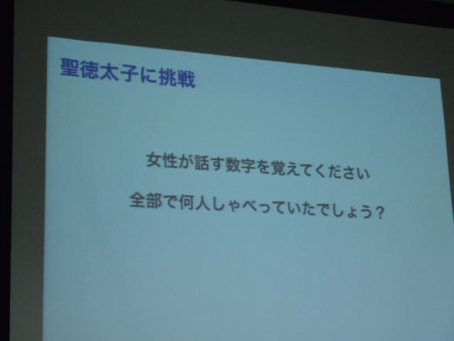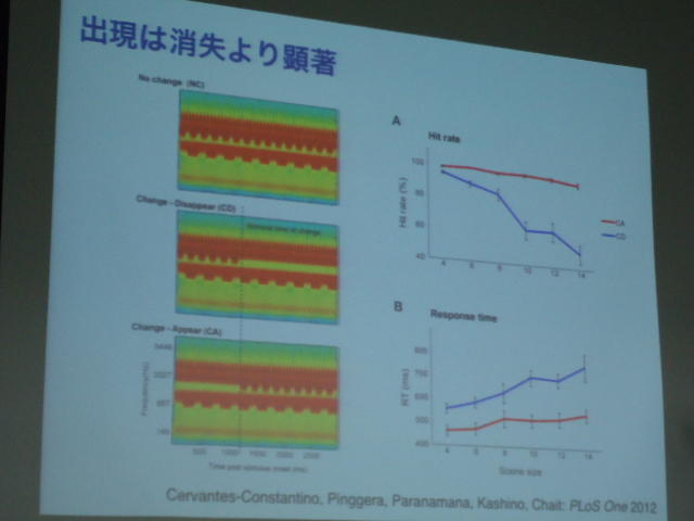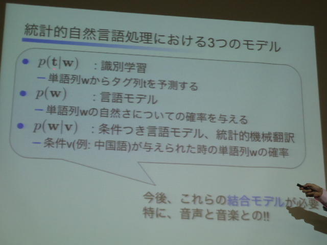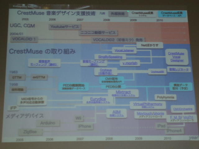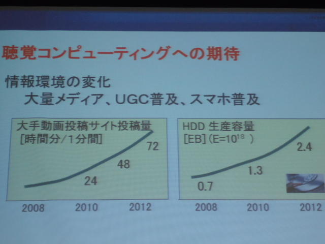 今回初めて東京のお茶の水女子大学から開けた音楽情報学研究会に参加しました。 今年の研究会は土日二日間 続けていて午前3時間と午後の3時間は大学の 先生や企業の研究者の最近の研究の動向や新しい技術 などの発表を聞くことが 出来たので新しい作品を作ることについてたくさんのアイディアをもらえる機会に なってましたし、午後に1時間半ずつ進行し、自分も参加したポスターセッションでは 色んな 研究者や先生に自分の作品を含めSUACの様々の作品のことについて発表 しつつ、質問や意見をもらい自分の作品の長所と短所について分かるいい機会ですた。 二日のスケジュールは大変だった けど自分の経験や知識が広がるいい経験でした。 このような機会に参加できるようにたくさんのことを手伝ってくれた長嶋先生に 大変お世話になりましたので感謝申し上げます。■2013-MUS-99 招待講演memo (長嶋)■ (1) 音声認識の方法論に関する考察-歴史的変遷と今後の展望- 河原 達也 ・音声認識は最近よくなった - Siri、放送の字幕、国会の議事録 ・音声認識はメディアアートの対象として面白いか? ・大規模コーパス ・DNN - Deep Neural Network (2) 統計的機械学習問題としての音声合成 徳田 恵一 ・波形の接続による音声合成(コーパスベース) ・ボーカロイドは単一音素(単一インベントリ・ダイフォン音声合成)によるコーパスベース (「あ」は1個しかない) ・過去「音声認識は技術、音声合成は芸術」 ・HMM音声合成→統計的パラメトリック音声合成 →「音声認識は技術、音声合成も技術」としていきたい ・図式としては分析合成方式の音響合成とあまり変わらない ・HMMとかNNとかにあまりソソラレない自分がいる(^_^;) ・補間、外挿(補外)のパラメータをライブ制御できるか? → できる(^_^) ・1次元(2要素)の補間だけでなく2次元の空間で補間・外挿できるか? → できる(^_^) パラメータ(軸)の選び方が重要となる (3) 聴覚における寸法知覚と最適末梢系 入野 俊夫 ・聴覚の基礎(生理学的) ・蝸牛-基底振動膜振動 ・信号処理的最適性→最小不確定性 ・○音聲 ×音声、音声には耳があるのだ ! ・音声 = 音響管 + 音源 → これはインスタになるのでは?? ・聴覚では声道長を認識して大人か子供かを区別している ・音源の寸法知覚(大人の声←→子供の声) 5%、母音だけだと悪化、30ms持続すればOK ・音のラウドネス 10%、ピッチ 1%、光の明るさ 15% ・Mellin変換 - Wavelet(スケール変形)を正規化する手法 ★調べる事 メリンオペレータ(時間×周波数) - 無次元 ・最適解 - ガンマチャープ gammacharp (4) 聴覚情景分析と選択的聴取の脳内メカニズム 柏野 牧夫 ・聴覚情景分析 ・カクテルパーティ ・出現は消失より顕著 (脳内では注意しないと見失う) ・Auditory Scene Analysis ・音脈(stream) ・実環境で起こりがちな現象を事前知識として利用している(無意識にと) ・特徴の隔たりを利用した音脈分疑 ・時間的相関を利用した音脈分疑 ・共変する音響特徴は一つの音脈に群化 ・反復共起に基づく音脈分疑 ・未学習のノイズであっても反復登場すると注意しなくても音響として群化・認識される (DJなどの応用に効く) ・階層的スパース表現の獲得 同時的群化→反復共起 ・聴覚系は階層性・並列性だけでなく双方向性がある ・音脈「知覚」はどこで成立するのか - 分かっていない ・fMRIなど脳内活動にあまりソソラレない自分がいる(^_^;) ・0.5Hzあたりのモジュレーションを引き込むメカニズムが重要では? (30)非同期録音機器を用いたマイクロフォンアレイ信号処理 小野 順貴 ・マイクロフォンアレイの音源分離 - まぁ当然 ・非同期録音機器を利用したアレイ信号処理 ・マルチマイク音源分離にあまりソソラレない自分がいる(^_^;) (31)三次元音場再現方式の概要 安藤 彰男 ・多スピーカで何が出来るか - ネタの宝庫? ・3次元音響(臨場感)の分類 チャネルベースシステム オブジェクトベースシステム シーンベースシスム ・原理による分類 心理音響モデル 物理音響モデル ・2chステレオにおける音像定位 中低域 - 両耳における位相差 広域 - 両耳における強度差 ・中低域はレベル差は小さいので1スピーカでOK ・高域は左右の位相差は分からないのでレベル差で検出 ・サイン則(頭の向きは固定)とタンゼント則(音源の方を向く) ・ミキサーはサイン則 ・あとはノウハウでいい音を作る ・Wave Field Synthesis (WFS) シーンベースからオブジェクトベースに行ける ・球面調和関数によるモデル Max6でシミュレーションできるカモ・・・・ ・音圧をあらわす式には進行波と後退波が現れる ・パラメトリックスピーカアレイの直進スピーカについては? → NHKからは何も出てこない(^_^;) ・NHKではチャンネルごとに別ソースというのは送らない (32)音楽の生成と理解 片寄 晴弘 ・イリアック組曲からCrestMuseまで ・生成理解系の研究はおいしい ・スクリーン写真撮りに没頭 (33)未来を切り拓く音楽情報処理 後藤 真孝 ・後藤パワー炸裂(^_^) ・コンピュータが自動作曲した音楽をコンピュータが自動鑑賞評価
