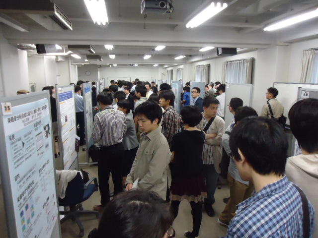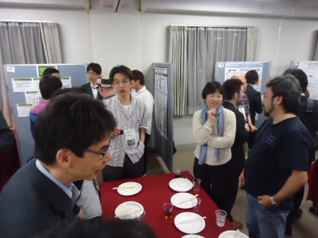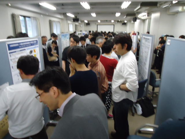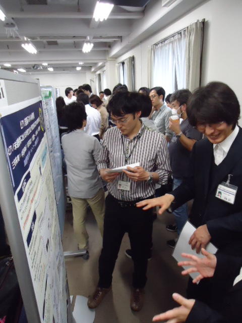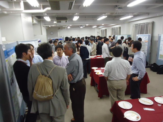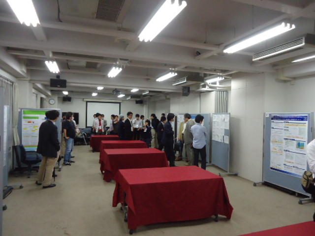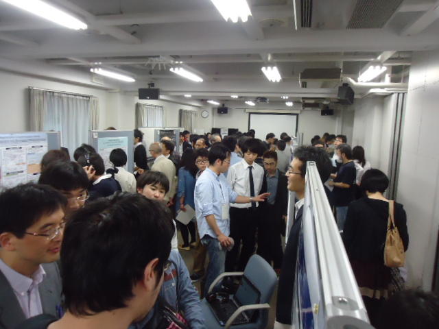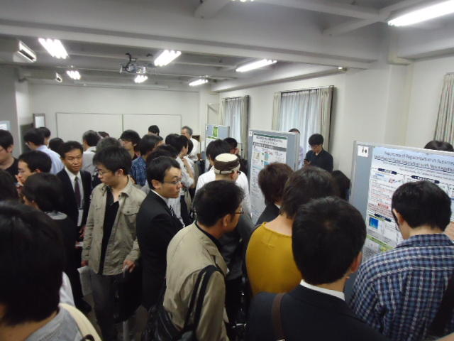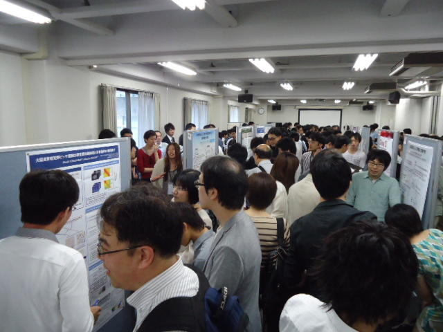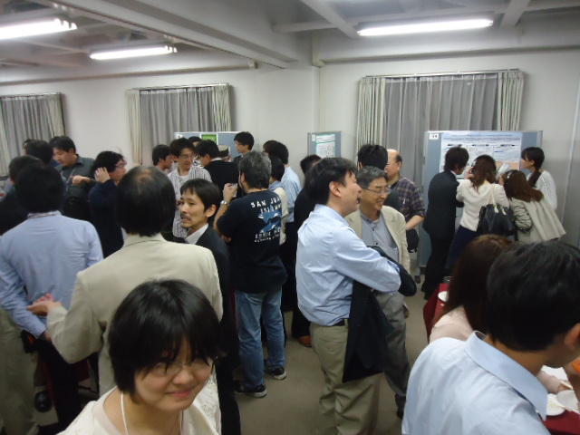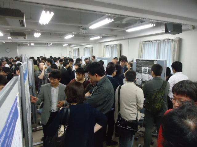初日のポスターセッションです。 このシンポジウムでは12人の招待講演をシングルトラックで全員が聞くために、一般発表は全てポスターとしました。