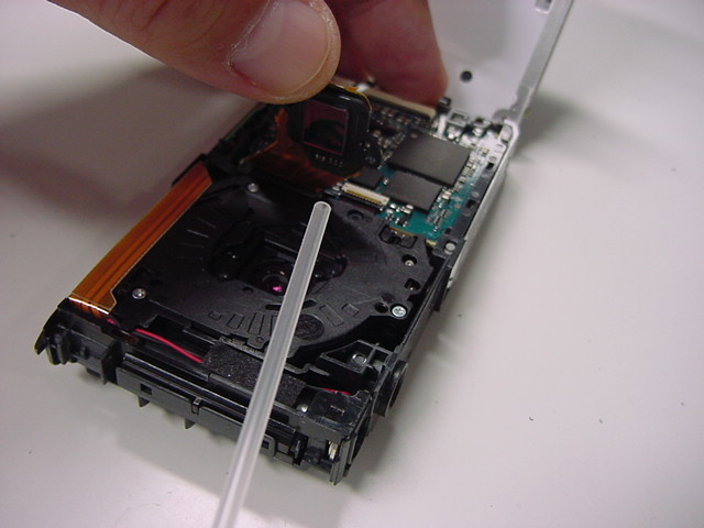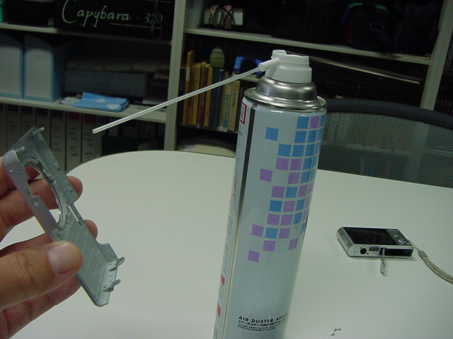 これをエアブローで吹き飛ばします。 このエアブローを、内部のレンズの内側とCCD撮像素子のところにかければいい筈です