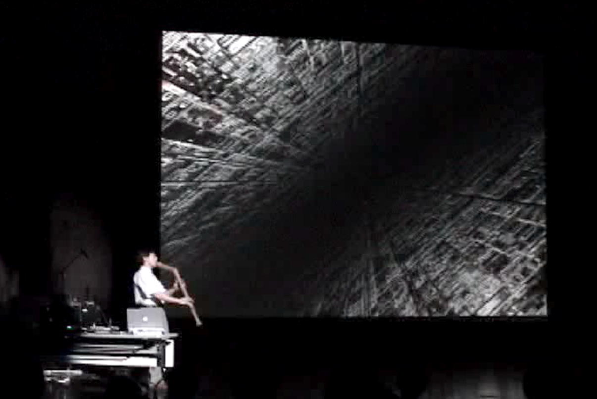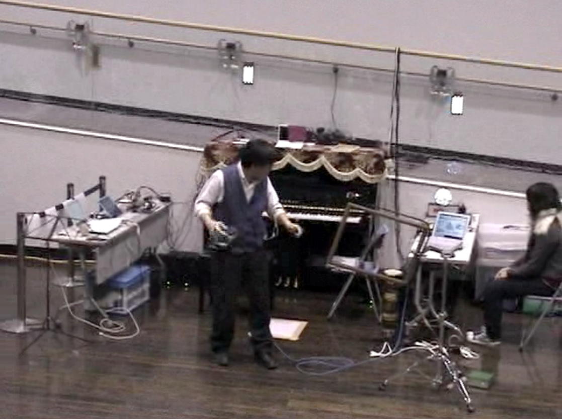 2008年12月20日、「メディアアートフェスティバル2008・フィジカル・コンピューティングワークショップ・ライブコンサート」(SUAC文化芸術センターホール)にて初演した作品です。SUACの文化芸術センターホールの正面にある巨大な壁面の全体を、重低音振動させてみたい、というのがモチベーションであり、残念ながら記録動画ではこの20-30Hz付近の重低音は伝わらないことをご容赦下さい。