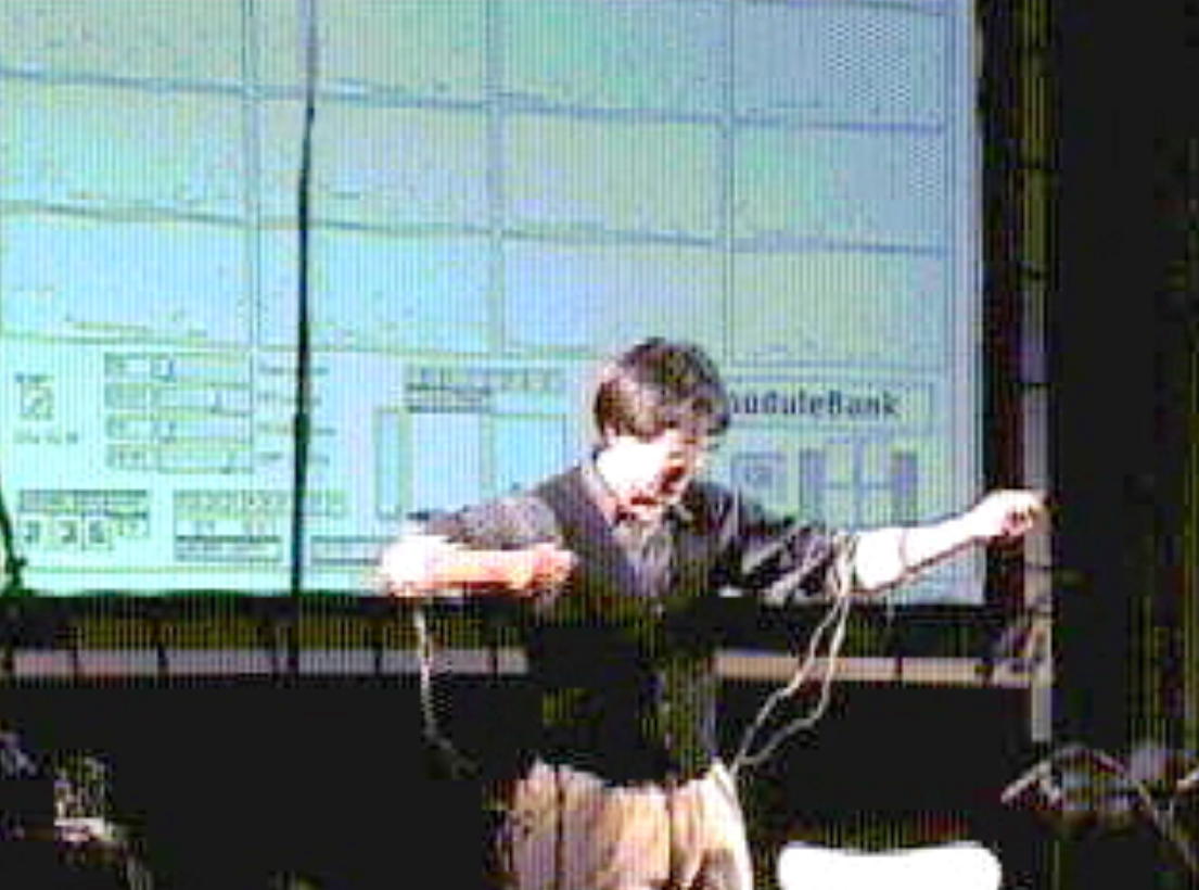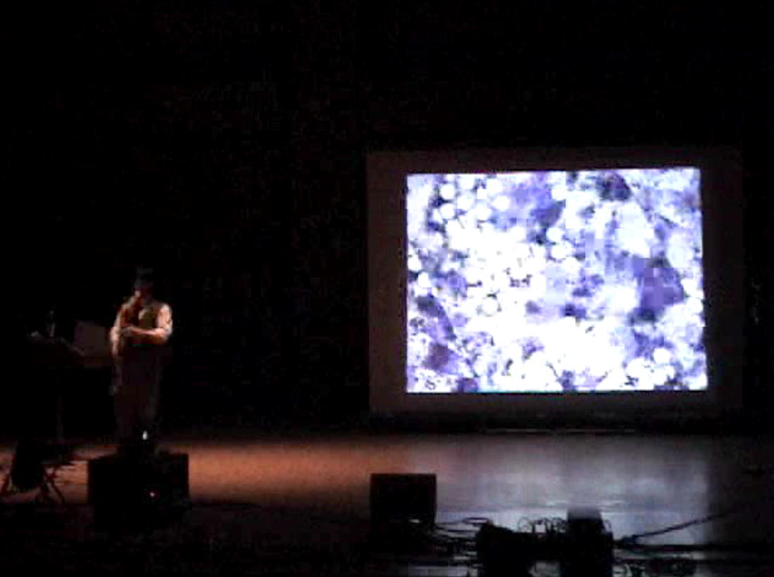 国際会議NIME2003に入選し、カナダ・モントリオールのMcGill大学Pollackホールで2003年5月24日に初演しました。前年に作曲/公演した作品「Berlin Power」と同じバスリコーダのサウンドをライプサンプリングした作品ですが、サウンドのライブプロセッシングにKymaでなくMax/MSPを、さらにグラフィクスのライブプロセッシングにRoland DV-7RでなくMax/jitterを用いて、さらにオリジナル筋電センサ「MiniBopMuse-III」を使用しており、コンピュータ技術と性能の進展がストレートに反映されています。グラフィック素材はコラボレータとしてデザイン学部技術造形学科2期生の小川裕己くん・鈴木力哉くんにより制作されました。ちなみにこの会議では、翌年の国際会議NIME2004をそれまでの欧州・北米以外で初めて、日本のSUACで開催するのでどうぞおいで下さい、と私が大会委員長として招聘スピーチを行いました。