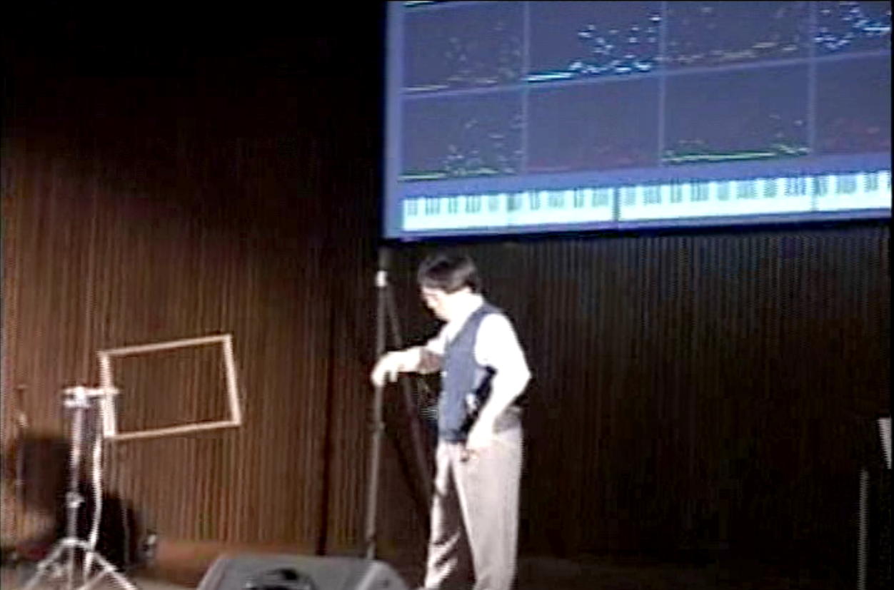 笙演奏家/作曲家の東野珠実さんと知り合って出来た作品"Visional Legend"(1998)は、笙のブレスを呼気と吸気の双方向で連続検出するセンサにより、Kymaでのリアルタイム音響信号処理とグラフィクスのライブスイッチングをコントロールしました。2001年の欧州ツアーではこれが"Visional Legend ver.2001"と改訂され、グラフィクス系がImage/ineにより全面的にディジタル化され、東野珠実さんの笙の演奏ムービーと静止画とが笙ブレスセンサによってライブに制御されました。グラフィック素材はコラボレータとしてデザイン学部技術造形学科1期生の大山真澄さん・加藤美咲さんにより制作されました。この動画は国際会議「Human Supervision and Control in Engineering and Music」の特別イベントとして企画された「Orchestraconcert of "Human Supervision and Control in Engineering and Music"」において、ドイツ・Kasselのホール「Stadthalle Kassel」において2001年9月22日に公演された模様の記録です。