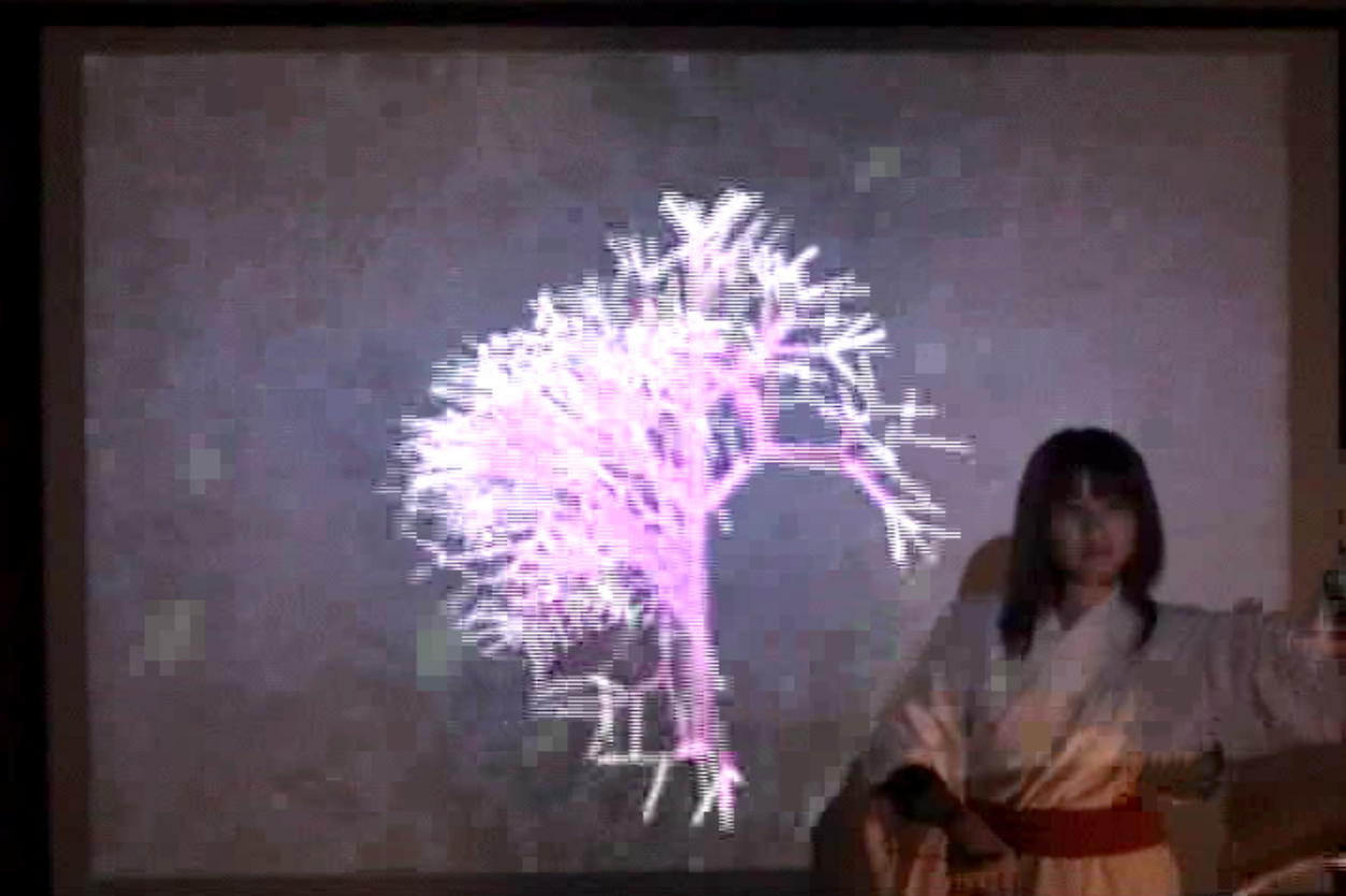インターカレッジコンサート2005の特別企画「師匠の背中」コンサートとして、2005年12月25日「アルゴリズムとからだ展・コンサート」(大垣市情報工房ホール)にて初演。きっかけは、この年に採択されたIPA「未踏」で知り合った、東大・院生の井尻敬さんが制作しているリアルタイムCG生成システム「L-System3D」を音楽パフォーマンスから駆動して、パフォーマーの身体動作で木が成長・振動する、というコンセプトです。パフォーマンスはデザイン学部空間造形学科5期生の稲垣理恵さんが担当、グラフィック素材はコラボレータとしてデザイン学部技術造形学科6期生の持塚亜美さんにより制作されました。