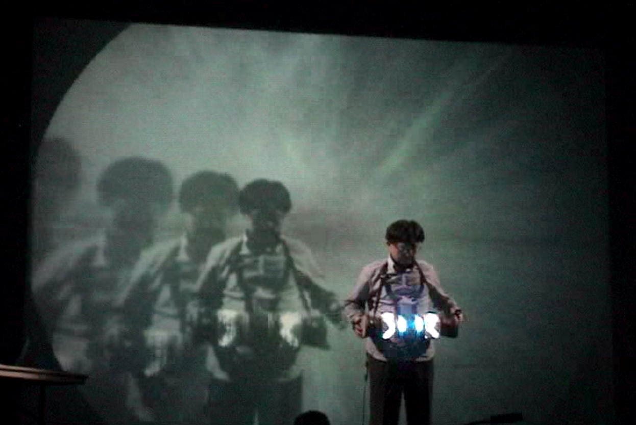 「楽器が光ってもいいじゃないか」というコンセプトで開発した新楽器「Cyber Kendang」を用いた作品で、国際会議NIME2007に入選して、2007年6月9日にニューヨーク大学ホールで公演した作品です。画像認識センサのレイテンシ(時間的遅れ)がPercussiveなパフォーマンスに付いて行けないために、両手に加速度センサを使用して衝撃を検出し、パフォーマンス最後のカットオフは、ニューヨークまで同行したゼミ学生が手作業で電源を落としました。
