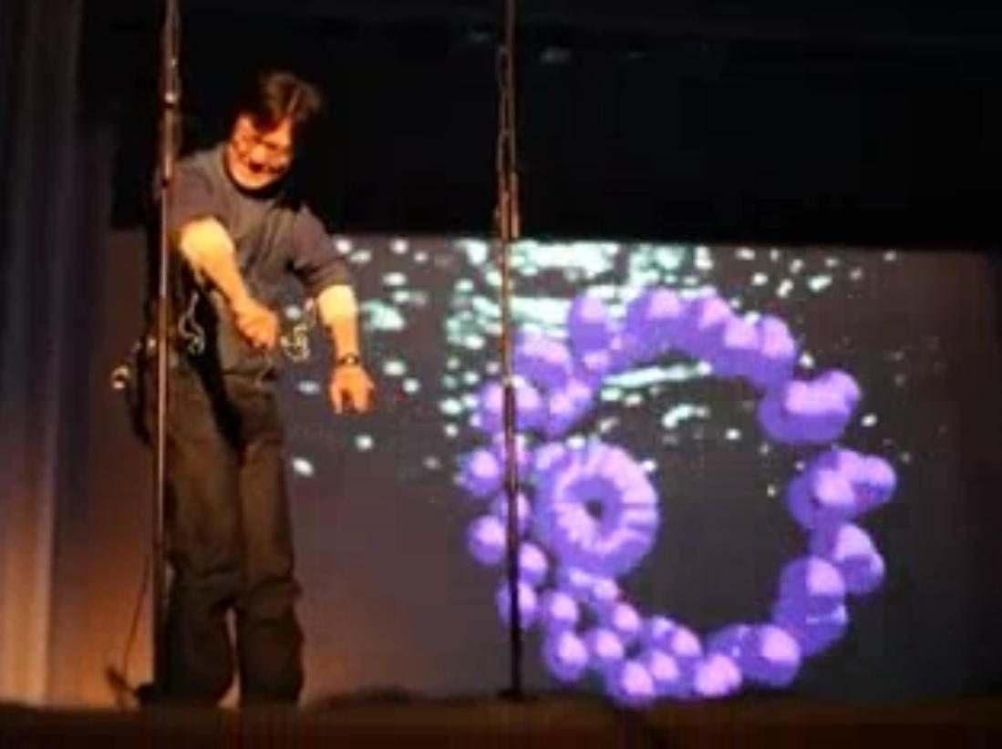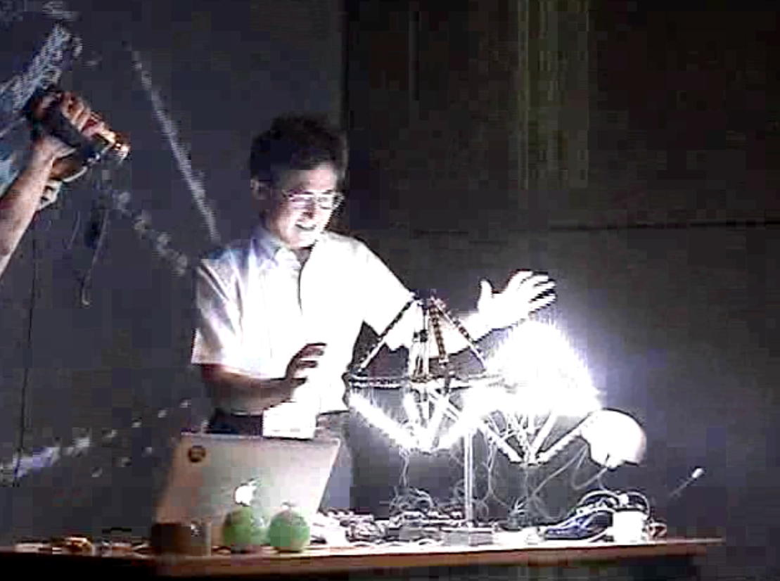 「マルチチャンネル・テルミン」を意識した、「触らない楽器」シリーズの第1弾として、2009年12月5日にインターカレッジ2009の特別コンサートのために作曲・公演(国立音大)し、さらに翌年の2010年9月25日に「Make Ogaki Meeting・ライブコンサート」(ソフトピアジャパン)でも再演した作品です。8チャンネルの赤外線距離センサの付いたリングを2重に配置し、さらにテーブルには右手・左手それぞれに各8個の超高輝度青色LEDを配置して、掌で反射させて「空中モミモミ」する新楽器“Peller-Min”でサウンドを生成しました。真っ暗なステージ上で私の顔だけが超高輝度青色LEDに照らされる、というのも計算したステージ効果です。