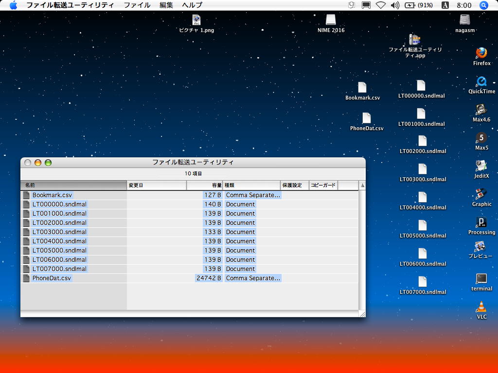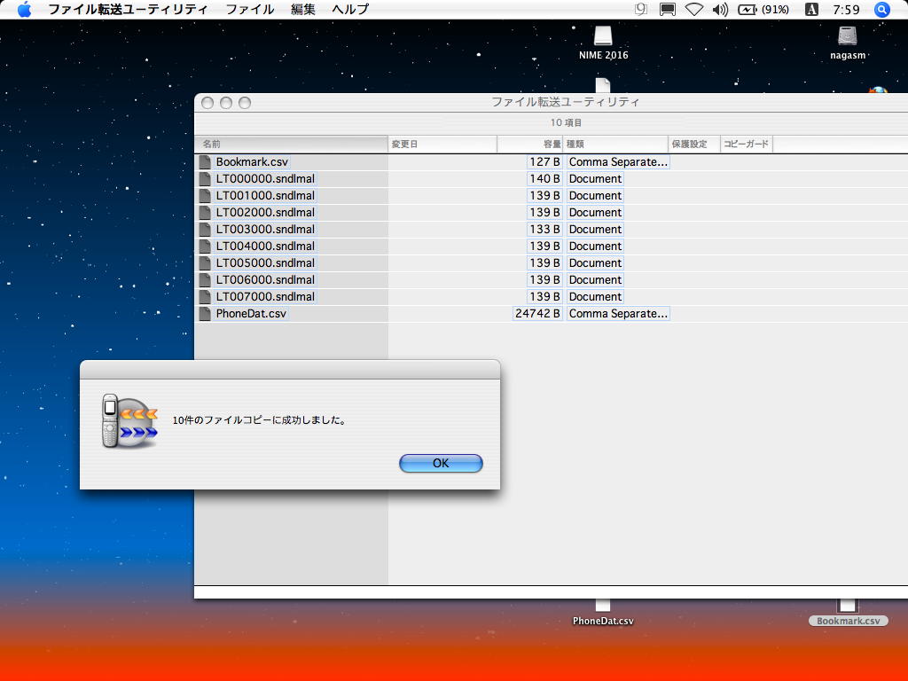 ショップでは電話帳を転送できないというので、ネットで探してメーカのJRCのページに行き、古いMac専用のデータ転送アプリを落として接続して、以下のように唯一のデータである「電話帳」をレスキューする事に成功しました。