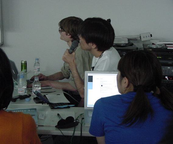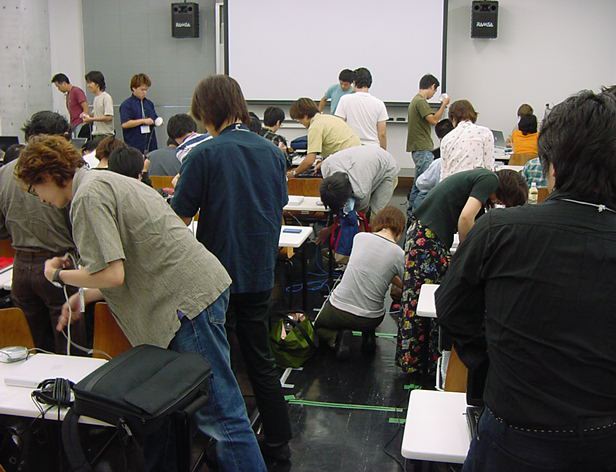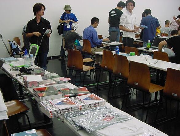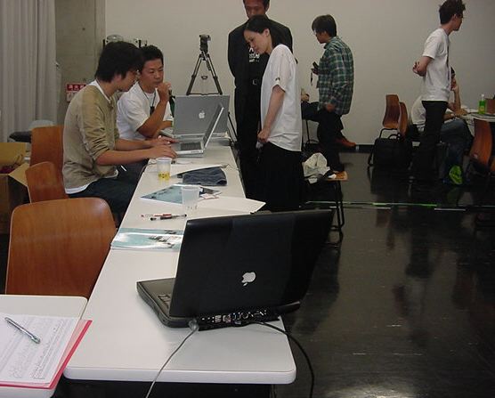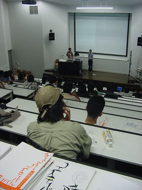 MAF2002のライブComputer Musicコンサートでは2夜にわたって、「由雄正恒」・「平野砂峰旅 」・「長嶋洋一」・「佐近田展康」・「赤松正行」・「三輪眞弘」・「東野珠実」・「後藤英」・「Joshua Kit Clayton(←jitterを使った作品の世界初演)」などのどこかで見かけた名前の作家の作品が公演され、MAF2002のインスタレーション・ギャラリーでは10日間にわたって、「勝田哲司」・「松村誠一郎」・「中居伊織」・「赤松正行」などのどこかで見かけた名前の作家の作品が展示されました。 以下、手元に残った写真などの資料を再録します。 16年前の若々しい顔とMaxコミュニティの熱気をご堪能下さい。(敬称略)