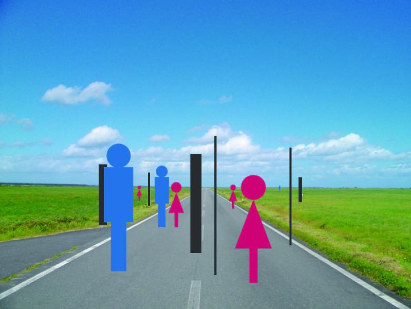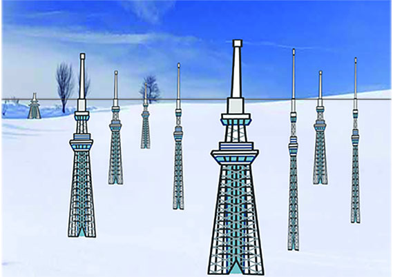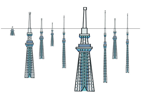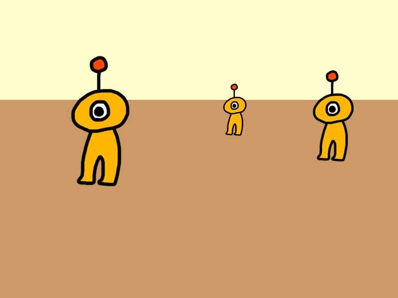 ※ この画像は「プチ課題の条件を満たしていないので遠近法が見えない」というサンプル (指定の水平線が入っておらず、背景画像の地平線はこの見えない水平線と上下がズレている)