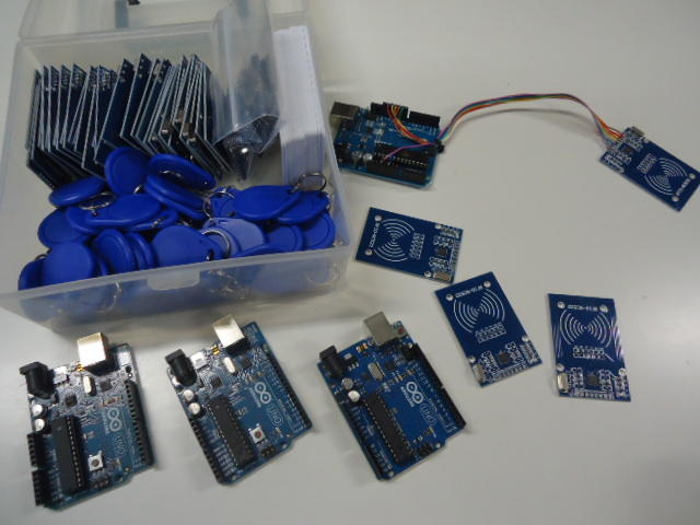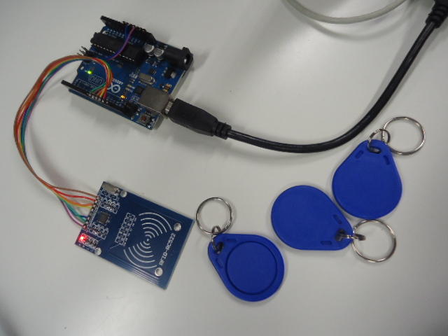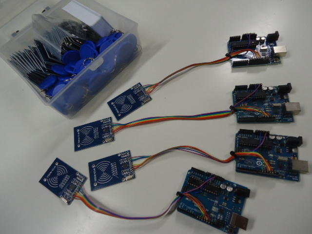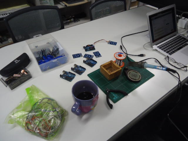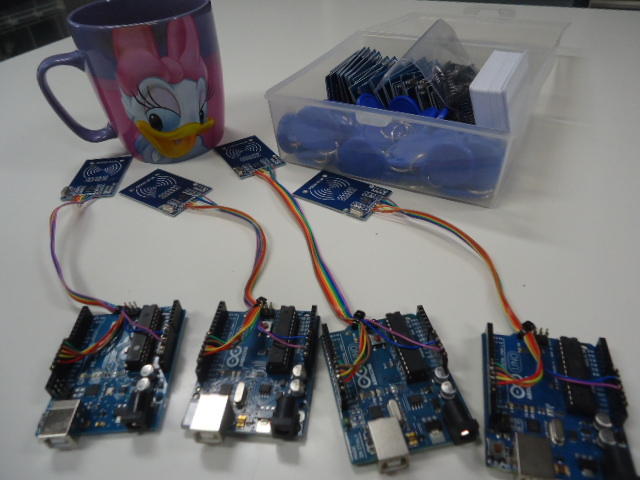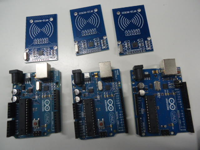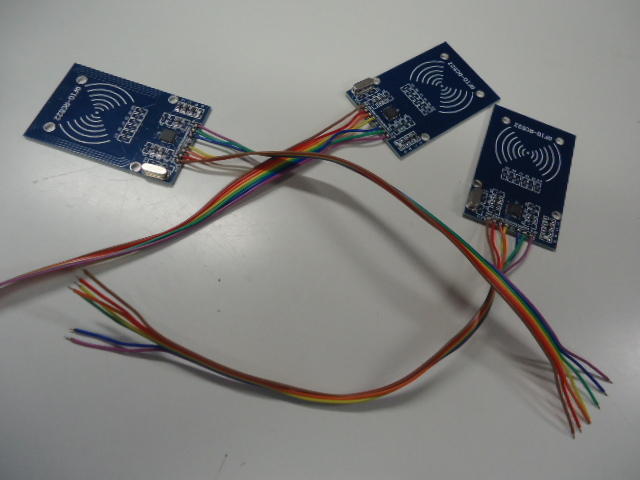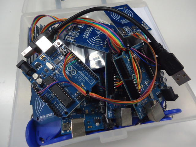 ゼミ・高木さんのインスタレーション作品に向けて新しく作ったRFIDリーダを、実験が快調に進んで今後いろいろな作品に応用できそうになったので、3台ほど増設(量産)してみました。 既に稼働しているものをコピーするだけなので、作業時間は全部で40分ほどでした。