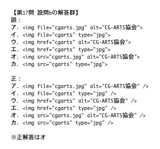 CG-ARTS協会 検定実施センターです。 2014年7月13日(日)に実施しました 「Webデザイナー検定 ベーシック」において、 次の通り解答群の内容に不備が判明致しました。 【第16問 設問dの解答群ウ】 誤:JavaScriptでDOMを操作するためのAPIにアクセスすることにより, ページを動的に書き換えられる. 正:JavaScriptでHTMLの要素を操作するためのAPIであるDOMを用いることにより, ページを動的に書き換えられる.本件に関しましては、Webデザイナー教育推進委員会における審議の結果、 次のような措置を取ることに決定いたしました。 第16問設問d、第17問設問bについては、受験者全員を正解として合否判定をする なお、本件につきましては、協会Webサイトにてご報告させて頂いております。 受験者や関係者の皆様にご迷惑をお掛けしましたことをお詫び申し上げます。