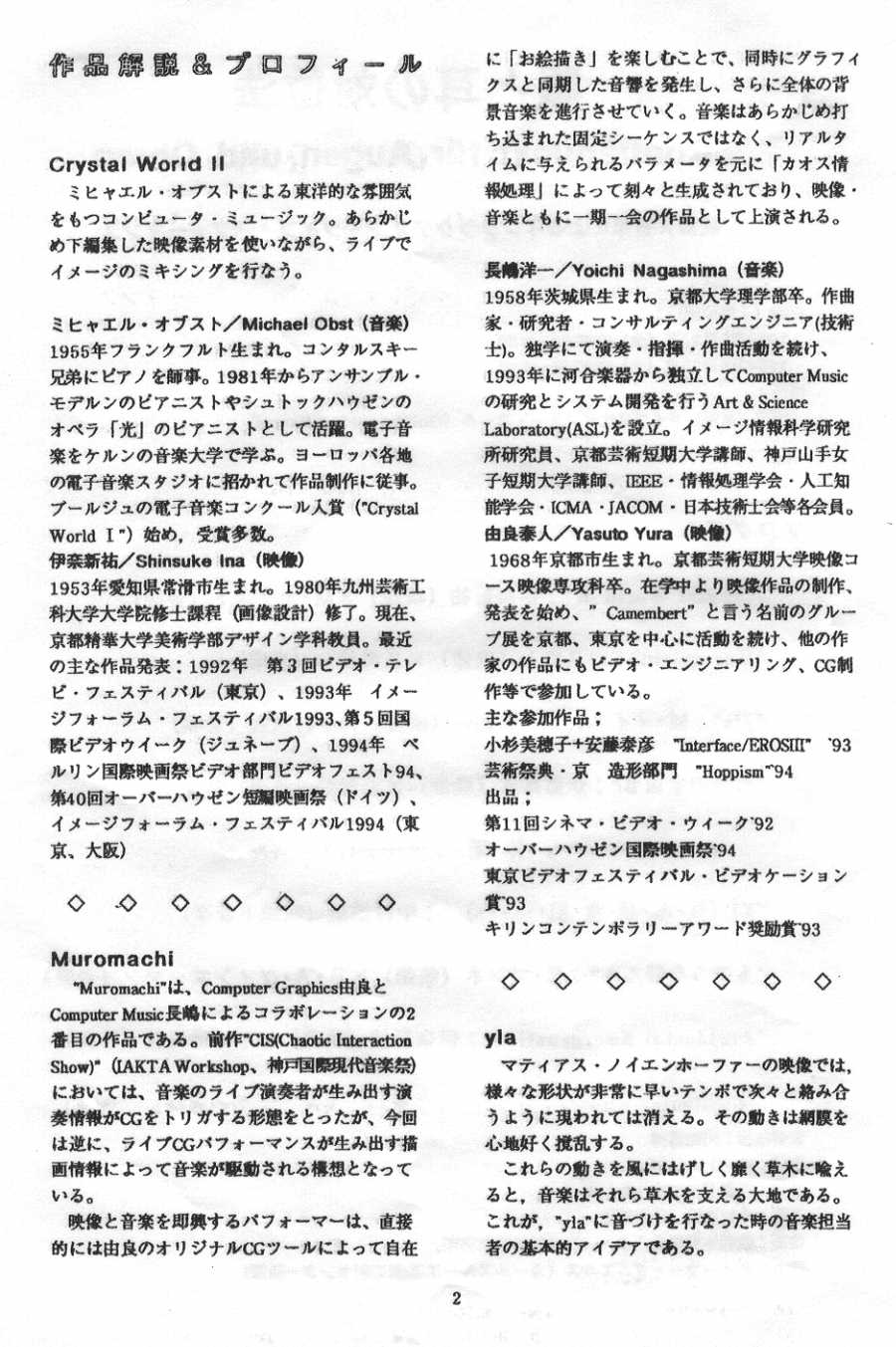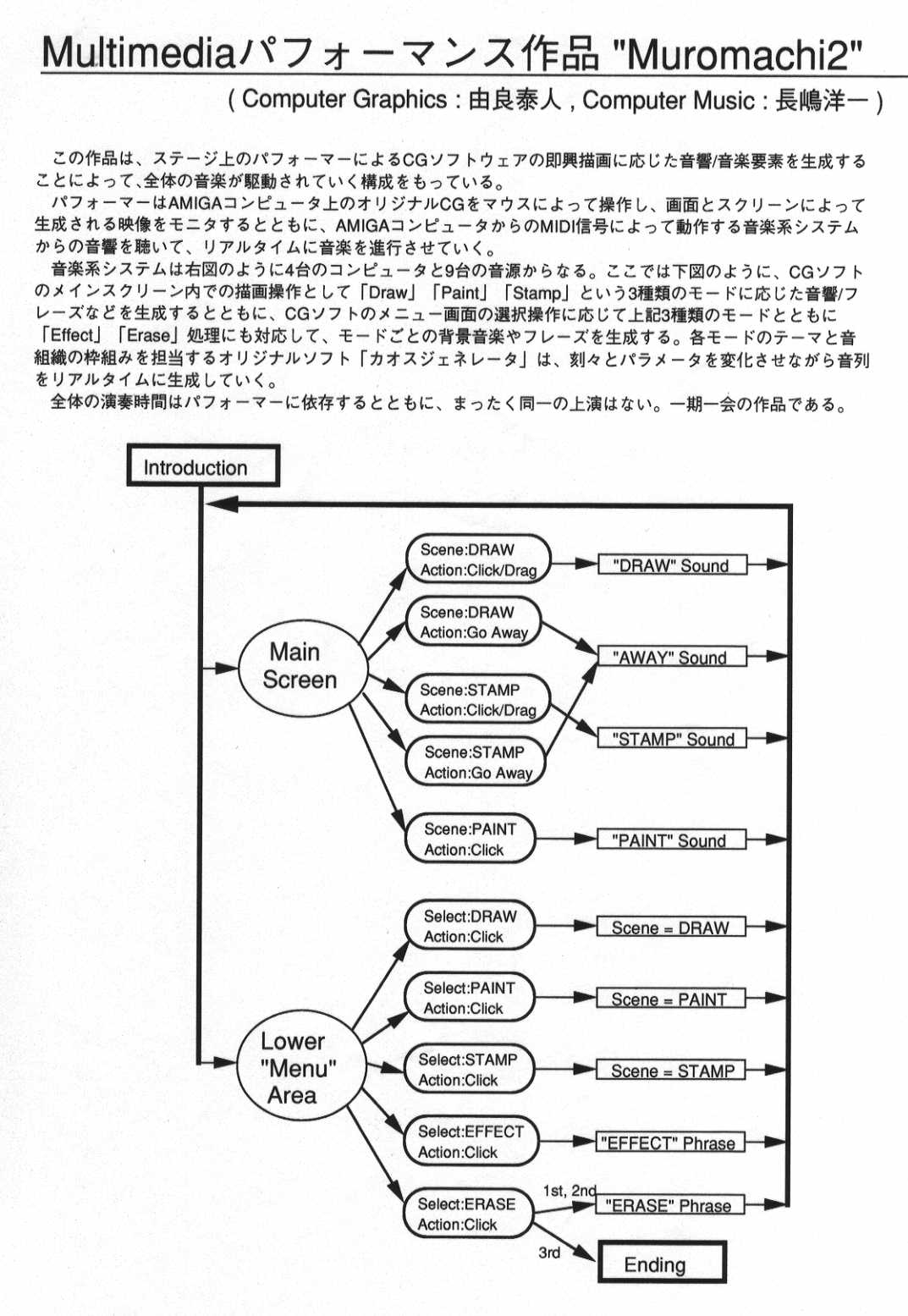 - コンピュータ音楽作品"Muromachi2"、作曲1994年、 1994年11月6日 『コンピュータ音楽の現在・ワークショップ』 (神戸・ジーベックホール、パフォーマンス : 鈴木朝子、CG : 由良泰人) ★ ★ ★ ★ YouTube