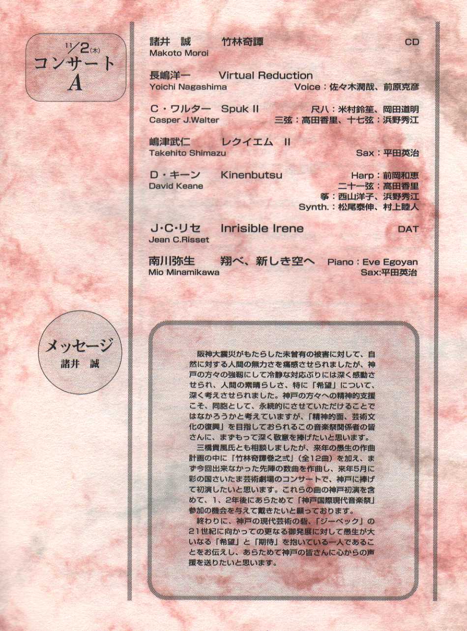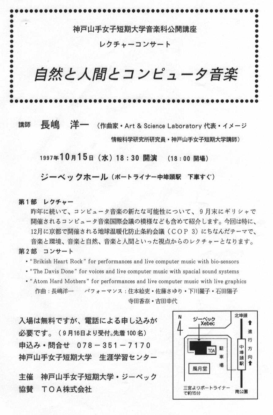 - 1997年 「神戸山手女子短期大学公開講演会・コンサート」で初演した作品"Brikish Heart Rock"のシステム開発(神戸・ジーベックホール) ★ ★ ★
