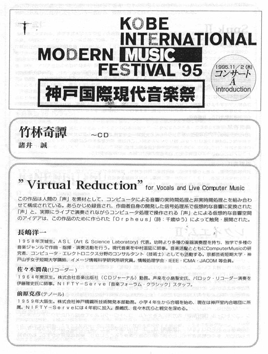 - コンピュータ音楽作品"Virtual Reduction"、作曲1995年、 1995年11月2日『神戸国際現代音楽祭 1995』 (神戸・ジーベックホール、詩 : 千歳ゆう、Voca l: 佐々木潤哉、前原克彦、指揮 : 長嶋洋一) ★ ★ ★ ★ YouTube