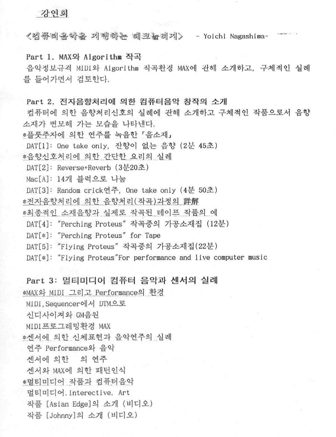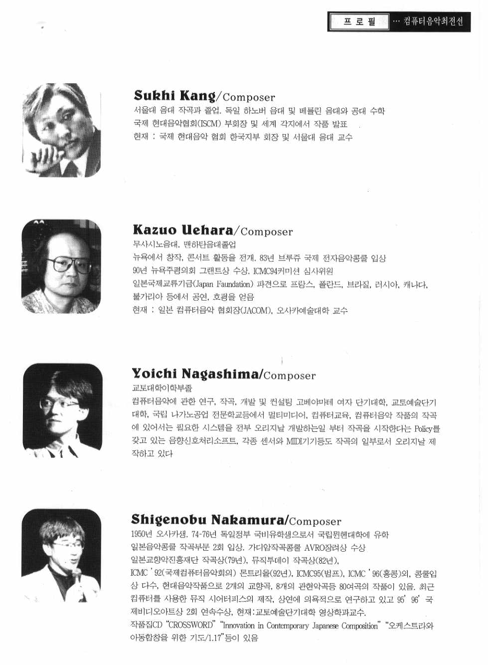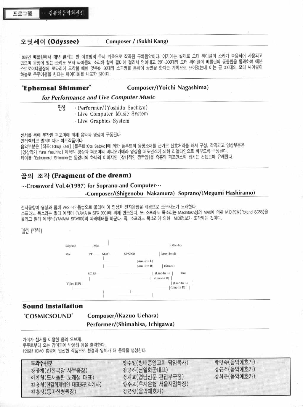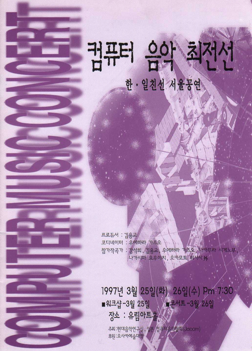- 1997年 「[コンピュータ音楽最前線]韓日友好・ソウル公演 日本コンピュータ音楽協会コンサート」で初演した"Ephemeral Shimmer"のシステム開発(ソウル・YURIMホール) ★ ★