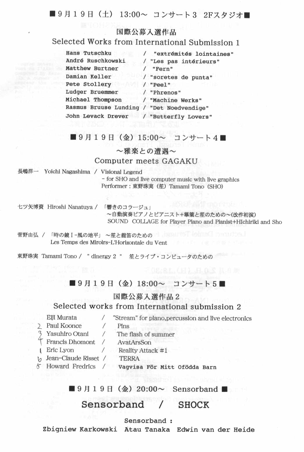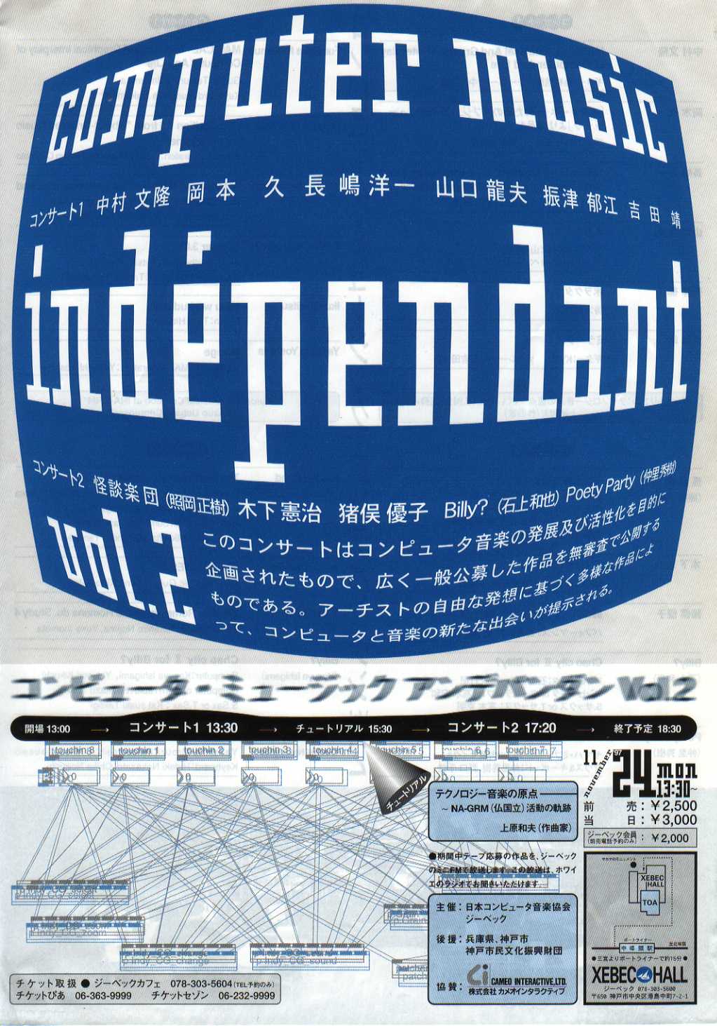 - 1997年 「コンピュータミュージック・アンデパンダン・コンサート」で初演した作品"天にも昇る寒さです"、"Atom Hard Mothers"のシステム開発(神戸・ジーベックホール) ★ ★