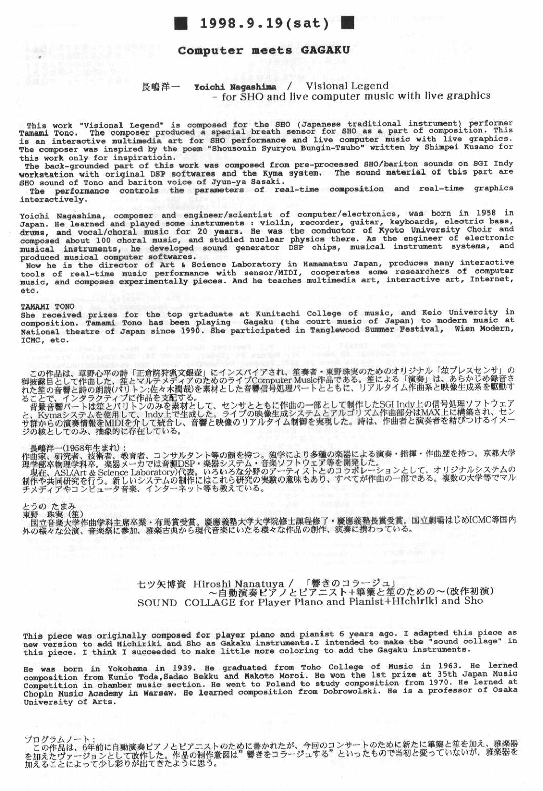 - コンピュータ音楽作品"Visional Legend"、作曲1998年、 1998年10月19日『International Computer Music Festival』 (神戸・ジーベックホール、パフォーマンス : 東野珠実) ★ ★ ★ ★ ★ YouTube