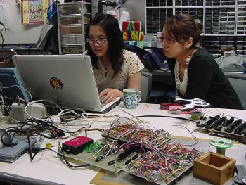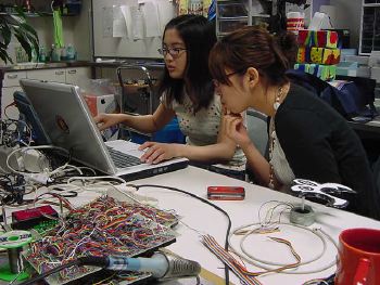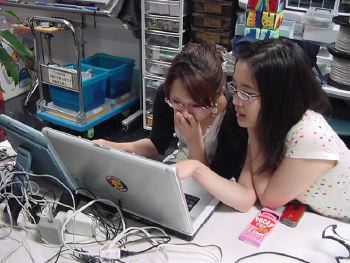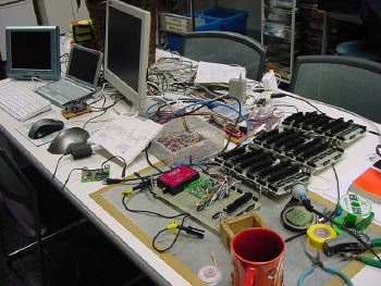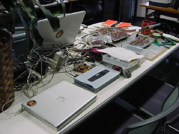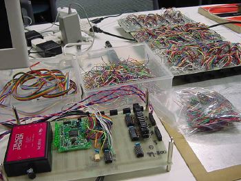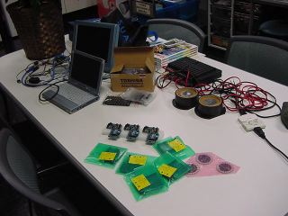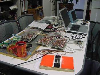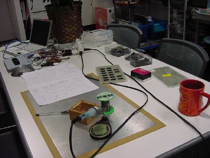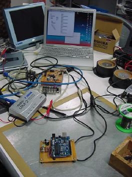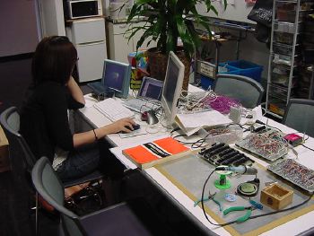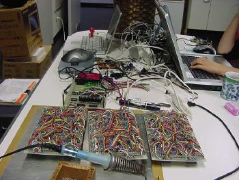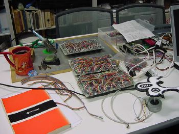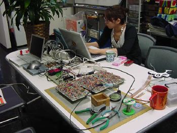 会議に半分だけ出席したりしたので、ここまでで本日の作業は時間切れとなった。 ここ にも鈴木絢が写っているが、さすが技術造形学科でハンダ付けを仕込んだだけのことはある、 なかなか使いやすいリード線を量産してくれたので、 ここからの作業は快調に進む予感がした。