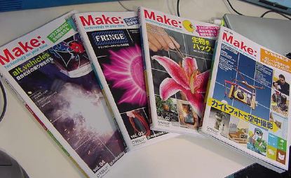 考えてみれば、Propellerは+3.3V電源だけれど、Arduinoの電源はUSBから取るので+5Vらしい、 というぐらい、まったくArduinoの詳細について知らないまま、回路図も見ずに動かしていたことに気付いた。 それから、「Arduino」って、なんて発音するんだろう。 Propellerを「ぷ」としたのと同様に、「あ」でArduinoを辞書登録してしまったので、 まったく脳内で発音したことのない名称である。「アルドゥイノ」???発注するのに調べたサイトで、MAKEという雑誌の4号に、GAINERの小林さんがArduinoについての解説記事を書いている、 とあったので、たまたま先週届いた、MAKEのvol.2からvol.4までをまず、ザッと眺めることにした。