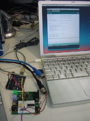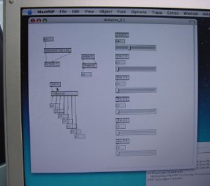 int old_data = 0; int new_data = 0; void setup() // run once, when the sketch starts { Serial.begin(31250); } void loop() // run over and over again { new_data = analogRead(0) / 8; if ( new_data != old_data ) { midiOut(0xb0, 0, new_data); old_data = new_data; } } void midiOut(char cmd, char data1, char data2) { Serial.print(cmd, BYTE); Serial.print(data1, BYTE); Serial.print(data2, BYTE); }すると、ボリュームをかなりグルグルと回転させても、綺麗にMIDIデータが送られて、 受けるMaxのスライダーがスムースに動いた。 とりあえず、これでMIDI送信の機能については、単独では合格、としよう。